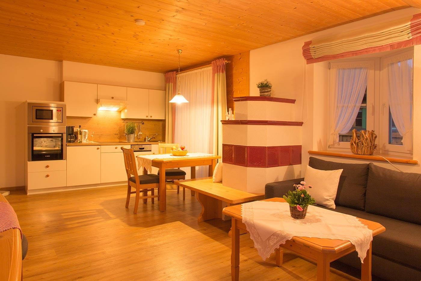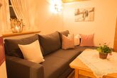 52 m², für 1 - 2 Personen, Schlafzimmer mit Doppelbett (Kinderbett kann dazugestellt werden), Wohnraum mit Kachelofen und Ofenbank, gemütliche Couchgarnitur Essecke, sehr gut ausgestattete Küchenzeile (Ceranfeld, Kühlschrank mit ***Gefrierfach, Backofen, Mikrowelle, Spülmaschine), LED-TV, Radio-CD, Ostbalkon mit Möblierung.