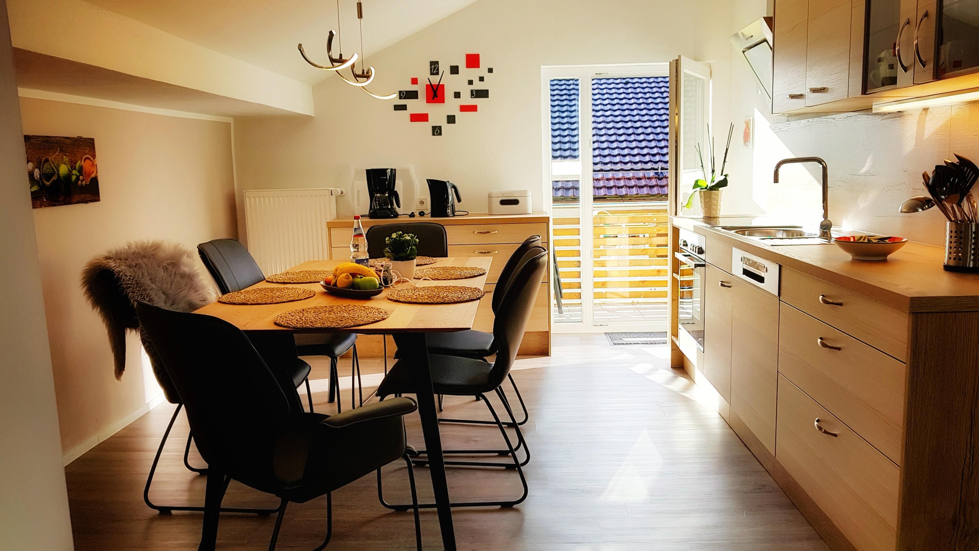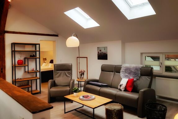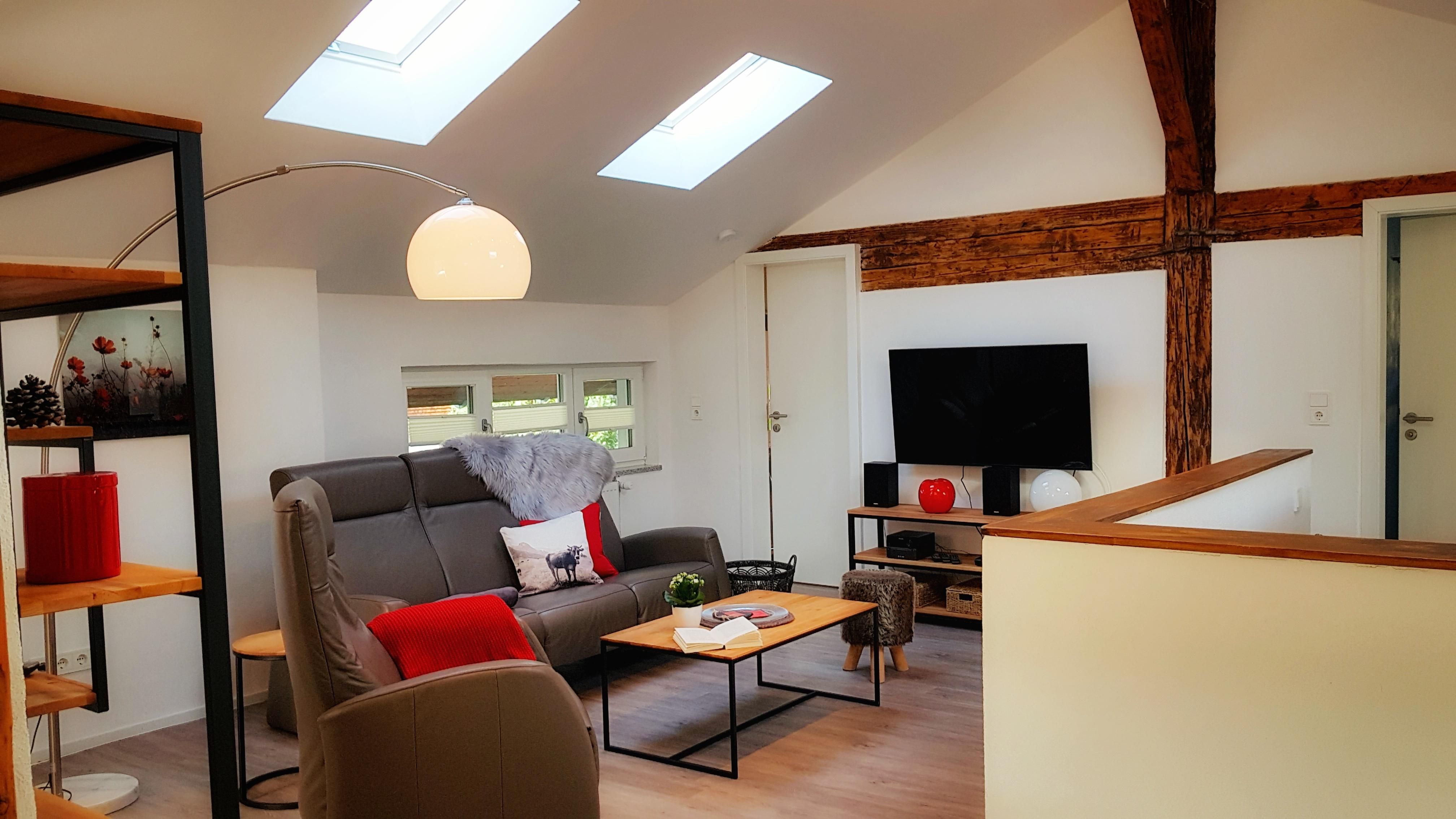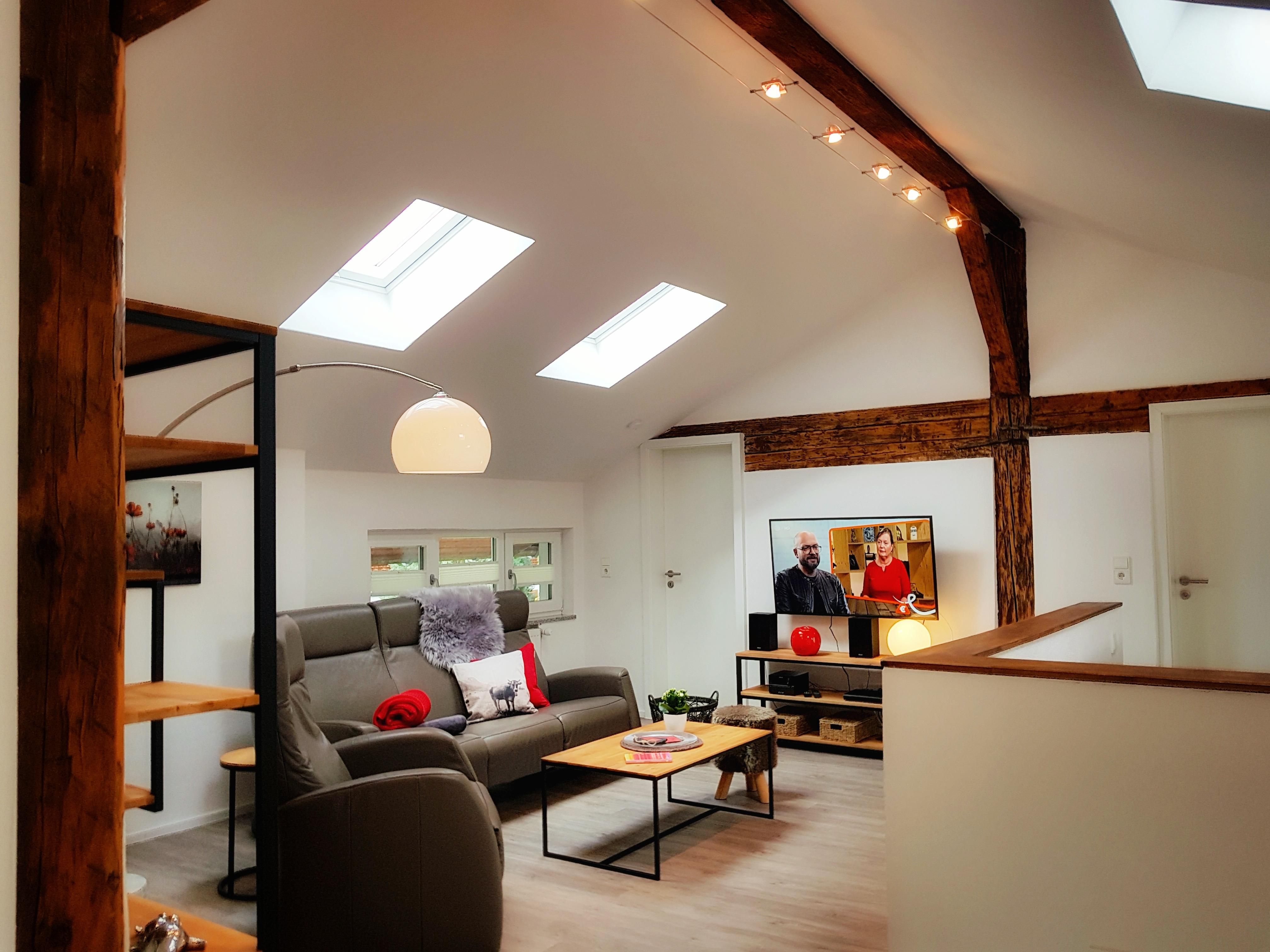 Helle loftähnliche Großraum Wohnung mit einem offenen Dachstuhl ist durch eine separate Treppe zu erreichen. Wohnzimmer mit Polstereckgarnitur und Leseecke. Großzügige Küche mit Sitzgelegenheit. Schlafzimmer mit hochwertigen Boxspringbett, weiteres Schlafzimmer besteht aus zwei Boxsringbetten sowie Verdunklungsrollo.Alle Fenster und Türen sind mit Plissee Faltenstore und einem Fliegengitter versehen. Bad mit Doppelwaschbecken und begehbare Dusche. Kindersicherungen in allen Steckdosen. Süd - Balkon.