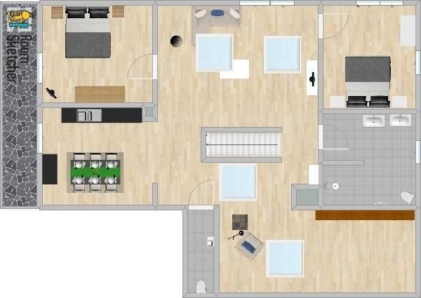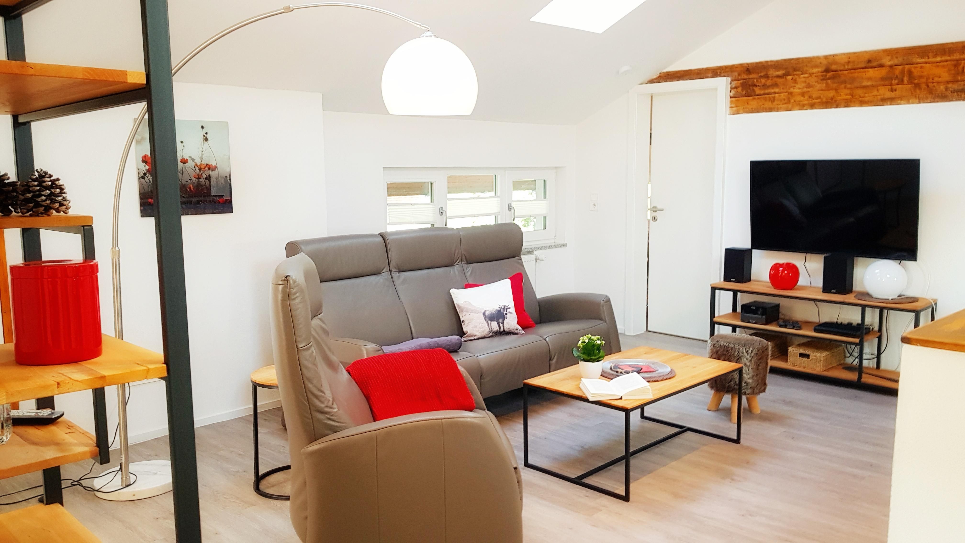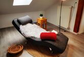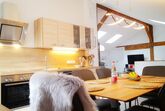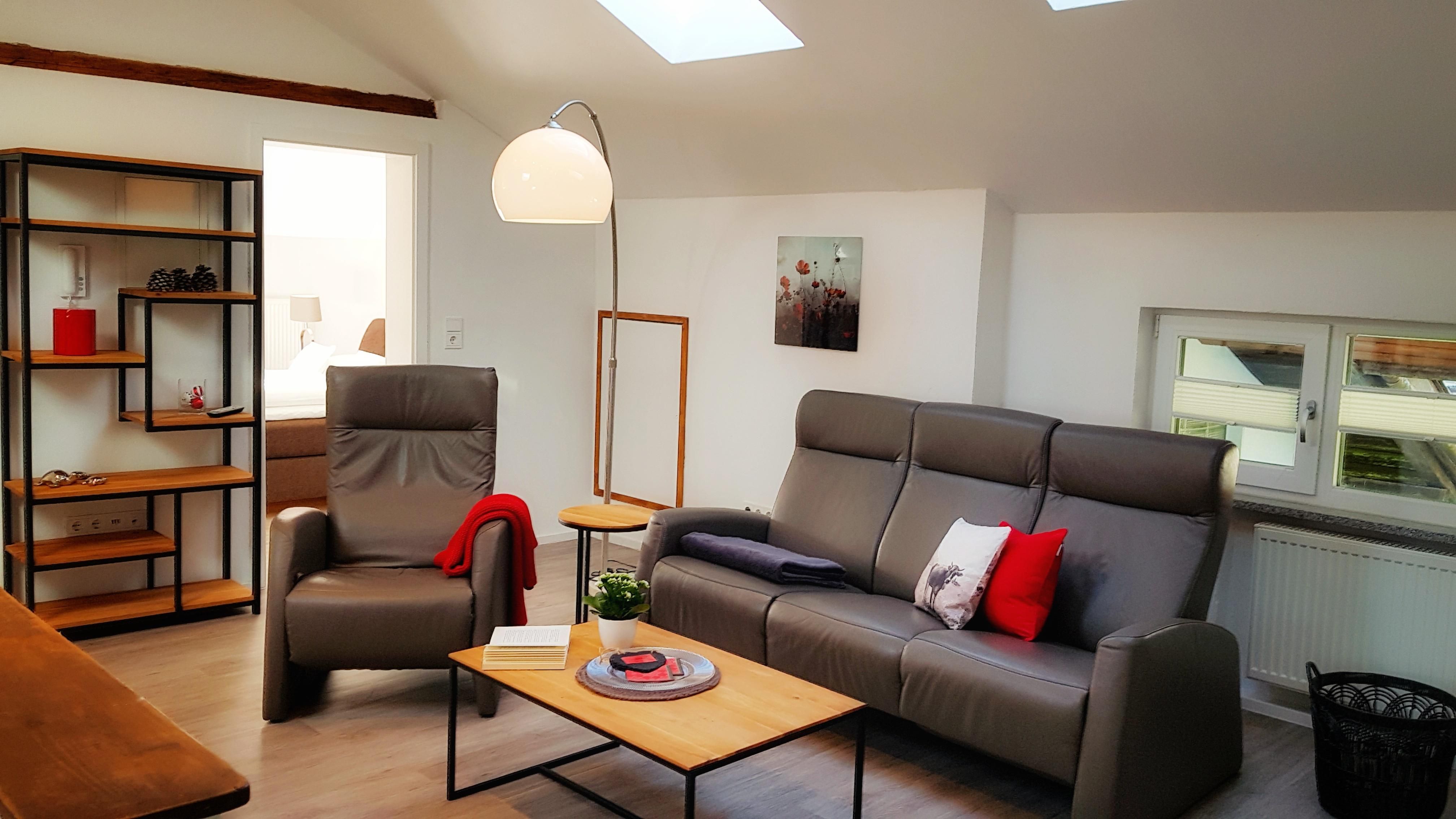 Helle loftähnliche Großraum Wohnung mit einem offenen Dachstuhl ist durch eine separate Treppe zu erreichen. Wohnzimmer mit Polstereckgarnitur und Leseecke. Großzügige Küche mit Sitzgelegenheit. Schlafzimmer mit hochwertigen Boxspringbett, weiteres Schlafzimmer besteht aus zwei Boxsringbetten sowie Verdunklungsrollo.Alle Fenster und Türen sind mit Plissee Faltenstore und einem Fliegengitter versehen. Bad mit Doppelwaschbecken und begehbare Dusche. Kindersicherungen in allen Steckdosen. Süd - Balkon.