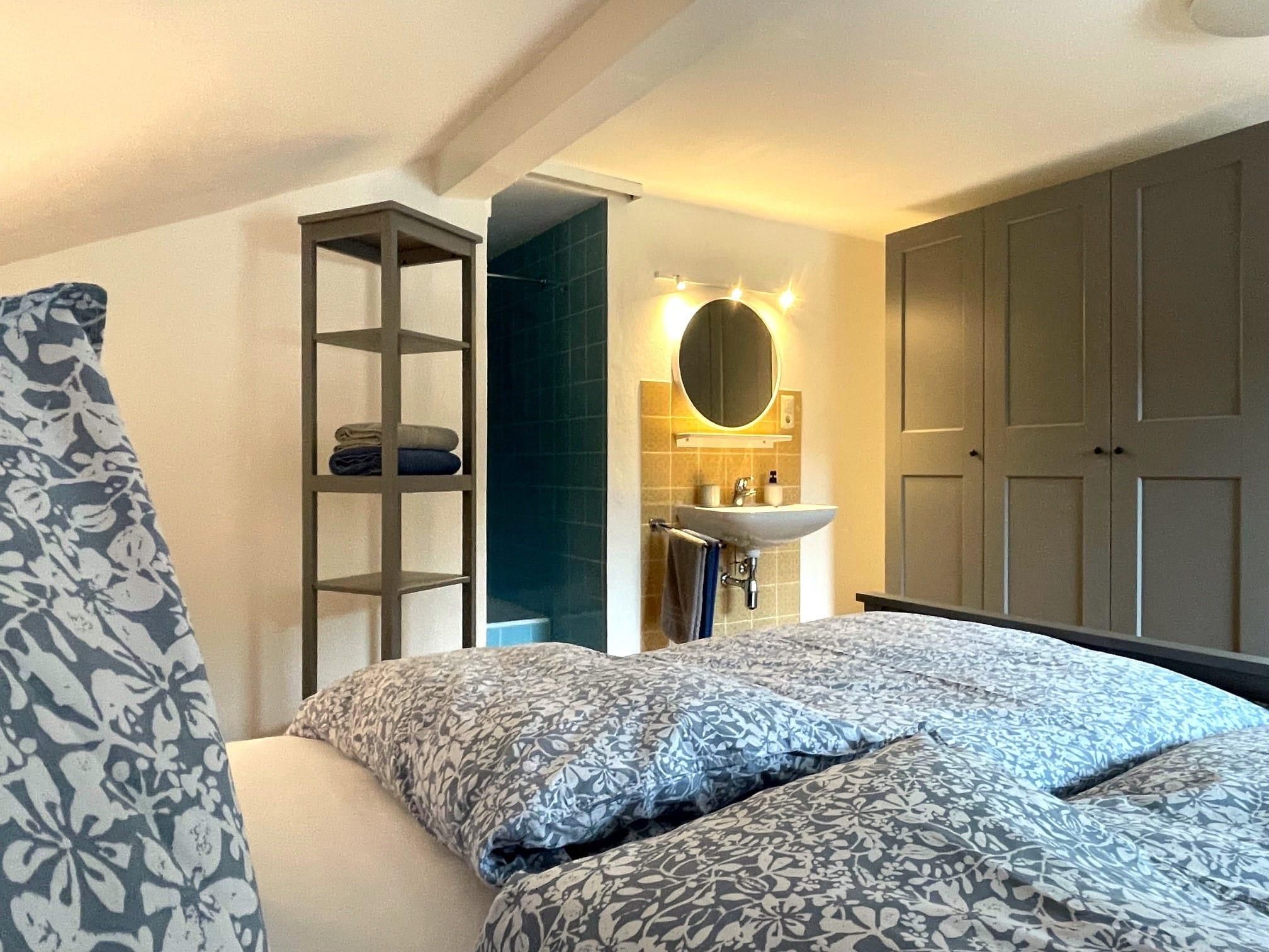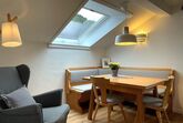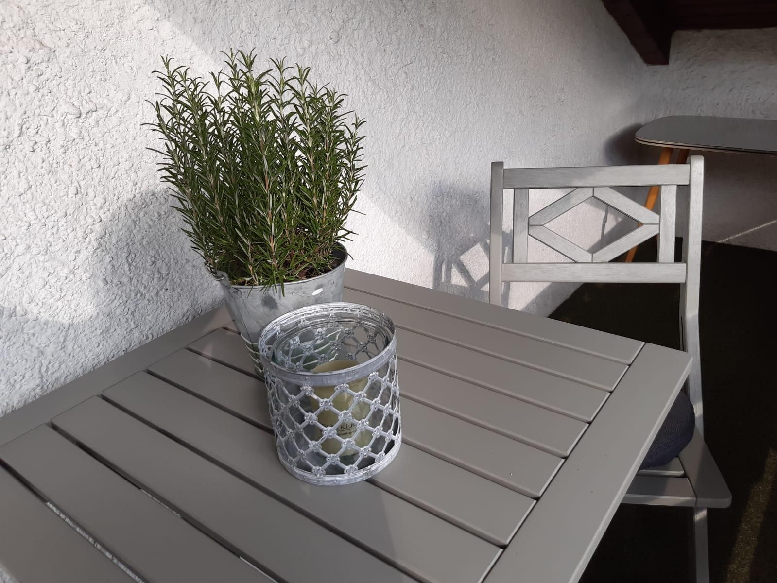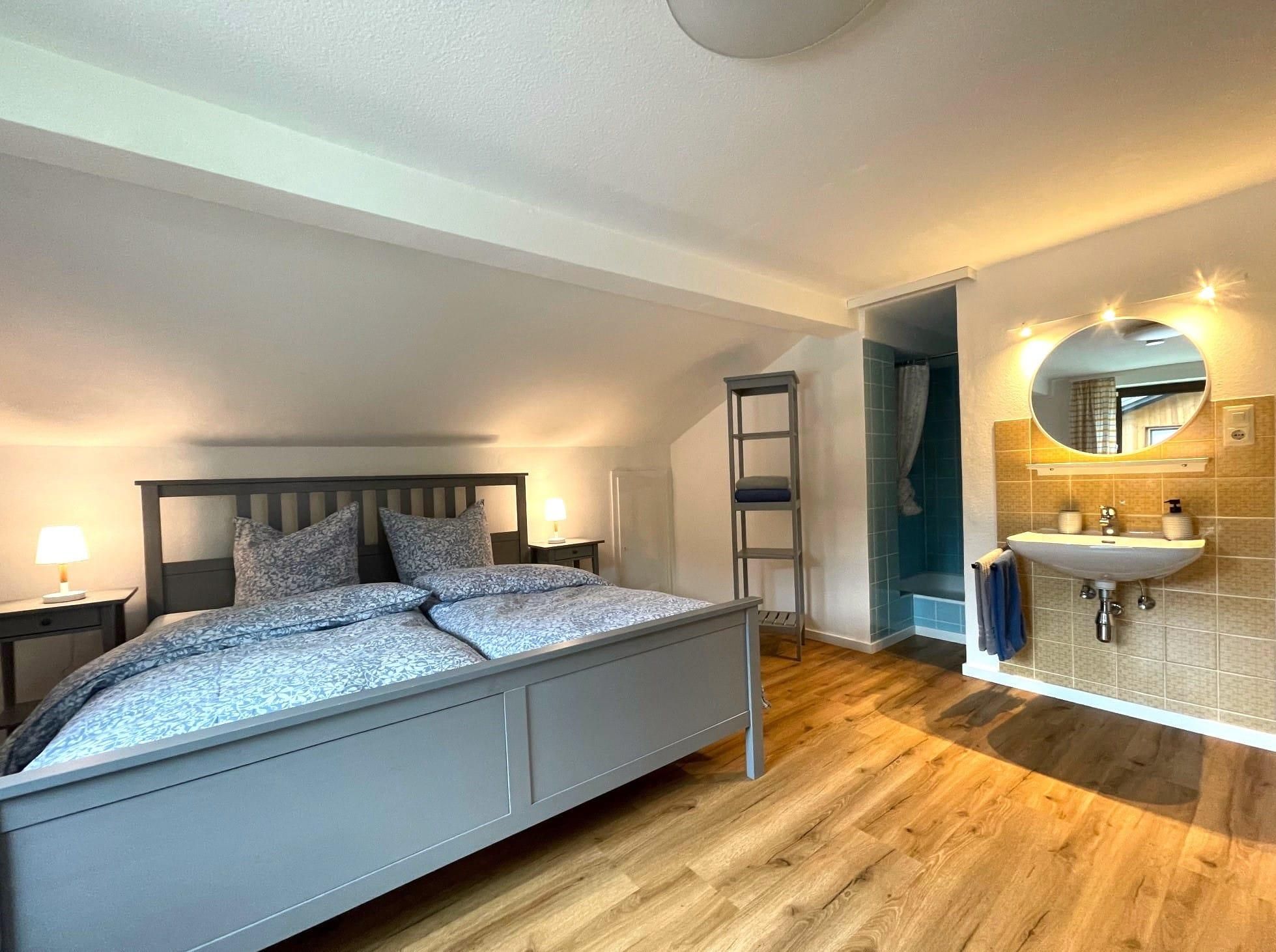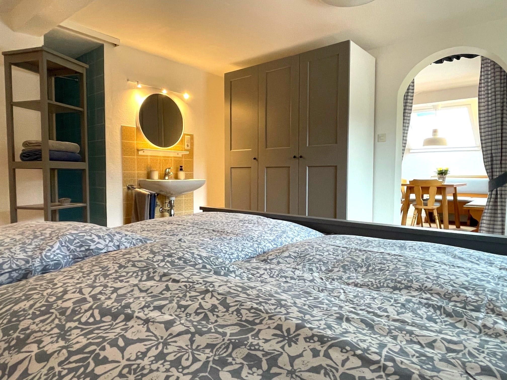 Kleine, feine Ferienwohnung für 1-2 Personen mit überdachtem Balkon. Großes Schlafzimmer (ca. 18 qm) mit Doppelbett sowie integrierter Waschmöglichkeit und Dusche, das WC ist separat. Kochnische für Selbstversorger mit Essecke.
