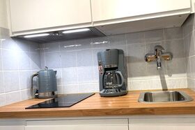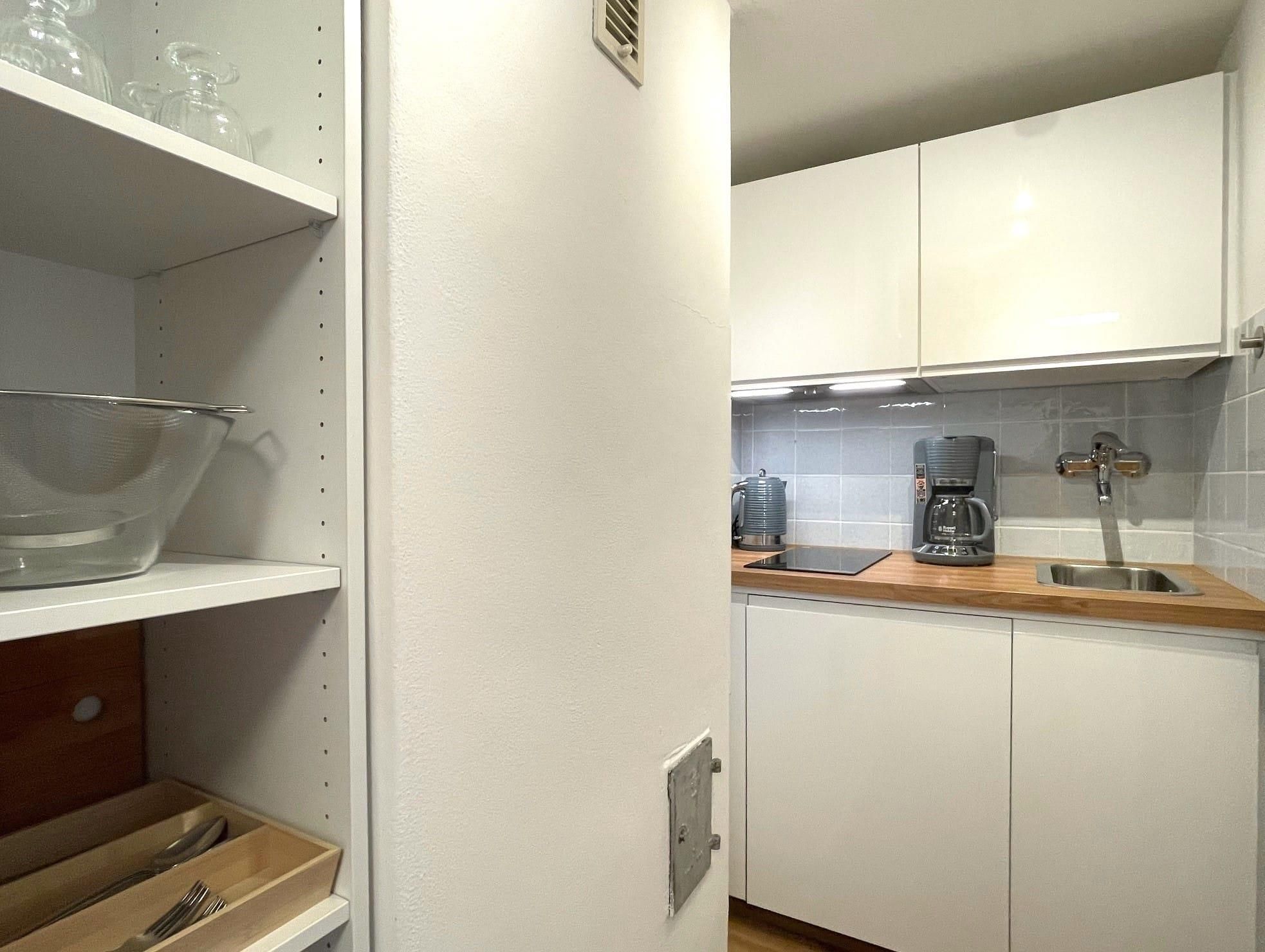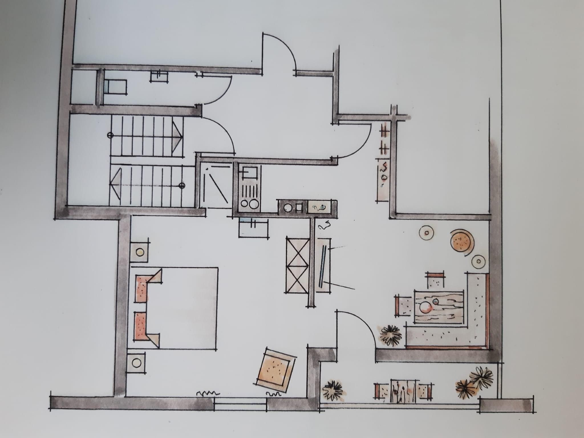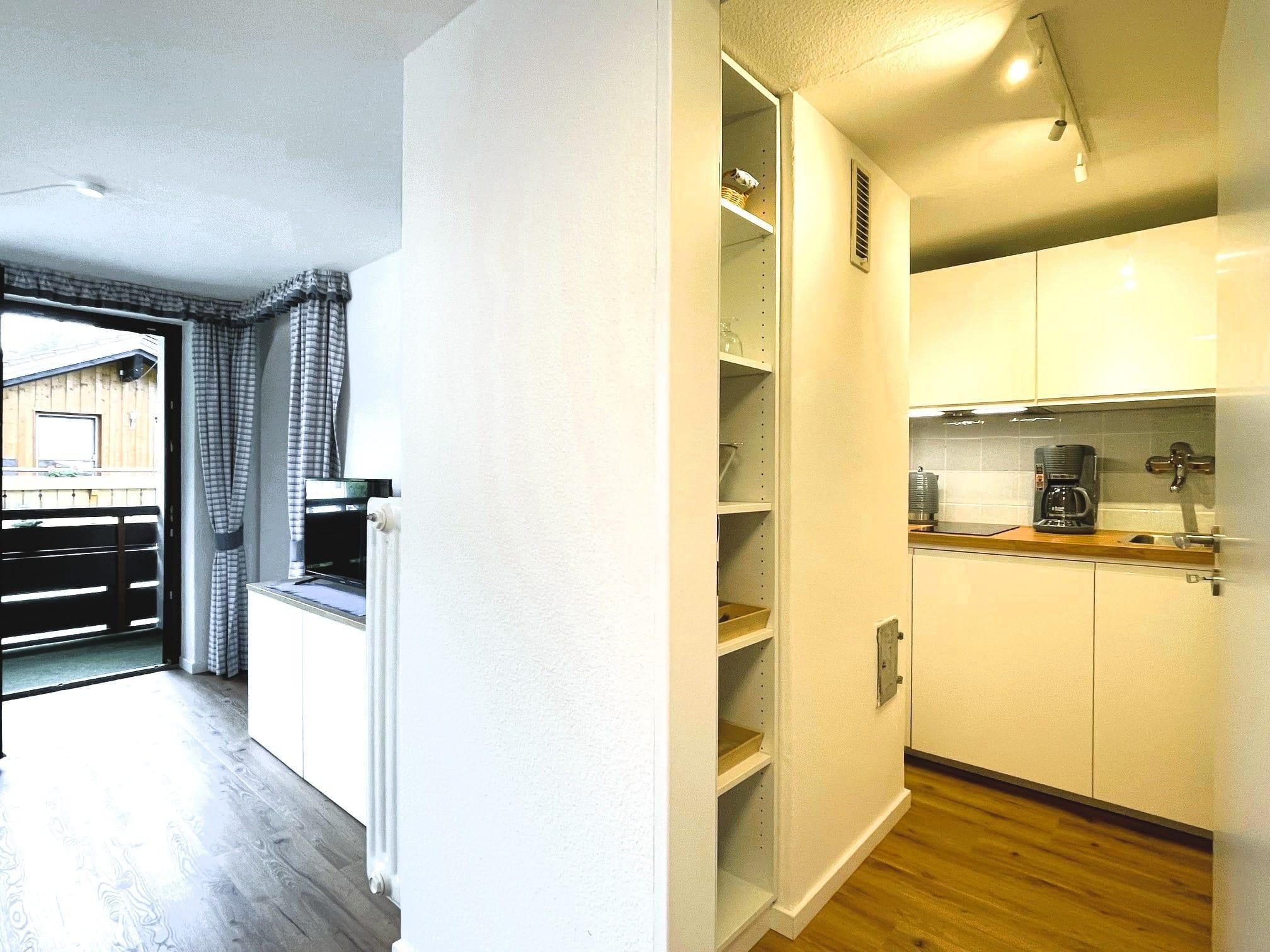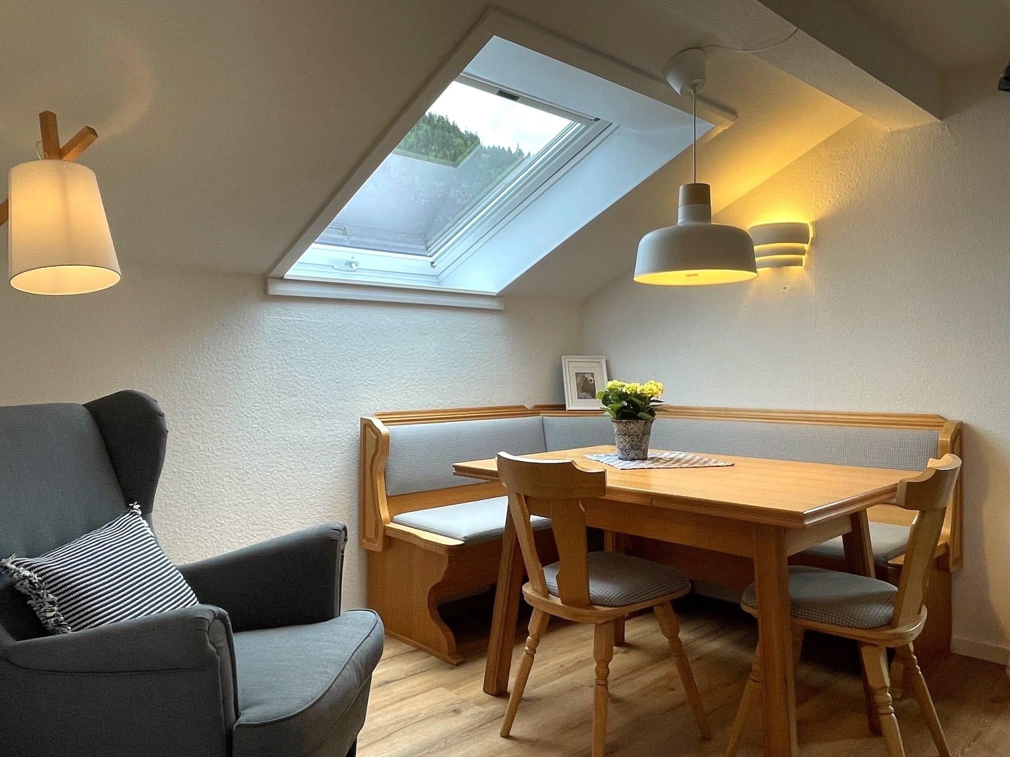 Kleine, feine Ferienwohnung für 1-2 Personen mit überdachtem Balkon. Großes Schlafzimmer (ca. 18 qm) mit Doppelbett sowie integrierter Waschmöglichkeit und Dusche, das WC ist separat. Kochnische für Selbstversorger mit Essecke.