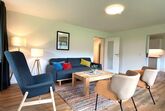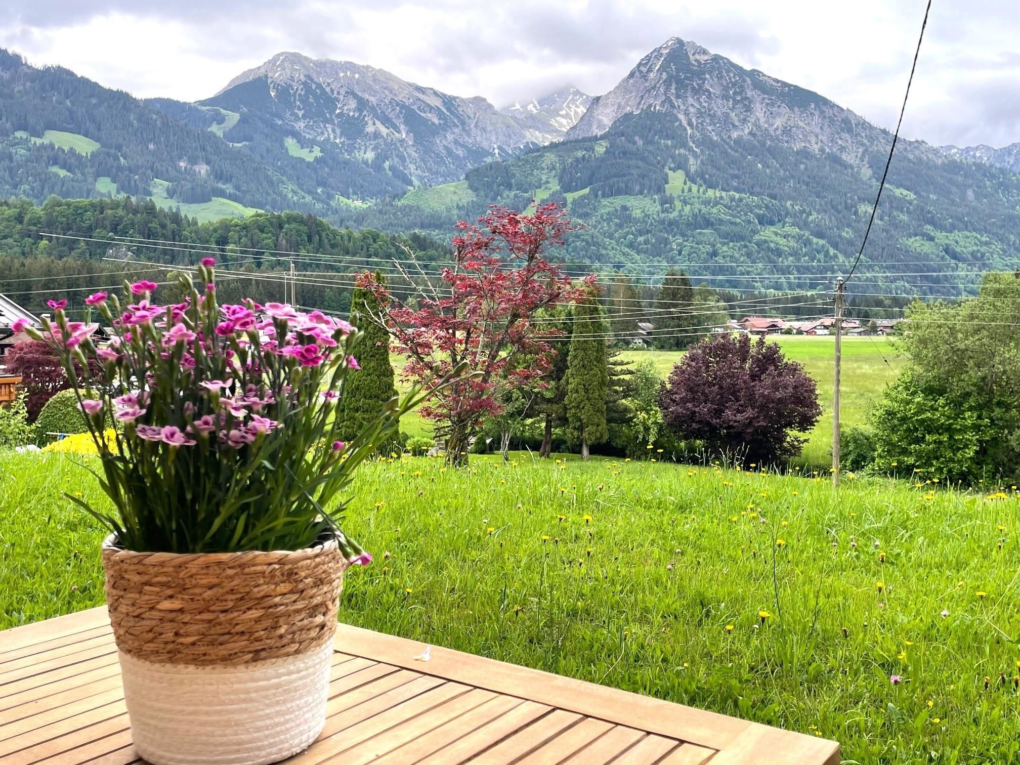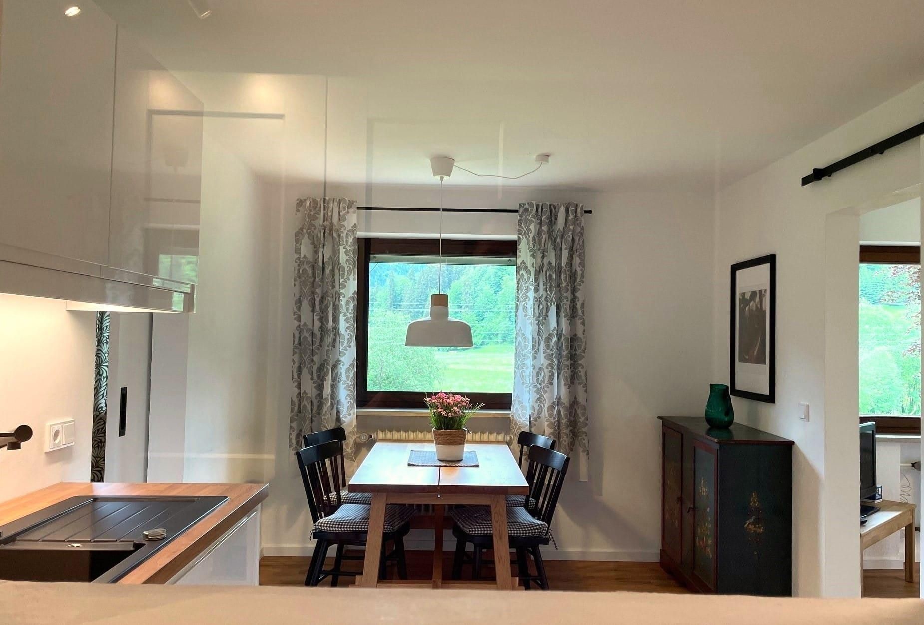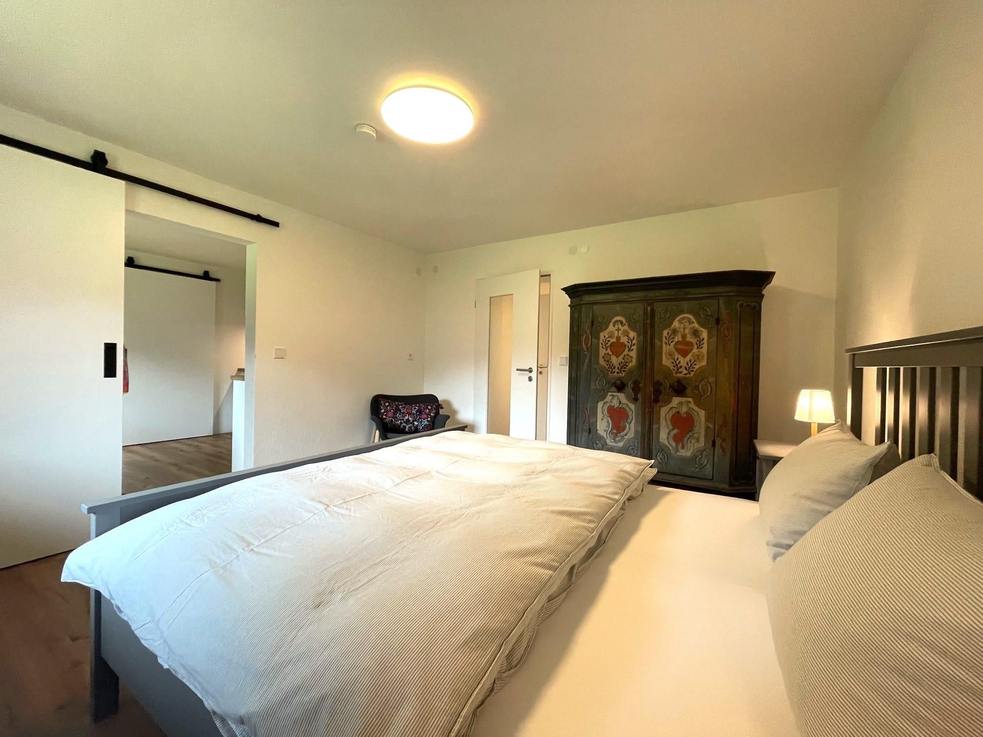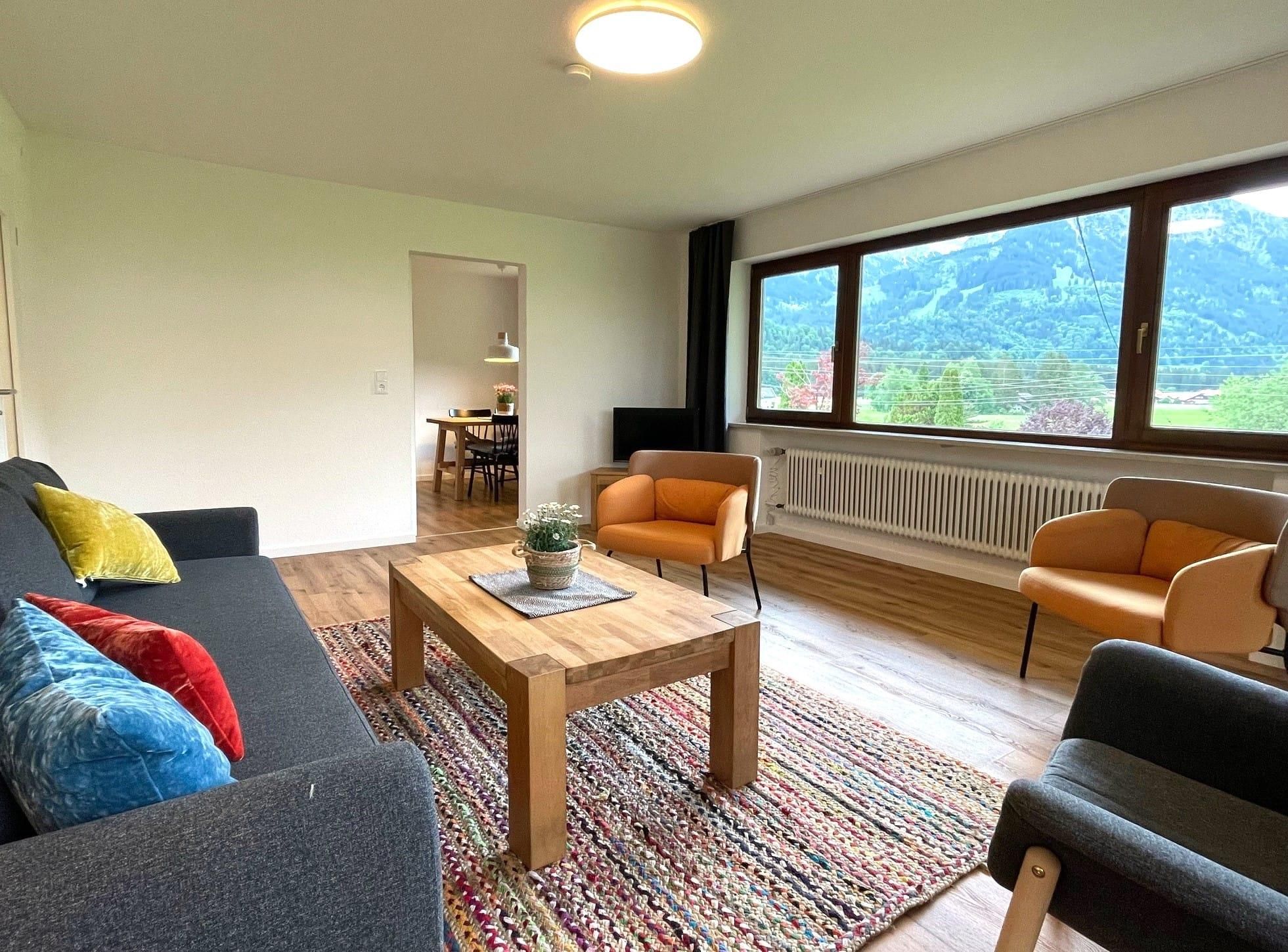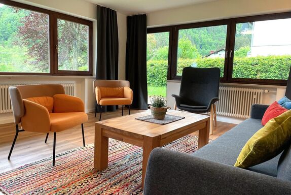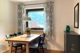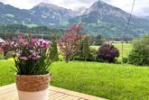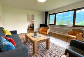 Helle, großzügige Ferienwohnung im Erdgeschoss mit sonniger Terrasse und herrlichem Bergblick. Separates Schlafzimmer mit Doppelbett, zusätzliche Schlafmöglichkeit im Wohnraum (Ausziehcouch 142 x 200). Moderne Küche mit Spülmaschine und Essplatz. Tageslicht-Badezimmer mit Dusche, separates WC. Großer Flur mit Garderobe.