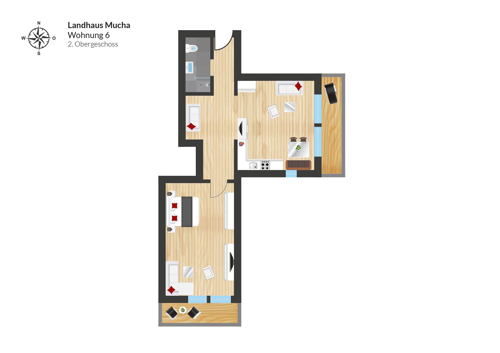 Die Wohnung im 2. Obergeschoss (Dachwohnung) mit 65 m² verfügt über einen Wohnraum mit einer komplett ausgestatteten Küche, einem Esstisch, einer Sitzecke, Sat-TV, ein Schlafzimmer, Süd- und Ostbalkon und ein Bad mit Dusche und Toilette.