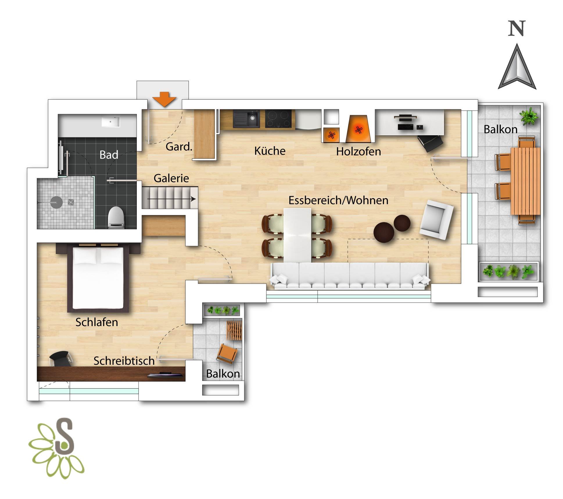 2-Zimmer Suite nach Süden mit Kaminofen und Schlafgalerie