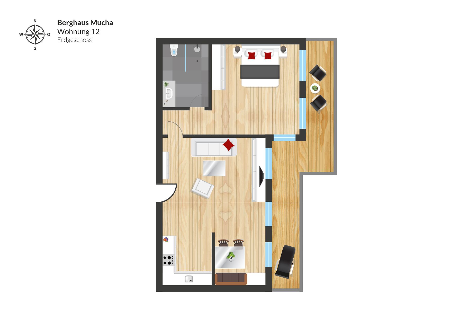 Die Wohnung im Erdgeschoss mit 52 m² verfügt über einen Wohnraum mit einer komplett ausgestatteten Küche, einem Esstisch, einer Sitzecke, Sat-TV, ein Schlafzimmer, Ost-Terrasse und ein Bad mit Dusche und Toilette.