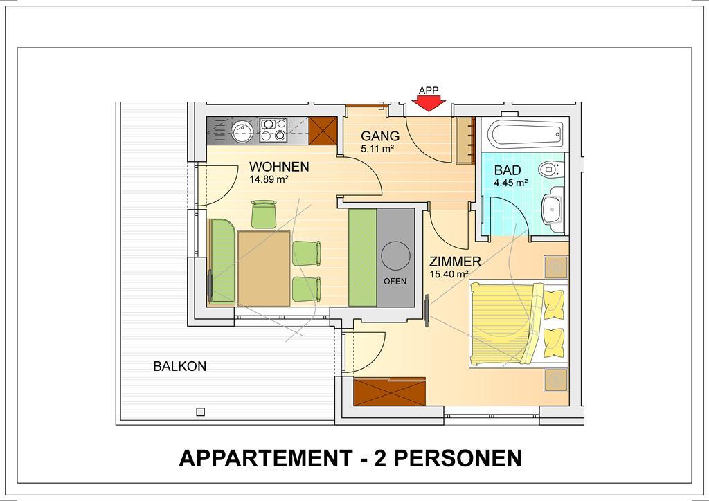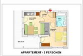 Neu errichtetes Apart mit 1 Schlafzimmer (trennbare Betten) aus Eichenholz Natur, Glastüre in das Badezimmer mit Dusche/WC, Föhn und Kosmetikspiegel. Wohnzimmer mit Essbereich, Bauernofen, Kochnische (Kaffeevollautomat, Spülmaschine, Mikrowelle, Ceranfeld, Backofen, Kühlschrank, Wasserkocher, Toaster, Handrührer). Alle Zimmer mit Flat-TV, Südbalkon und Aussicht auf die Giggibahn. Größe 38 m².