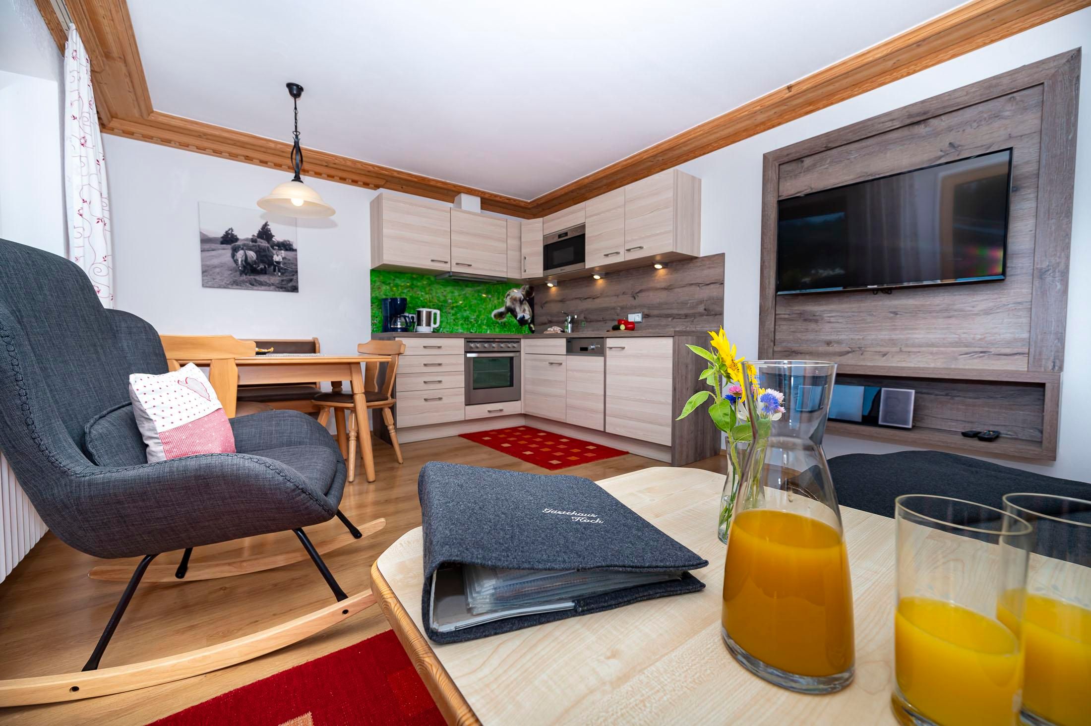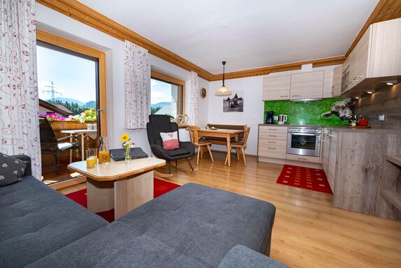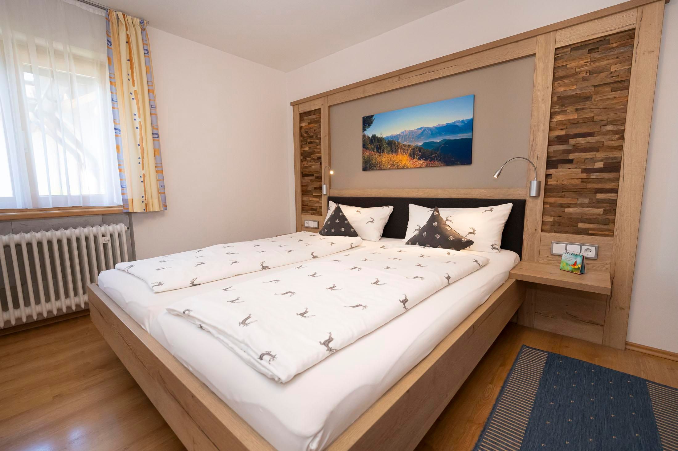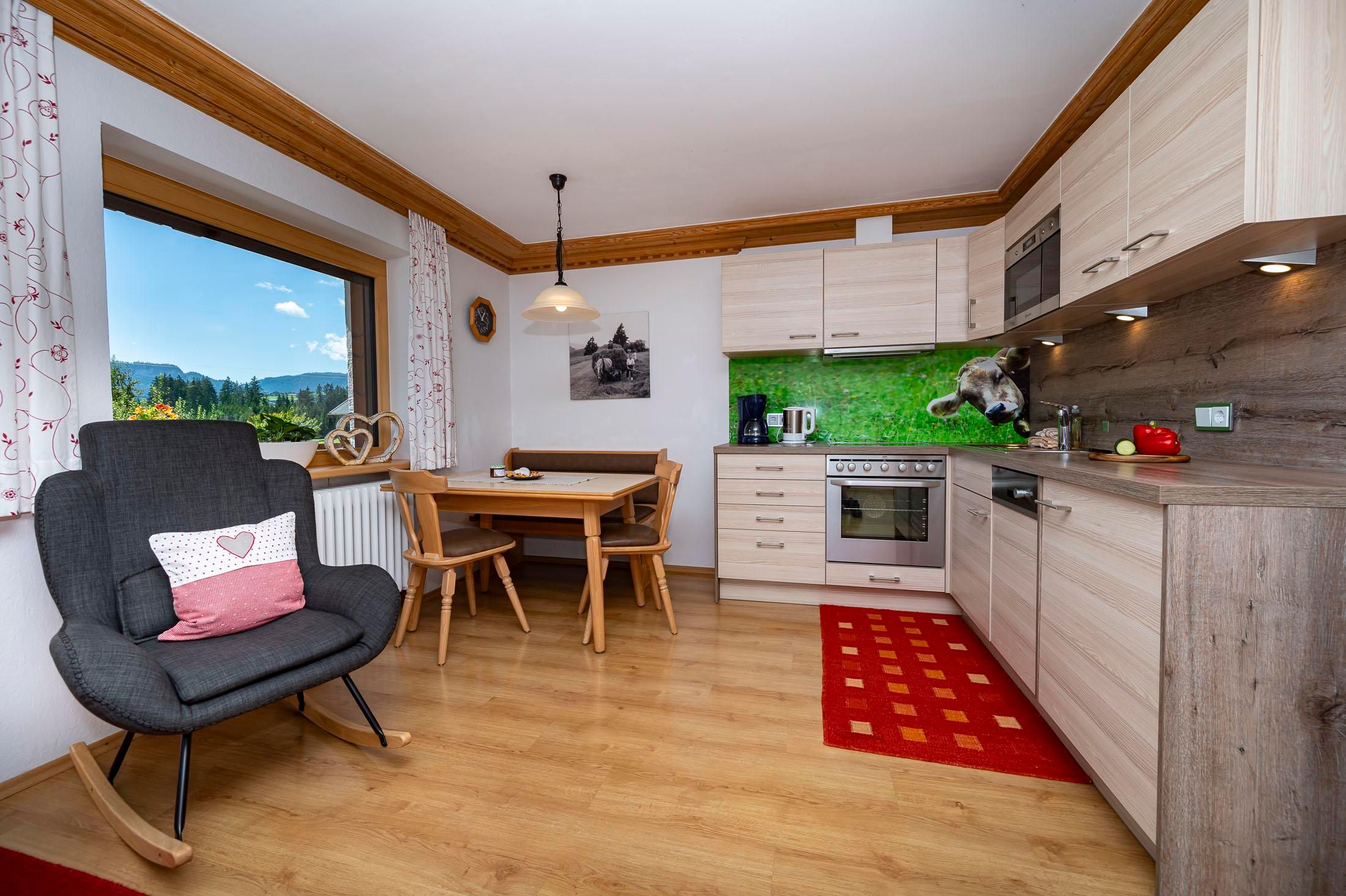 gemütliche, komfortable Ferienwohnung mit zwei getrennten Schlafräumen, 1x Doppelbett, 1x 2 Einzelbetten, Südbalkon mit herrlicher Bergsicht, Wohnzimmer mit Essecke und Couchgarnitur, SAT-TV, komplette Küche mit Spülmaschine, Kühlschrank mit Gefrierfach, Backofen, Mikro, Kaffeemaschine, Toaster, Wasser- und Eierkocher, Badezimmer mit Du/WC, Handtücher, Geschirrtücher, Bettwäsche und Föhn inklusive.