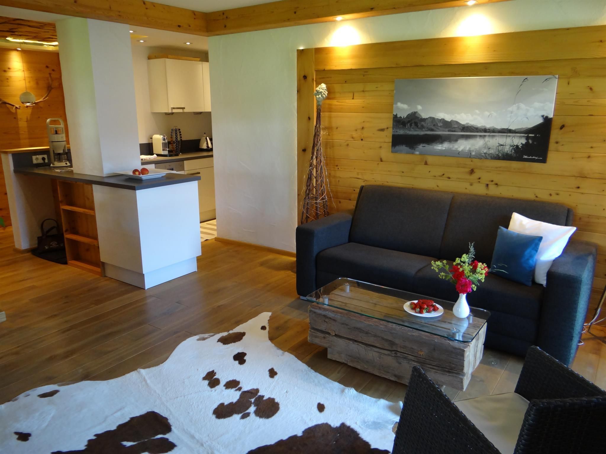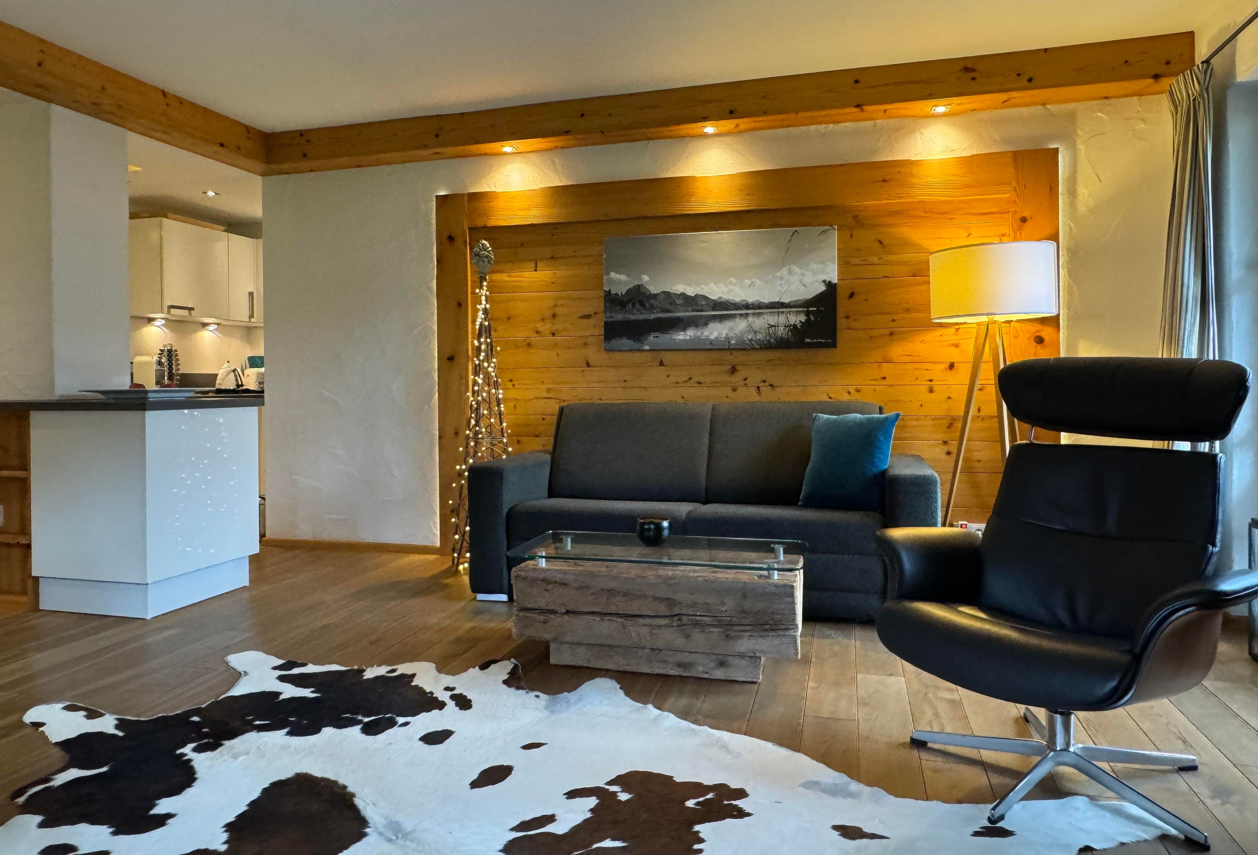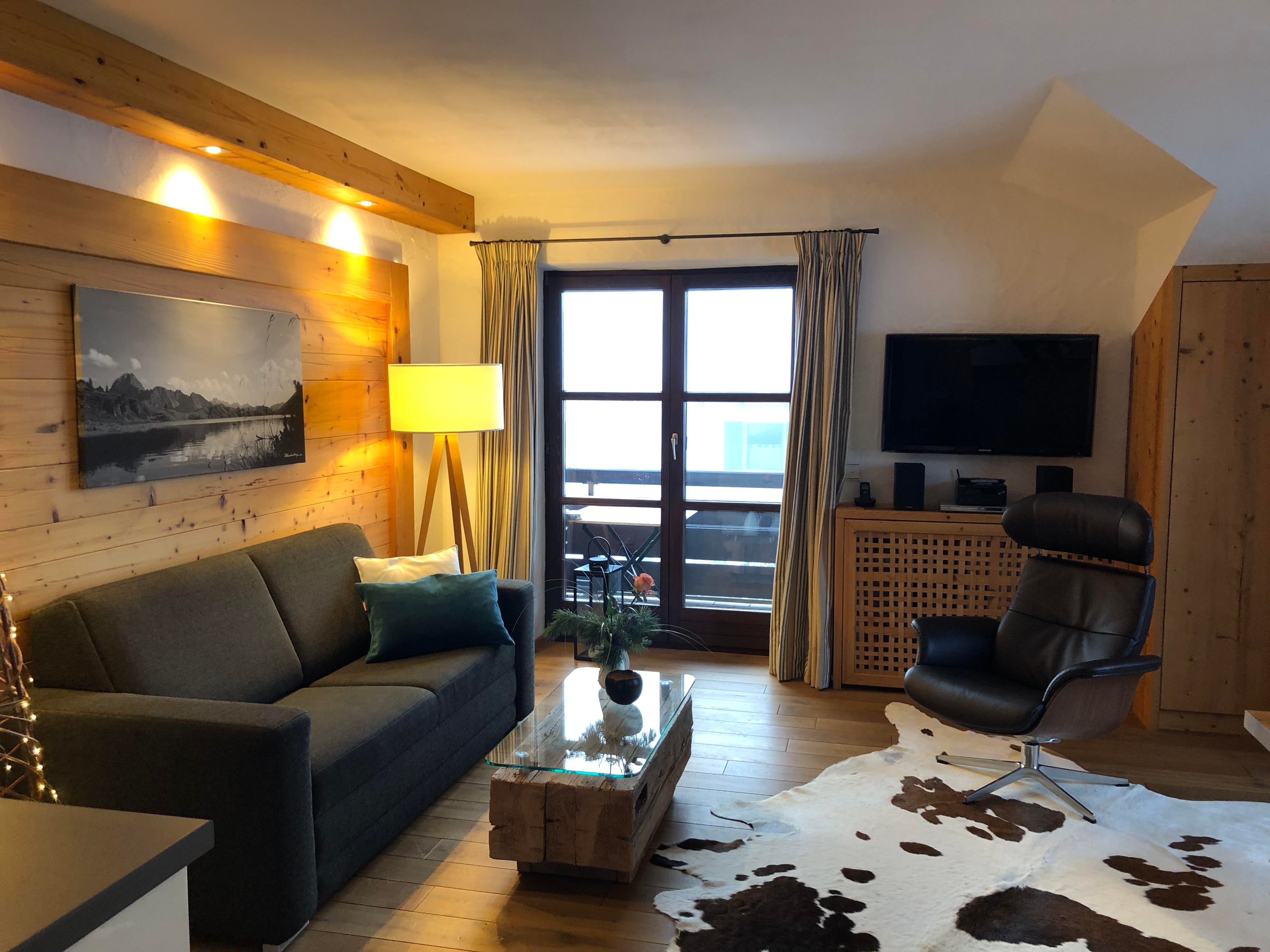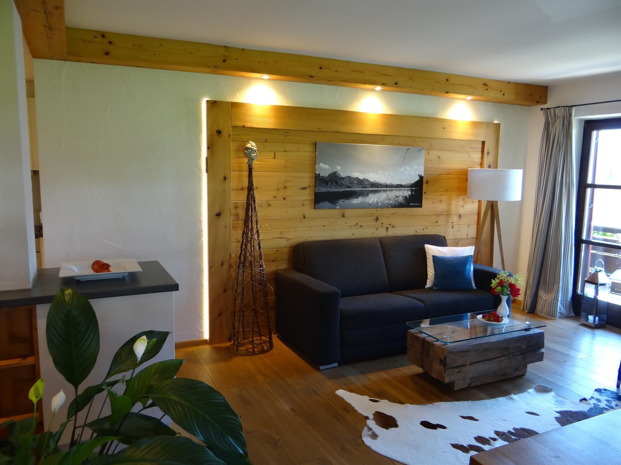 Zeitlos schön verbindet unser Appartement Rubihornblick Tradition, Luxus und Komfort: 58 qm, separates Schlafzimmer, Bad mit Mini Spa (Sauna und Rainshower), sehr großzügiger Wohnraum mit Essplatz und offener Küche mit Theke. Der Ausbau wurde mit Altholz gemacht und mit alten schwarz-weiß Fotografien kombiniert. Das Appartement verfügt zudem über einen Süd- und einen Westbalkon mit Blick in die Berge.