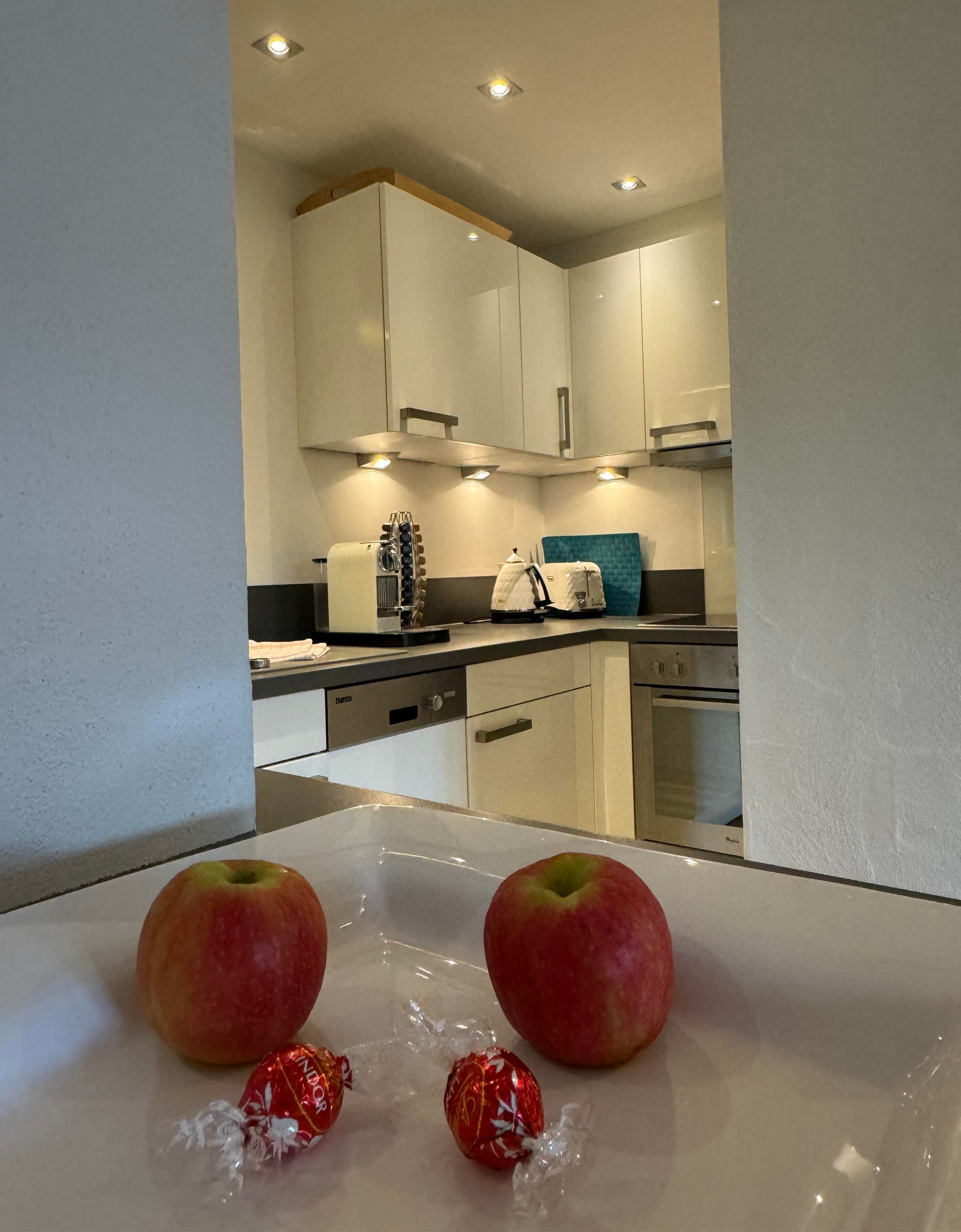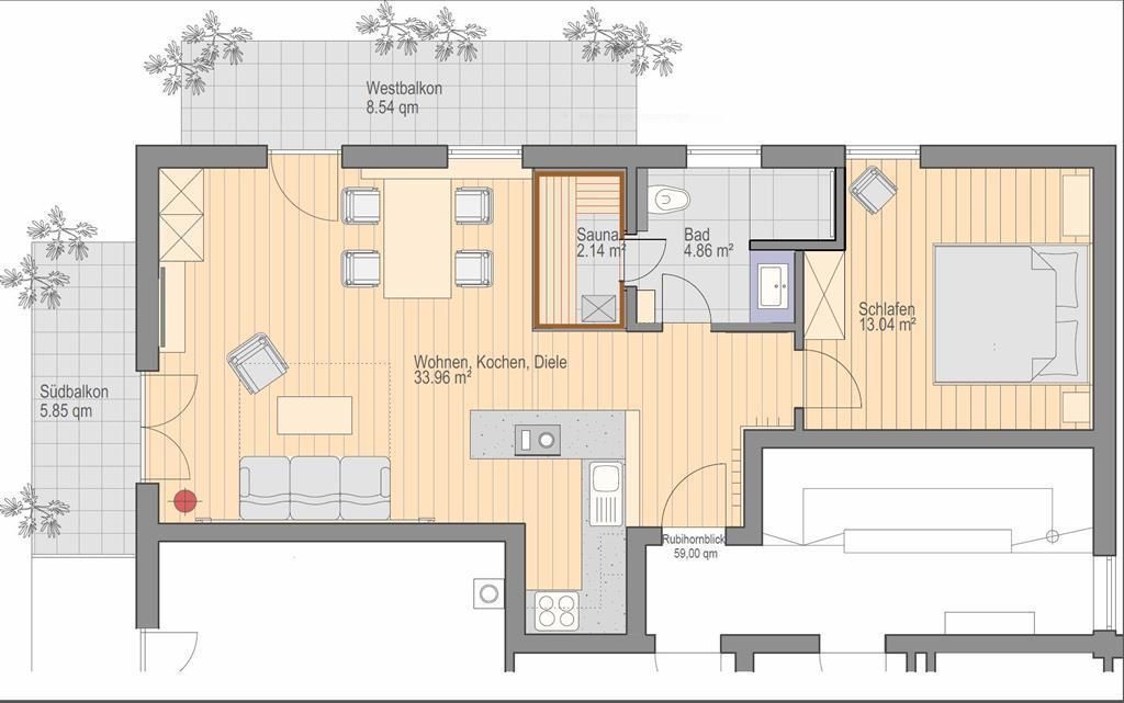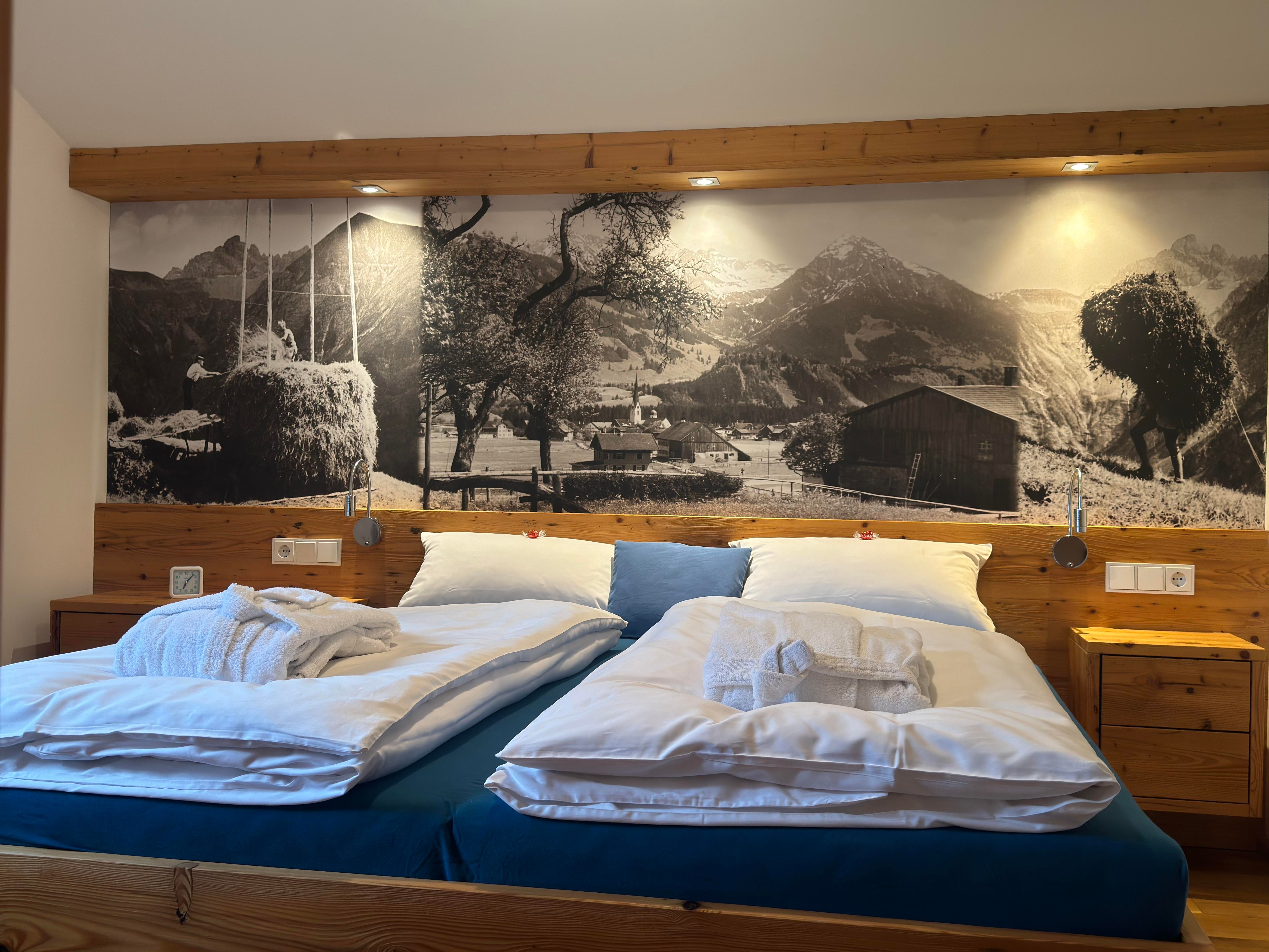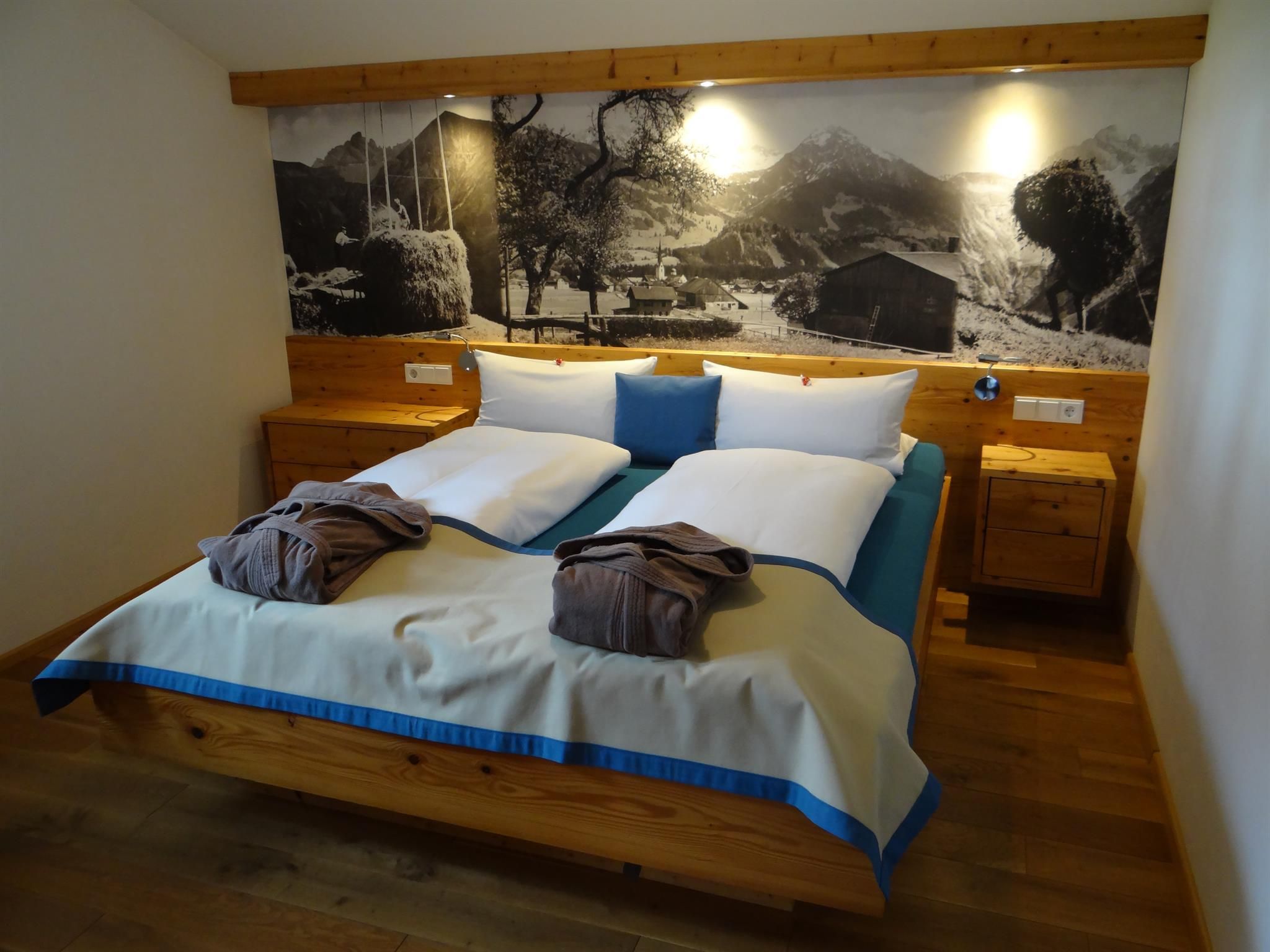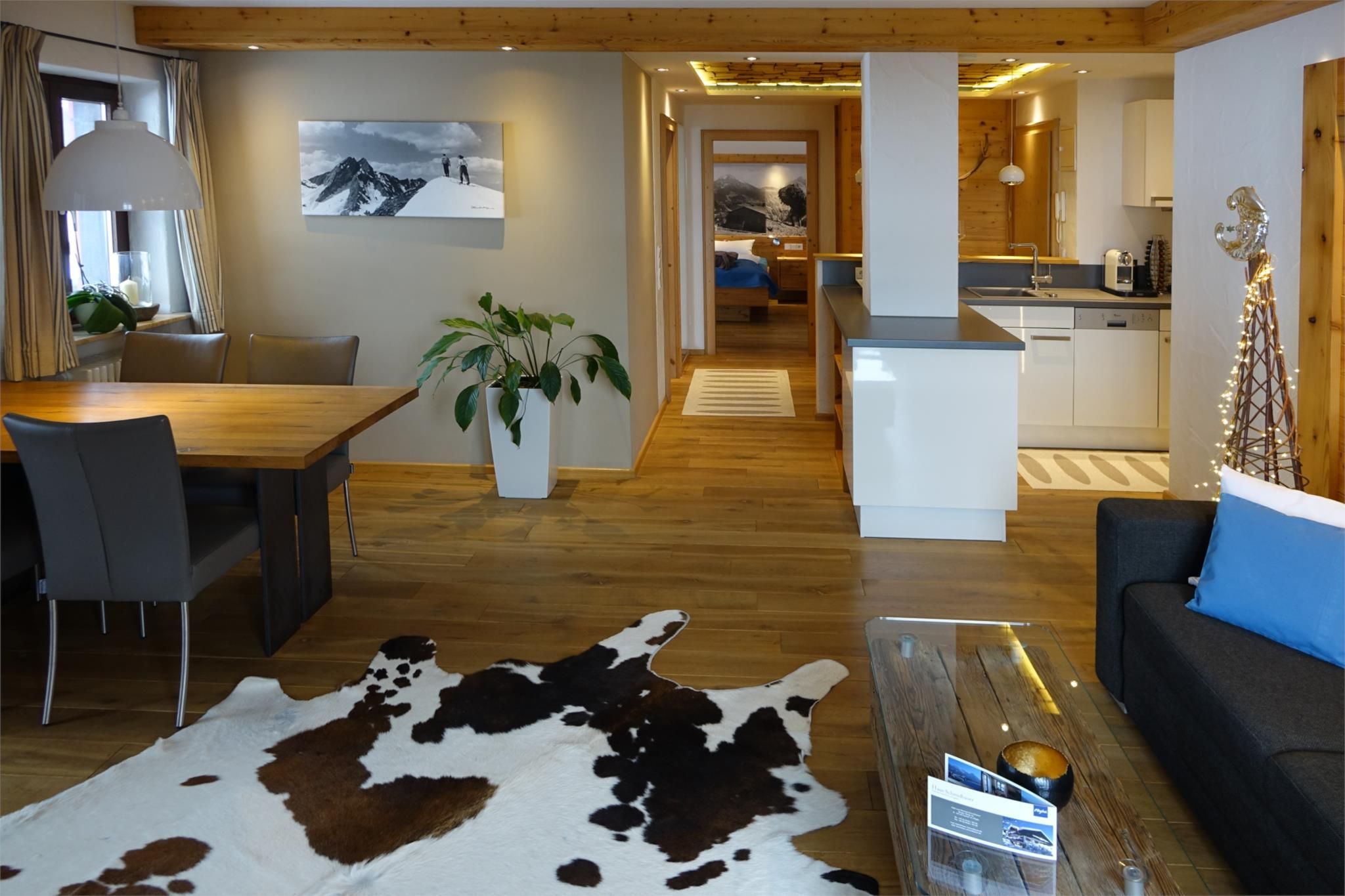 Zeitlos schön verbindet unser Appartement Rubihornblick Tradition, Luxus und Komfort: 58 qm, separates Schlafzimmer, Bad mit Mini Spa (Sauna und Rainshower), sehr großzügiger Wohnraum mit Essplatz und offener Küche mit Theke. Der Ausbau wurde mit Altholz gemacht und mit alten schwarz-weiß Fotografien kombiniert. Das Appartement verfügt zudem über einen Süd- und einen Westbalkon mit Blick in die Berge.