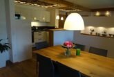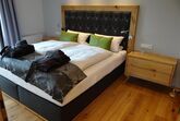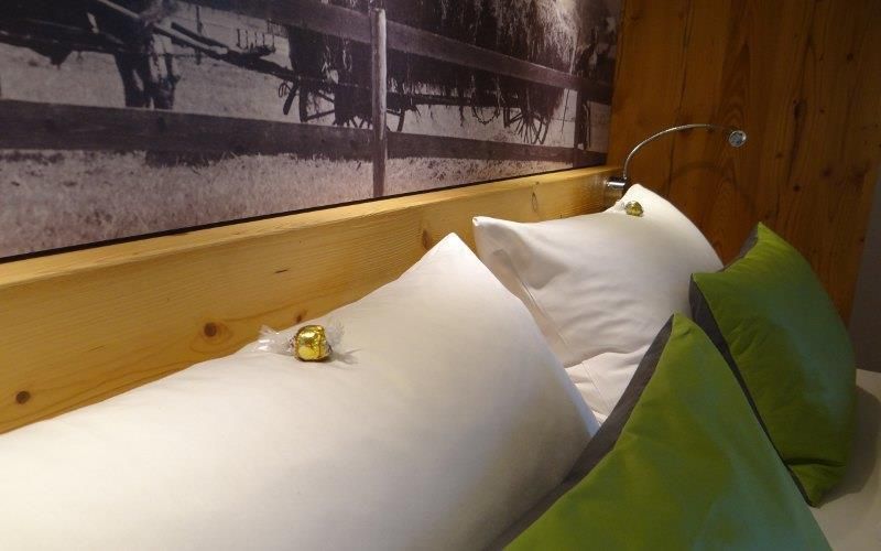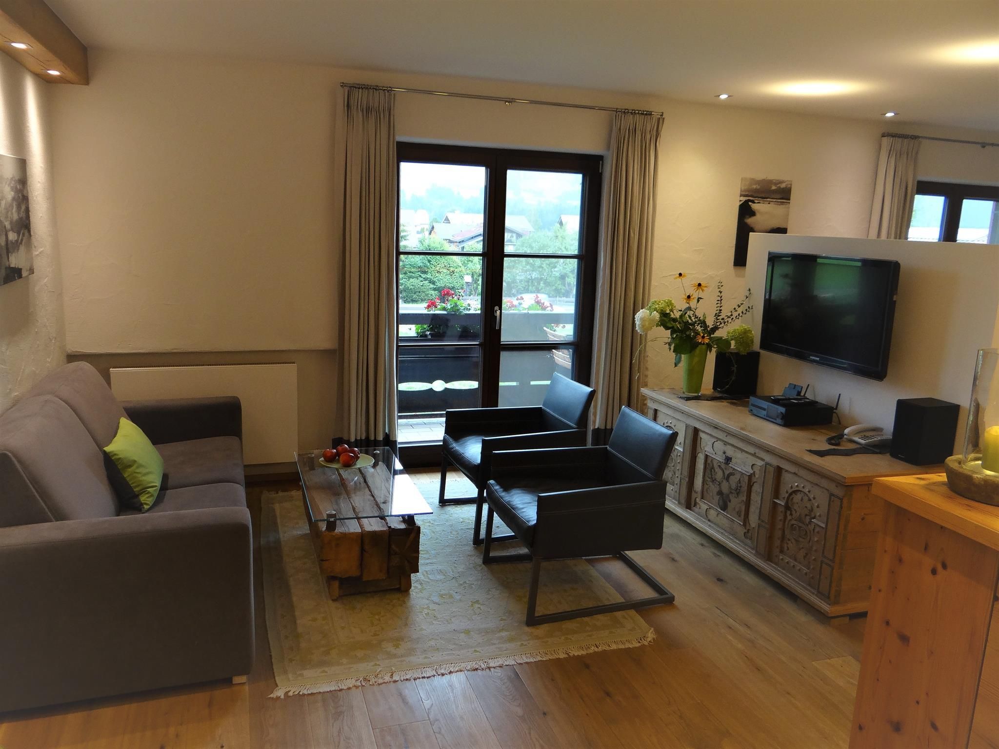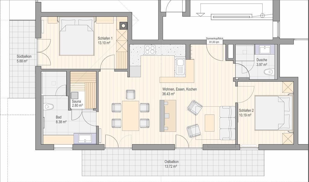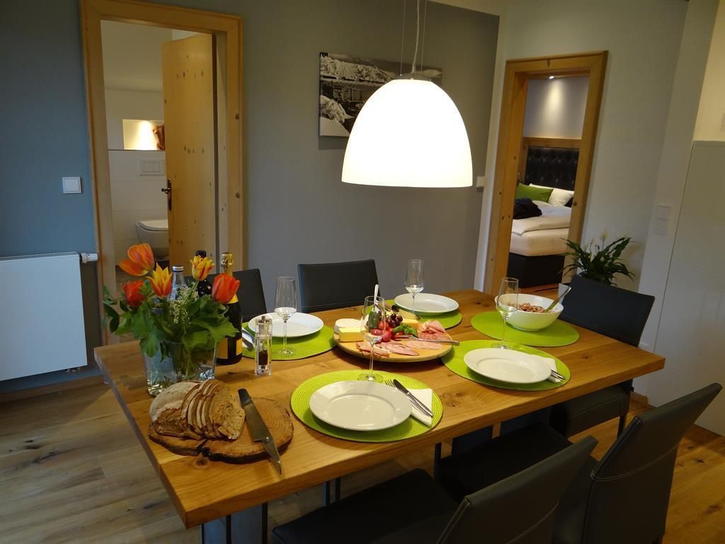 Zeitlos schön verbindet unser Appartement Sonnenkopfblick Tradition, Luxus und Komfort: 81 qm, 2 separate Schlafzimmer, 2 Bäder, Mini Spa (Sauna und Rainshower), großzügiger Wohnraum mit Essplatz und offener Küche mit Theke. Der Ausbau wurde mit Altholz gemacht und mit alten schwarz-weiß Fotografien kombiniert. Das Appartement verfügt zudem über einen Ost- und einen Südbalkon mit Blick in die Berge.