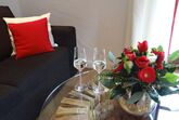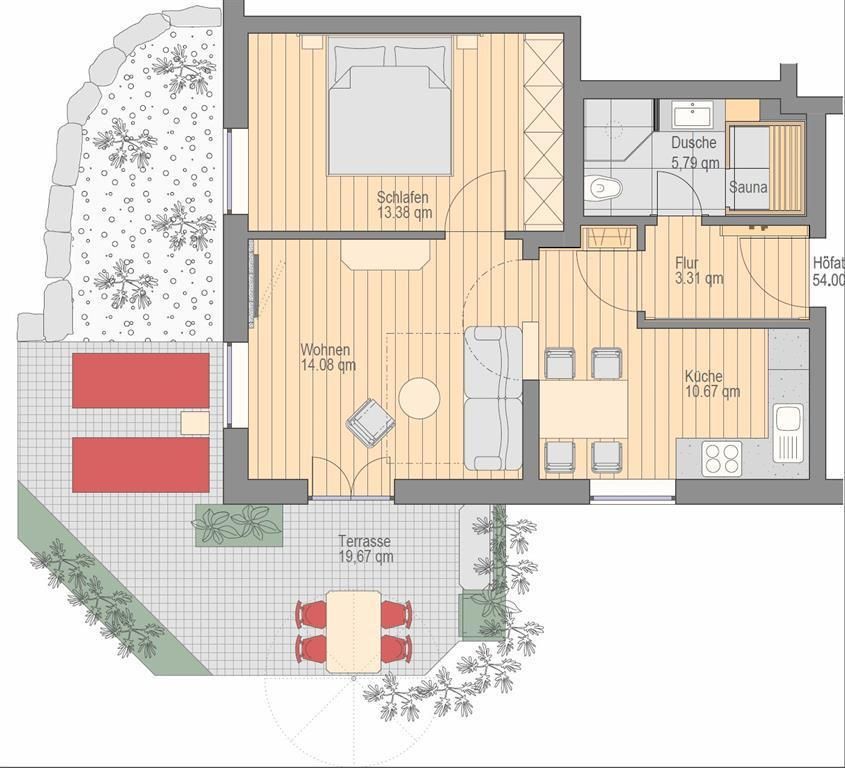 Auch unser Appartement Höfatsblick ist eine kleine Design-Perle: 54qm, separates Schlafzimmer mit Altholz und nostalgischem schwarz-weiß Foto an der Wand. Der Wohnraum mit Flachbildschirm ist von der voll ausgestatteten Küche mit Essplatz durch einen Rundbogen getrennt. Im Bad befindet sich ein wohnungseigenes Mini-Spa mit Sauna und Rainshower. Gemütliche Terrasse mit Ost- u. Südseite.