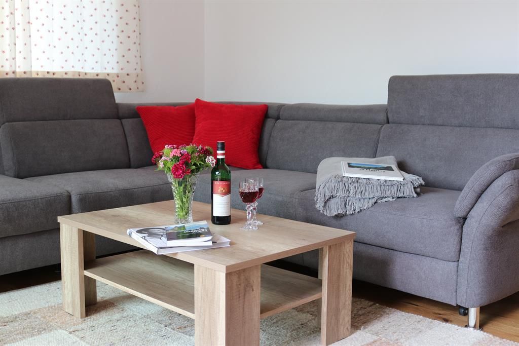 Unsere 2018 neu renovierte Ferienwohnung Trettachblick (60qm) besteht aus Wohn- und Esszimmer, offener Küche, Schlafzimmer, Bad (Dusche, WC, Badewanne), Abstellraum und großem Südbalkon mit Blick auf die Allgäuer Alpen.