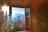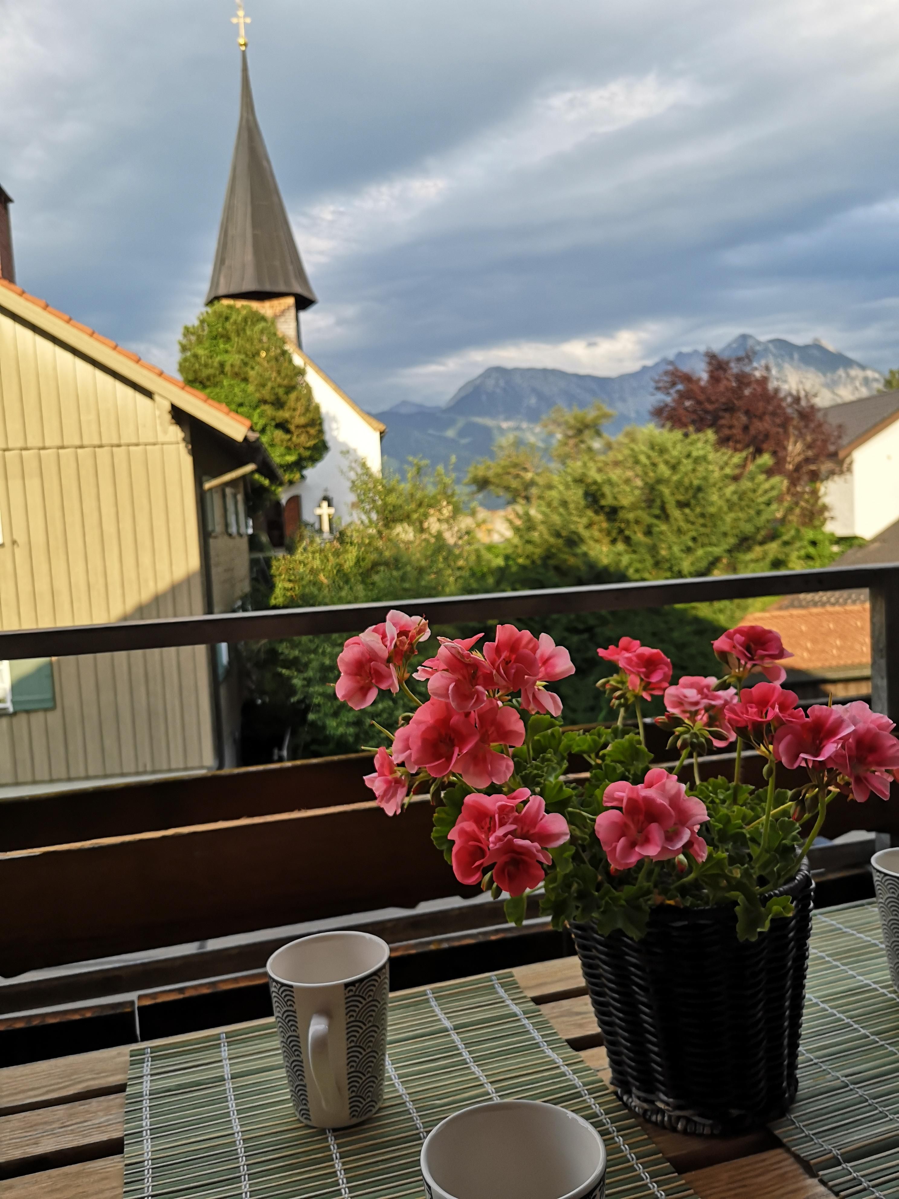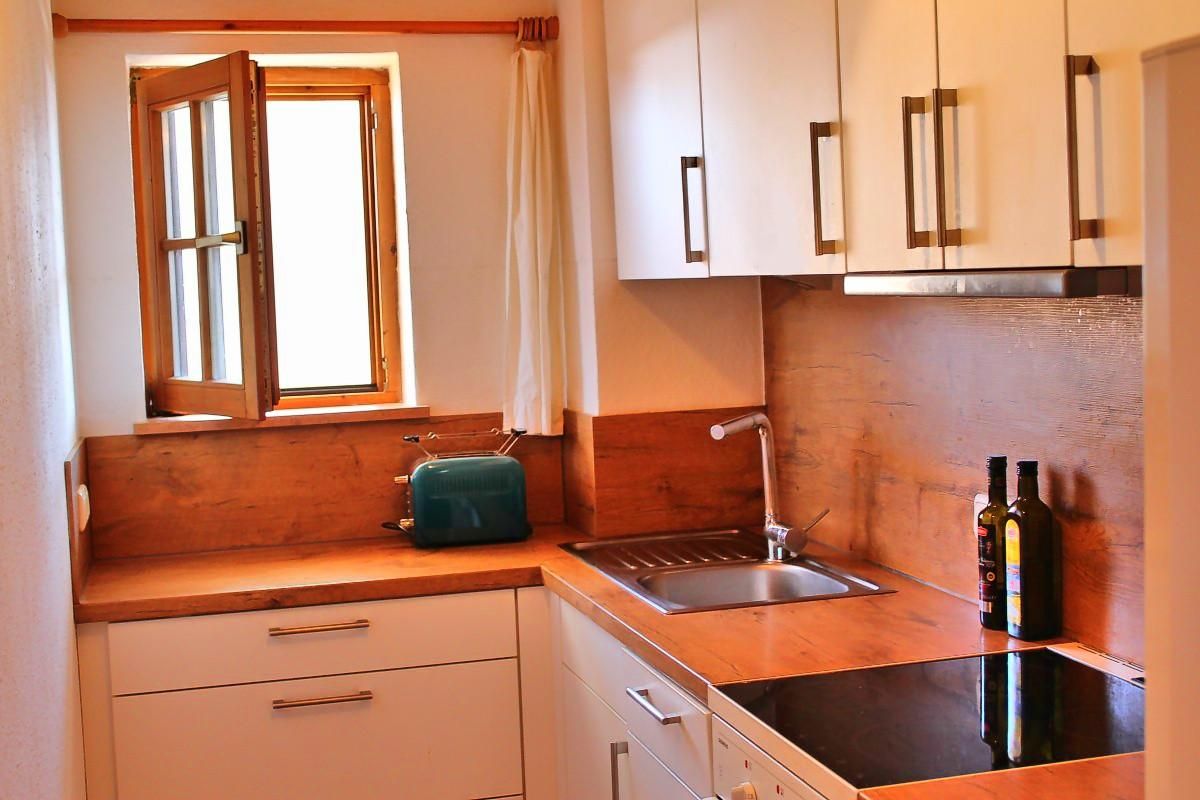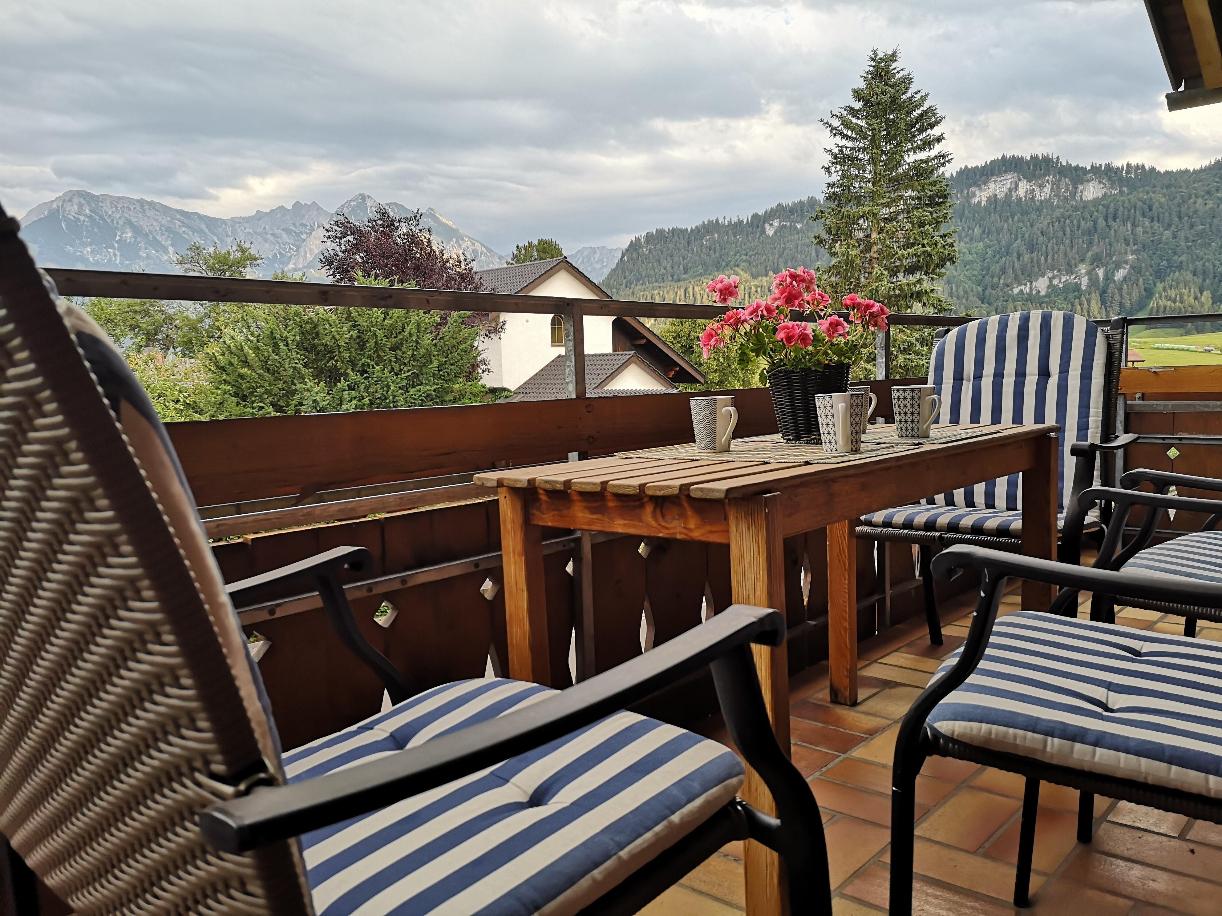 Urlaubswohnung mit zwei Sonnenbalkonen und traumhaftem Bergblick für bis zu 4 Personen in zwei großen Zimmern. Hohe komfortable Betten und stilvolle Einrichtung mit Bauernmöbeln.