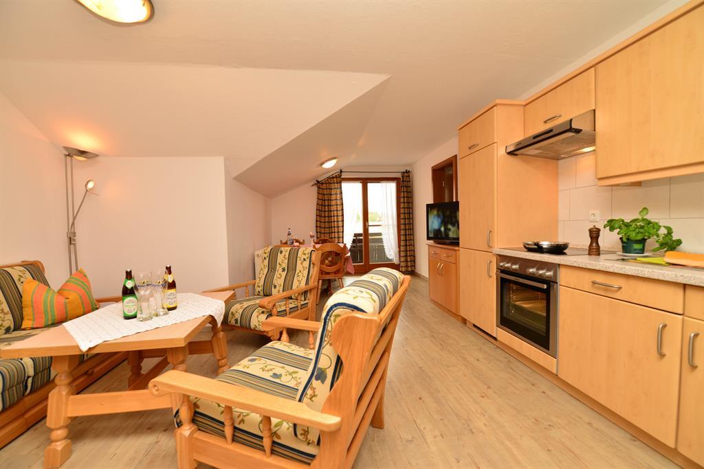 Geräumige, neuwertig eingerichtete Ferienwohnung im zweiten Stock mit Blick nach Norden auf den Wächter des Allgäus,den Grüntenberg. Sie verfügt über vier Räume, davon ein Wohnzimmer, ein Schlafzimmer, eine Küche und ein Badezimmer mit Dusche/WC. Ausstattung: Balkon, Wasserkocher, Kaffeemaschine, Flachbildschirm, Telefon, kostenlosem W-Lan und Zimmersafe.