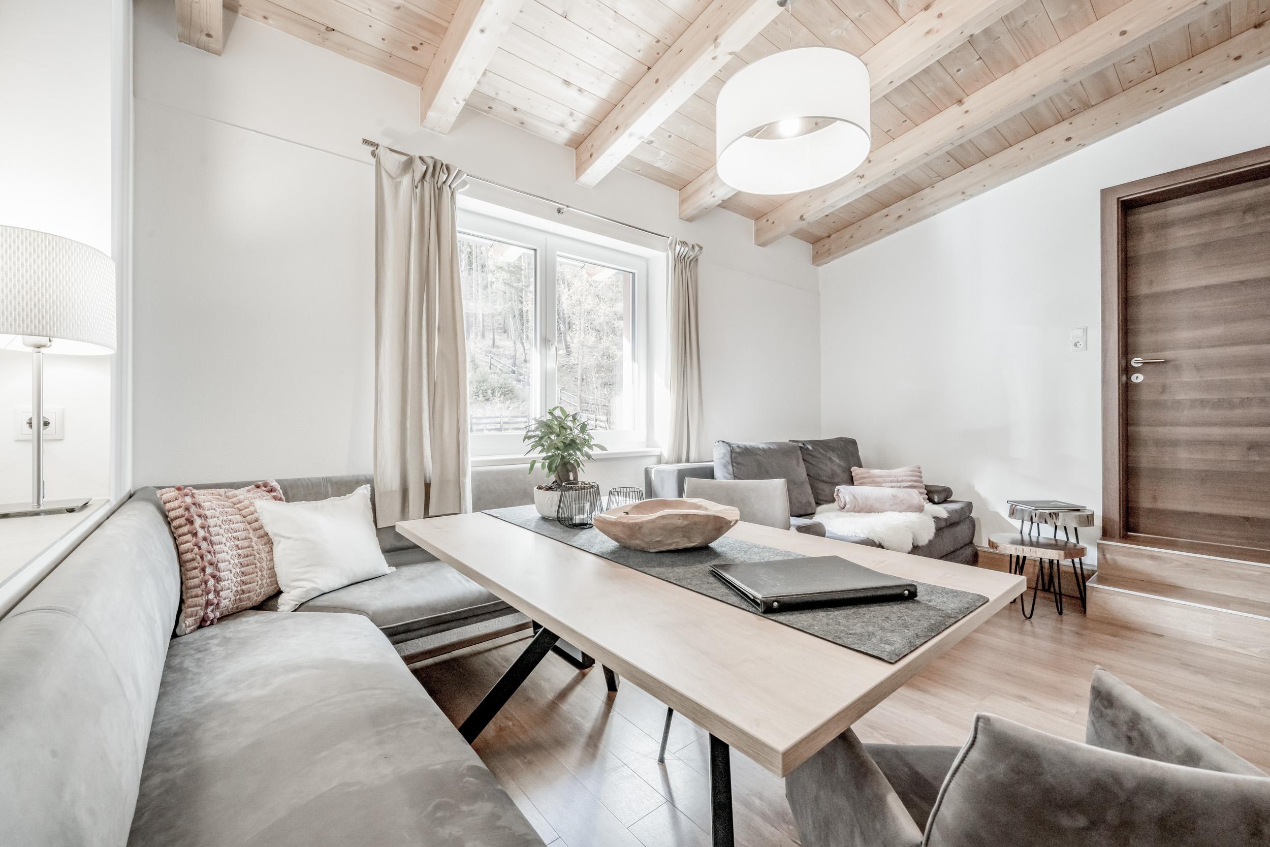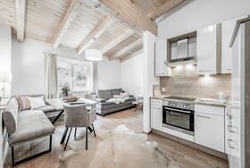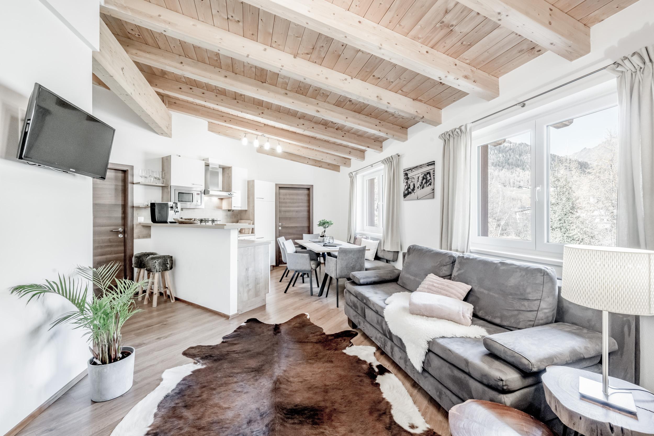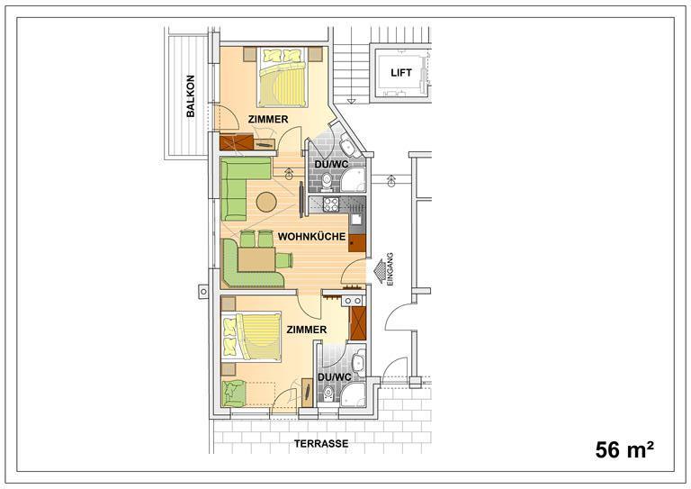 58 m² großes Appartement im 3. Stock mit Sichtdachstuhl. 2 Schlafzimmer mit jeweils Dusche/Toilette, Wohnraum mit vollausgestatter Küche sowie gemütlichen Essbereich und Relax-Sofa für 2 Personen.