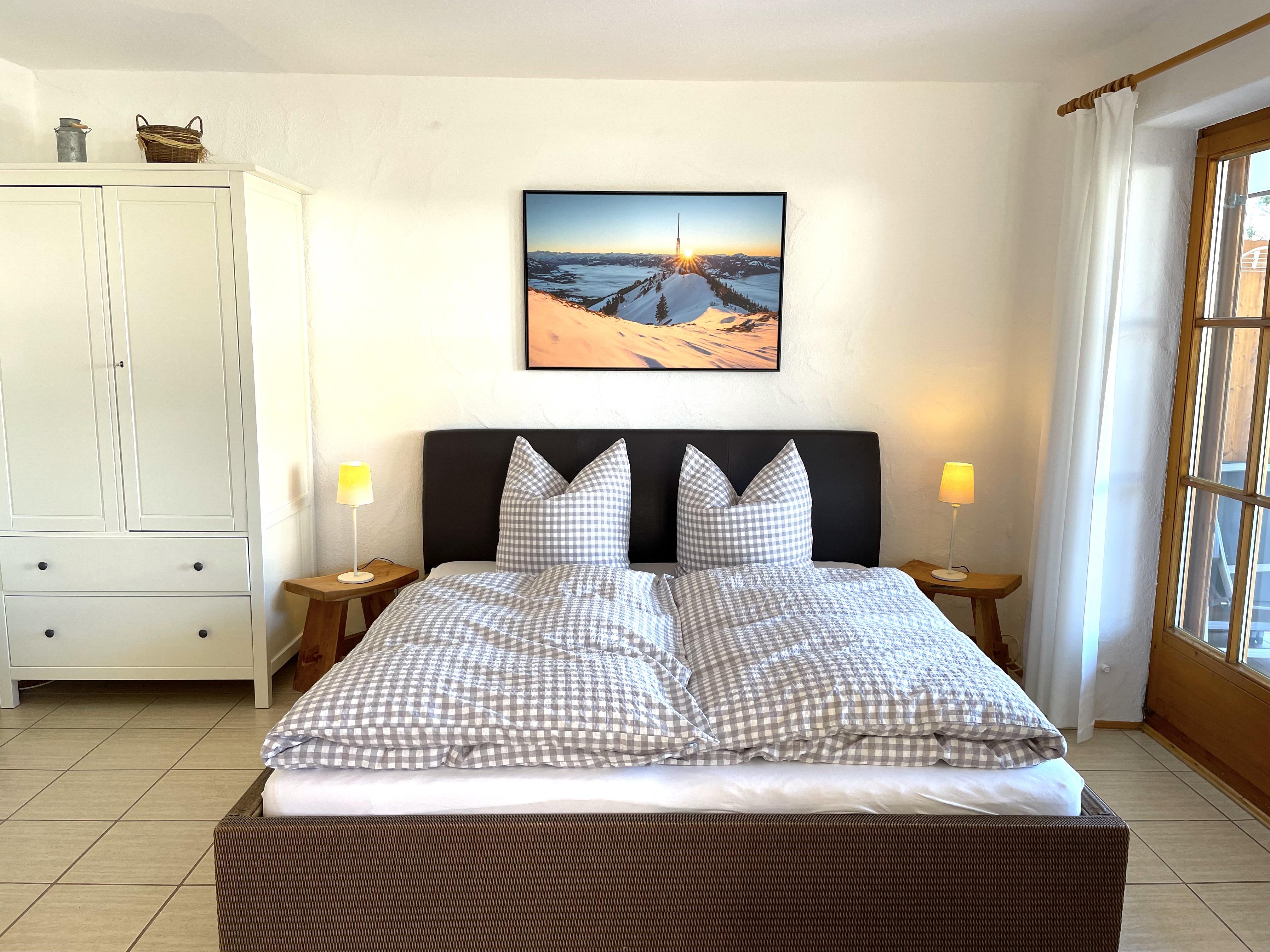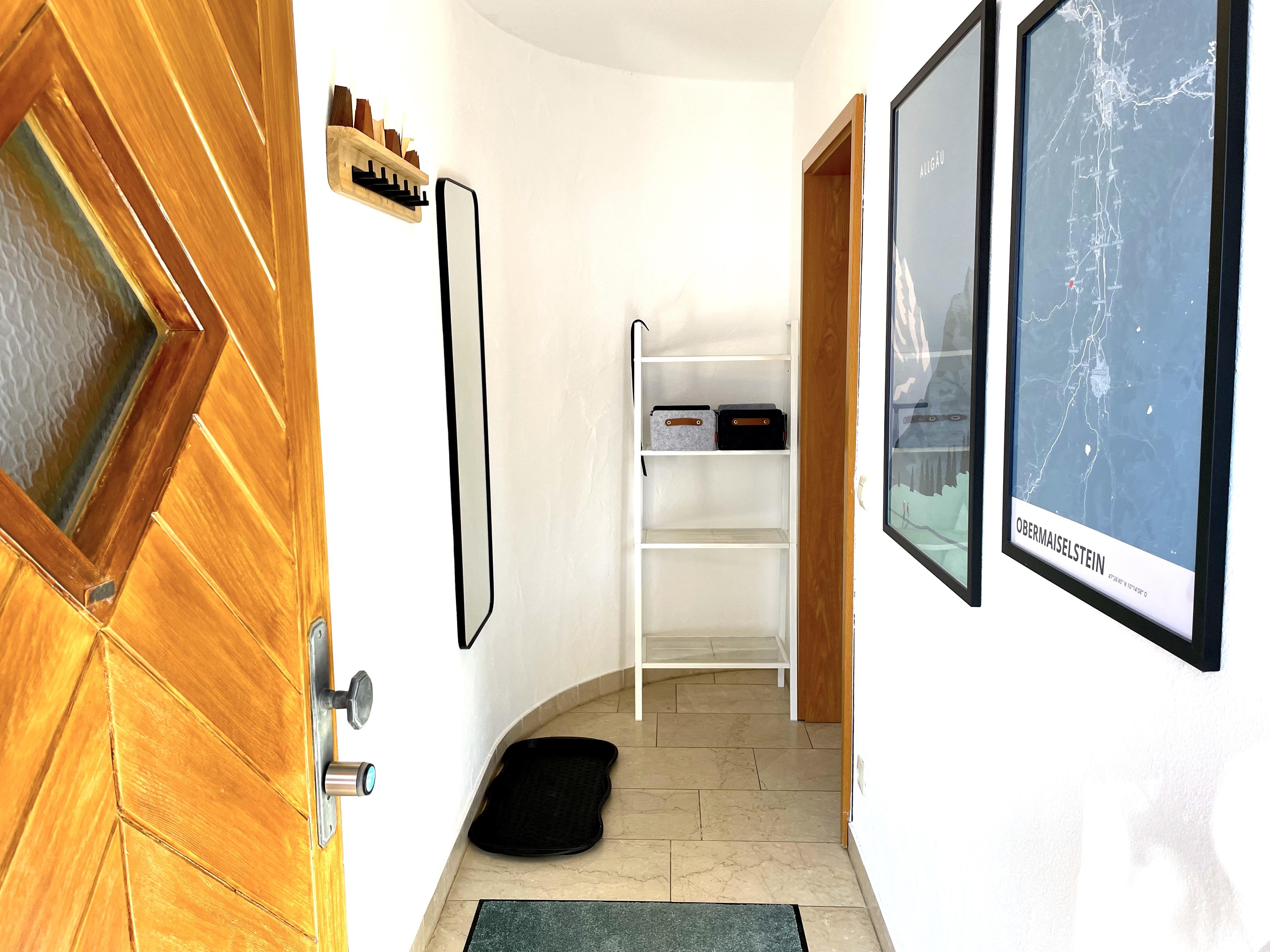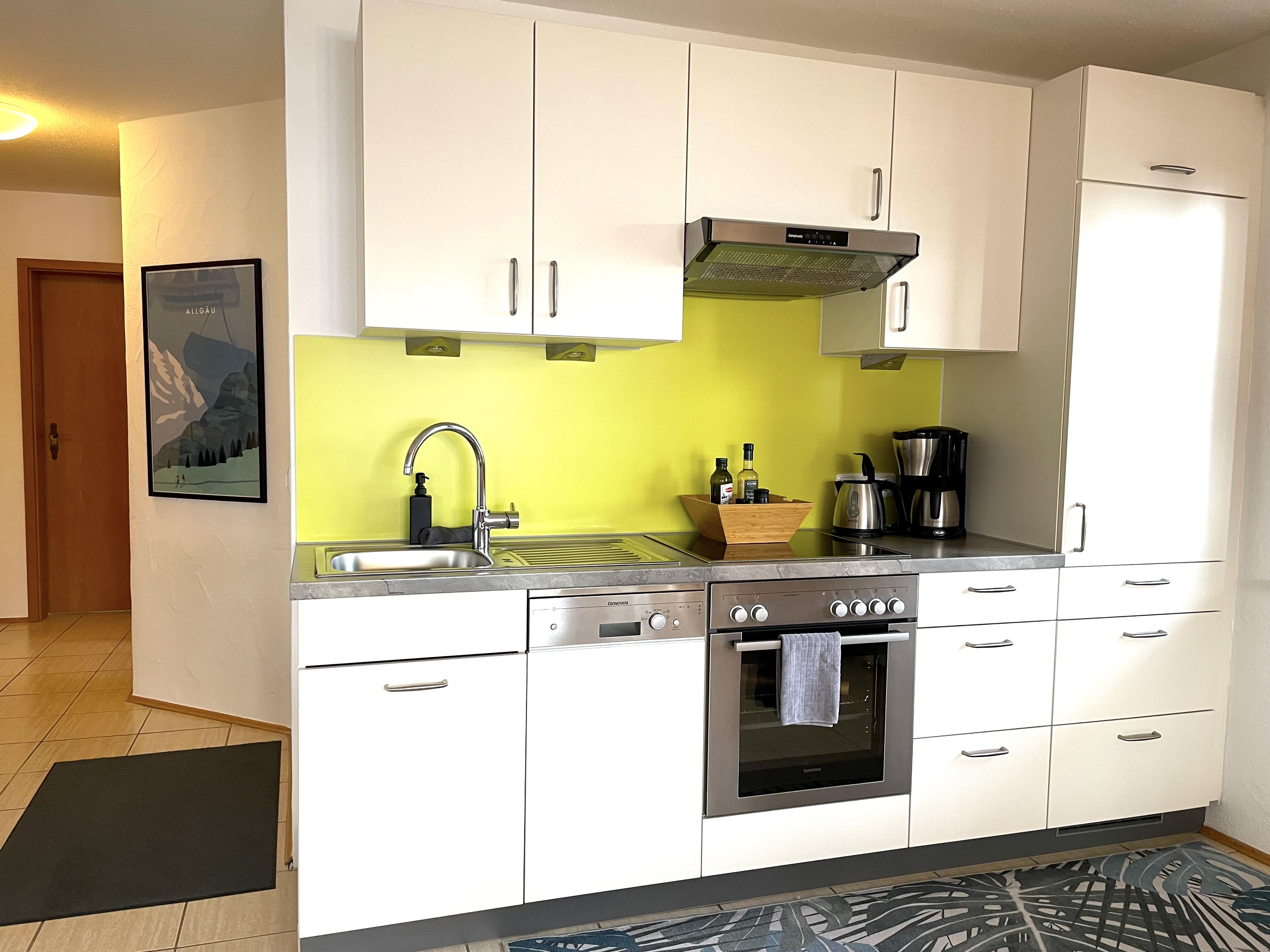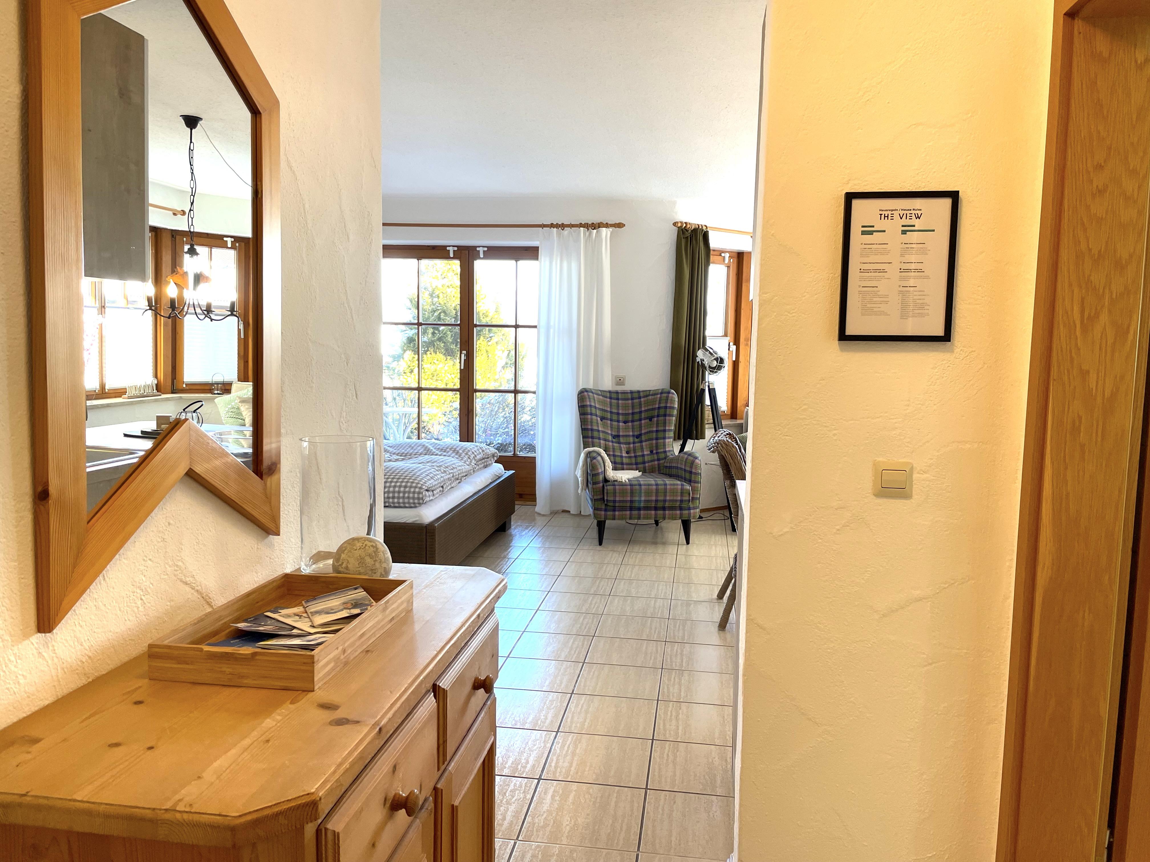 THE VIEW - Fewo Grünten Unsere 34m² große EG-Wohnung Grünten erwartet euch mit einem schönen Wohn-/Essbereich mit einer offenen und voll ausgestatteten Küche, die nahtlos in das Wohnzimmer mit einem echten Doppelbett und Couch übergeht, von der aus ihr einen wunderschönen Blick in die Berge genießen könnt. Über einen kleinen Flur gelangt ihr in das Badezimmer mit Dusche/WC.