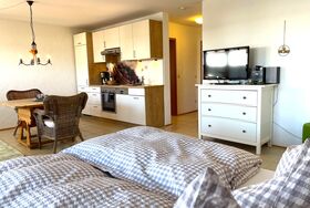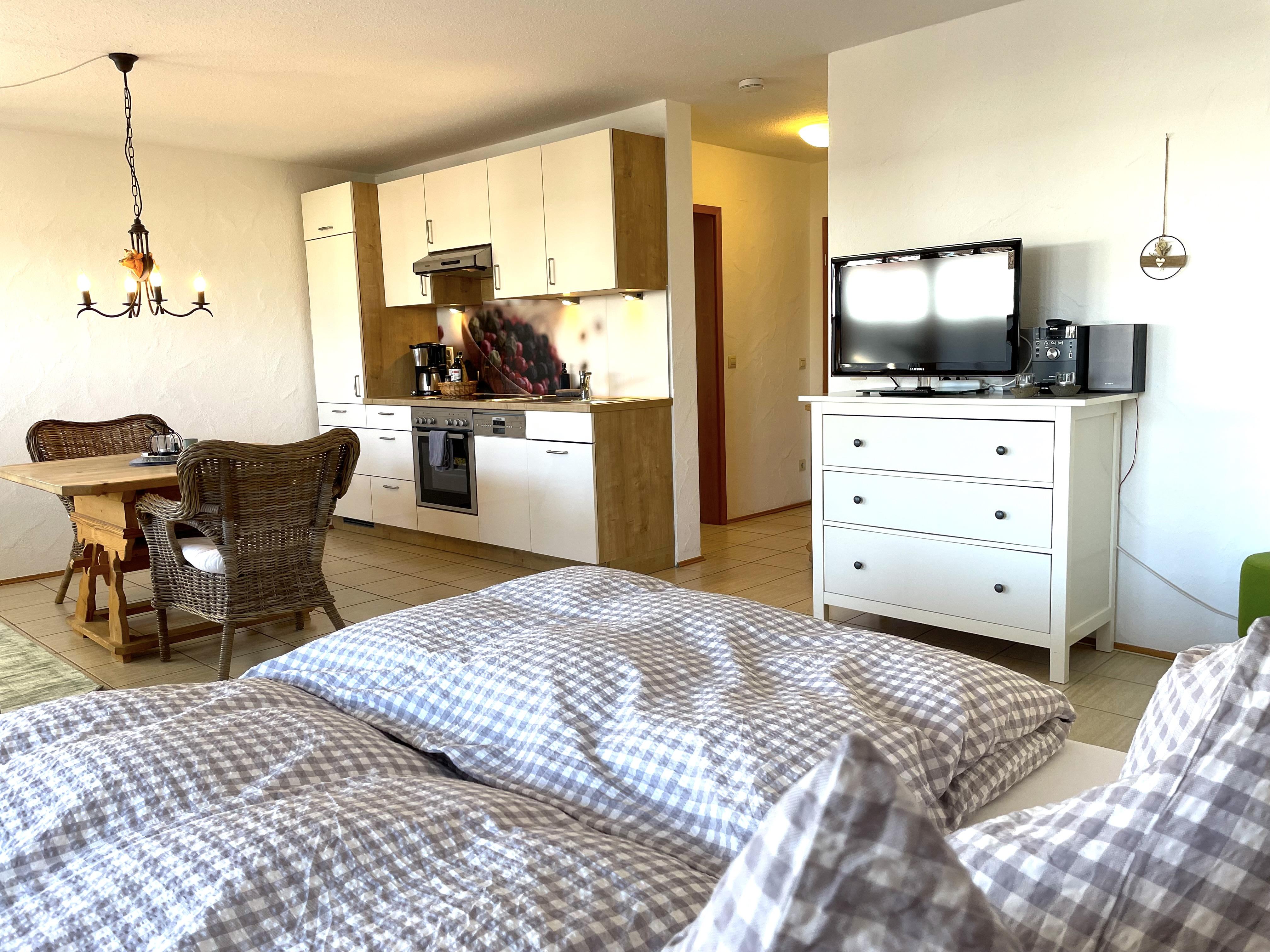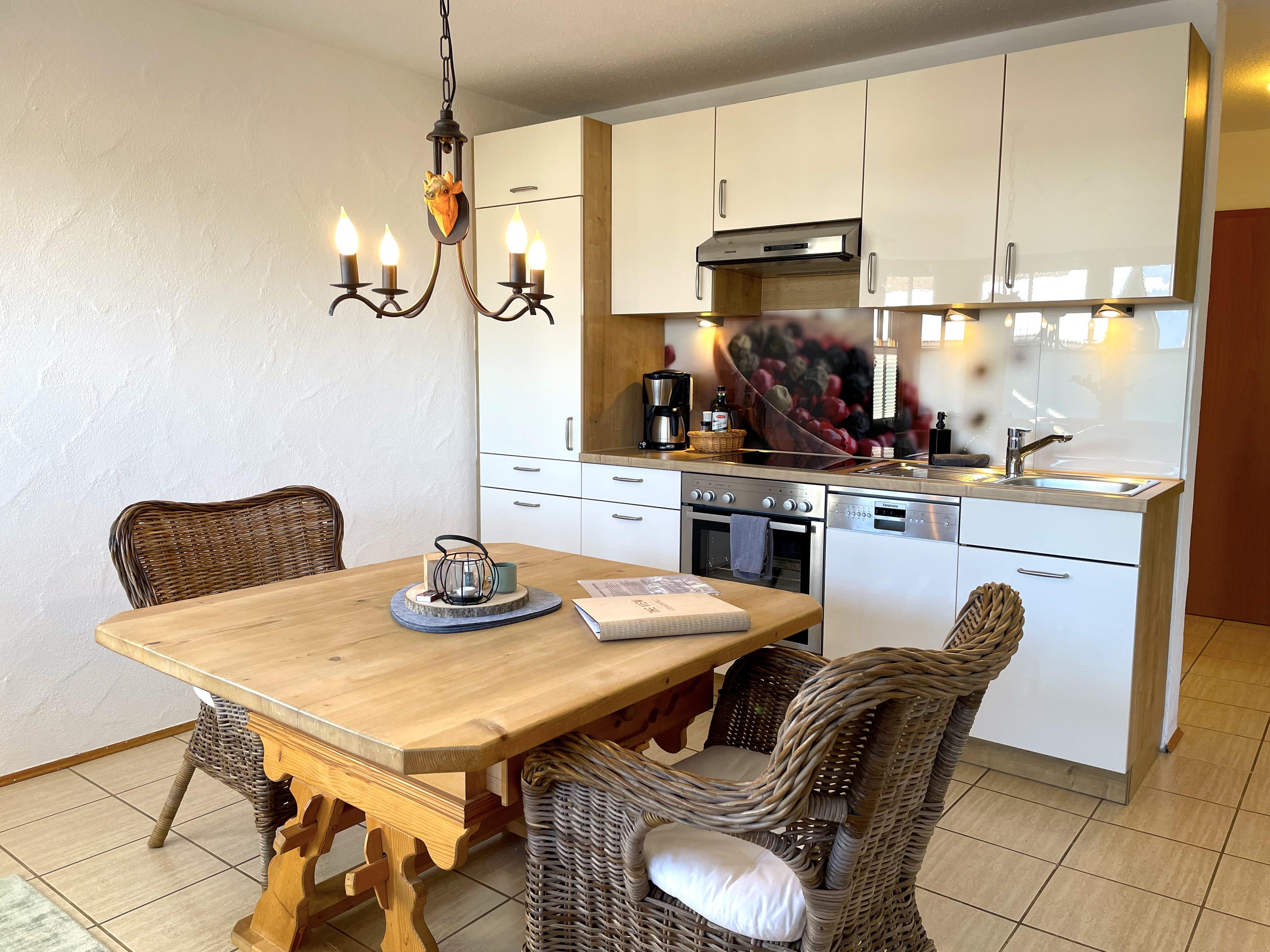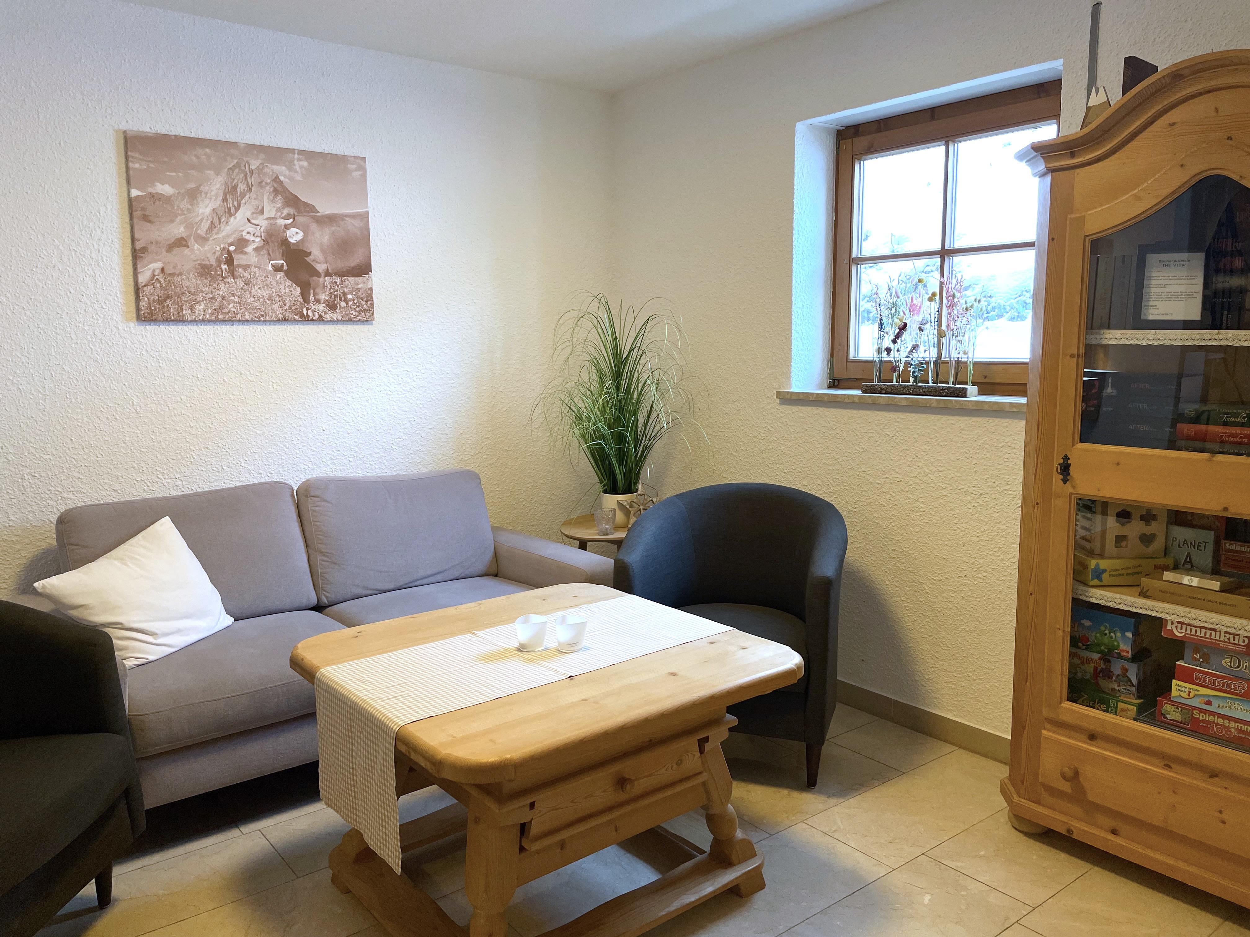 THE VIEW - Fewo Grünten Unsere 34m² große EG-Wohnung Grünten erwartet euch mit einem schönen Wohn-/Essbereich mit einer offenen und voll ausgestatteten Küche, die nahtlos in das Wohnzimmer mit einem echten Doppelbett und Couch übergeht, von der aus ihr einen wunderschönen Blick in die Berge genießen könnt. Über einen kleinen Flur gelangt ihr in das Badezimmer mit Dusche/WC.