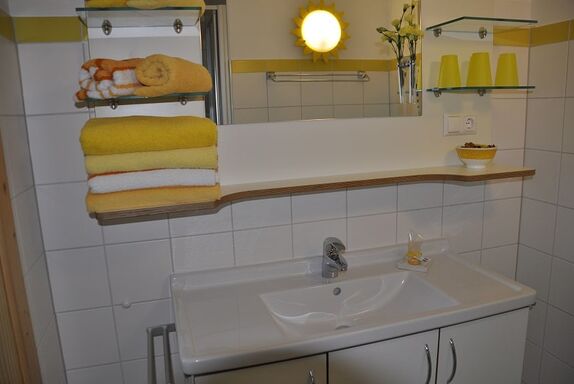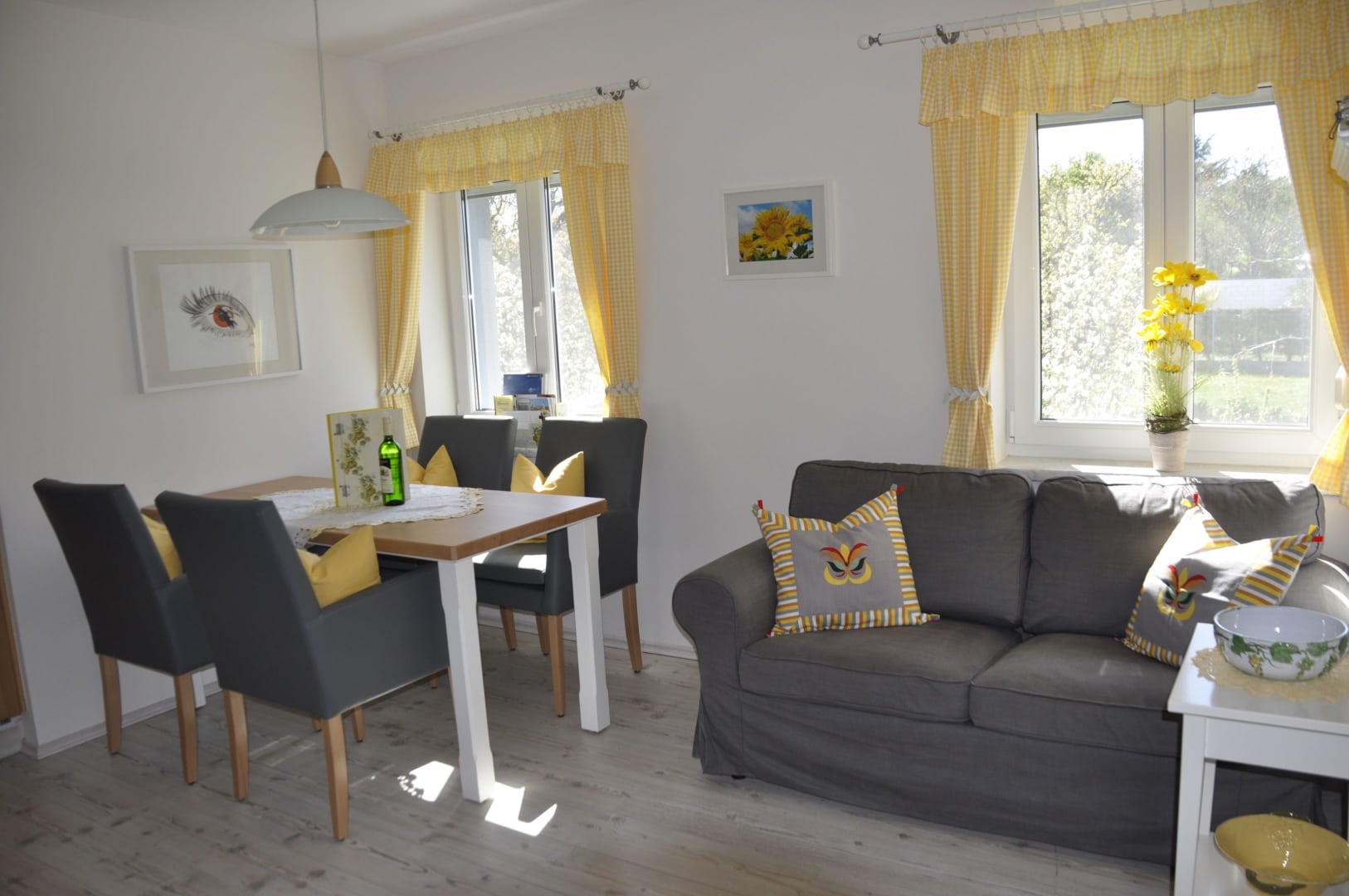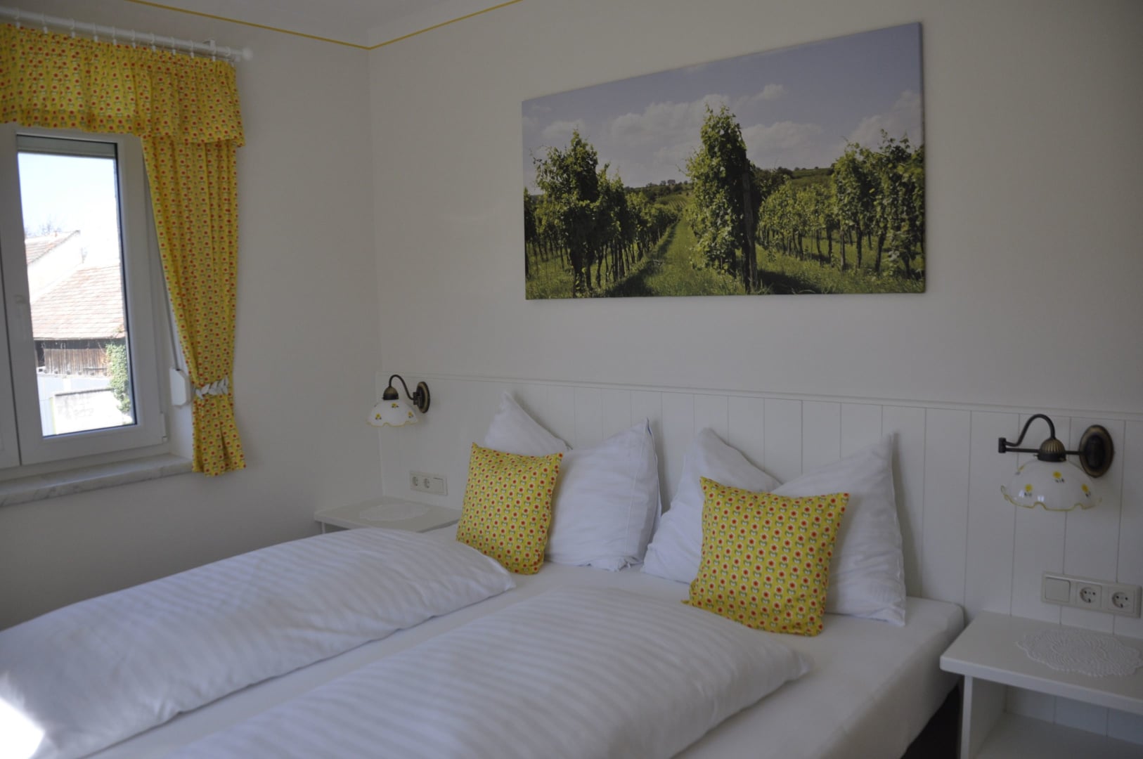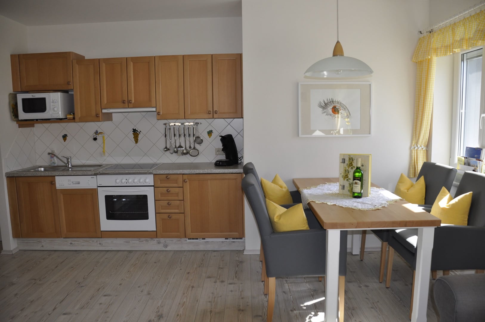 Unsere sonnige Ferienwohnung Chardonnay verfügt über ein Schlafzimmer, einer Wohnküche mit Fernsehsofa und einer Essecke. Badezimmer und WC sind getrennt. Zusätzliche Küchenausstattung: Geschirrspüler, Geschirr, eine Senseo-Kaffeemaschine für Softpads, Wasserkocher. Insektengitter. Bettwäsche, Hand- u. Duschtücher, Strom und Wasser inklusive. Wirless-Lan Internet kostenlos.