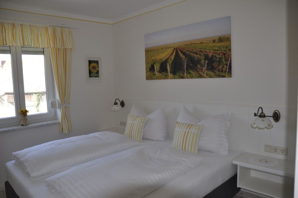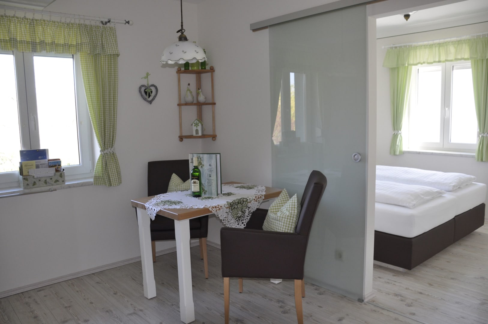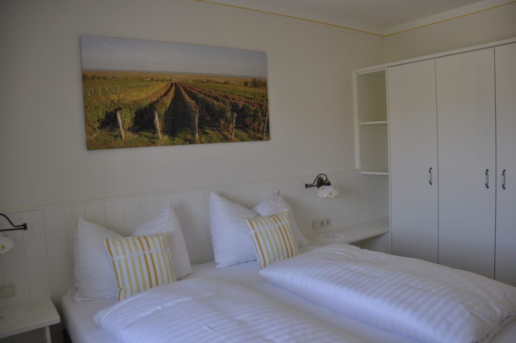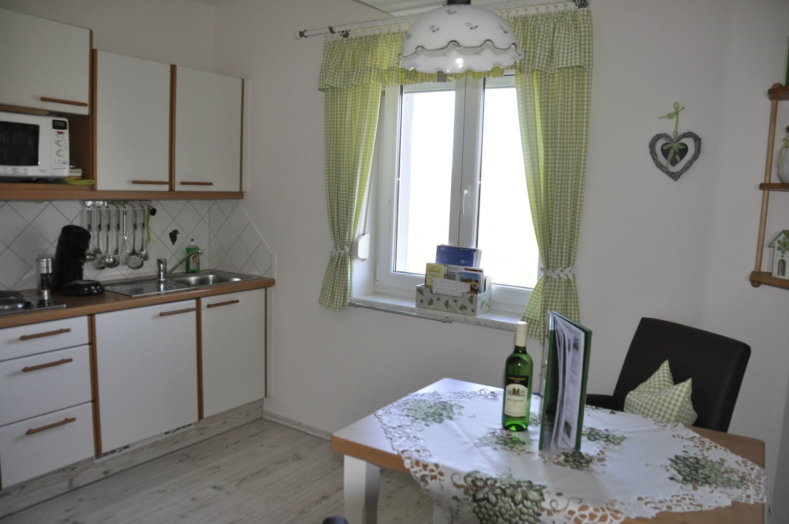 Unsere frische Ferienwohnung Welschrieslng verfügt über ein Schlafzimmer, einer Küche mit Essecke. Badezimmer und WC sind getrennt. Zusätlich ist die Küche mit einem 2-Platten-Herd, Geschirr, einer Senseo-Kaffeemaschine für Softpads u. einem Wasserkocher ausggestattet. Insektengitter. Bettwäsche, Hand- u. Duschtücher, Strom und Wasser inklusive. Wirless-Lan Internetzugang kostenlos