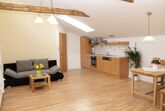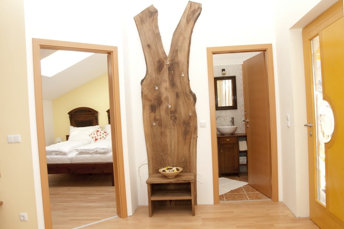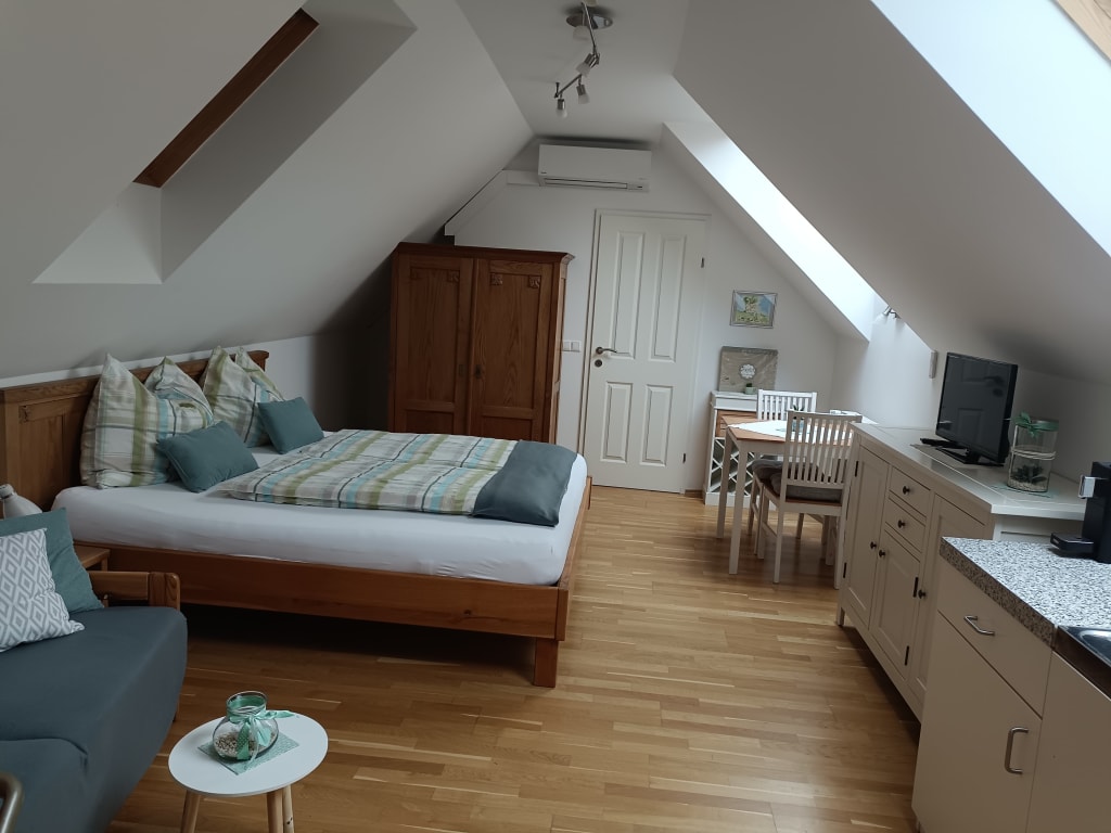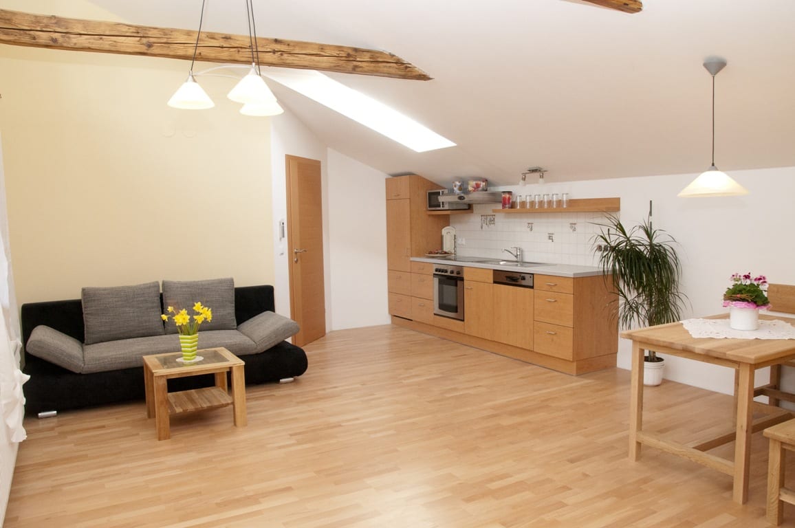 Unsere mit Naturholz eingerichtete Wohnung ist eine gelungene Kombination von alten Sitl-Möbeln mit moderner Architektur und lädt zum Träumen ein.