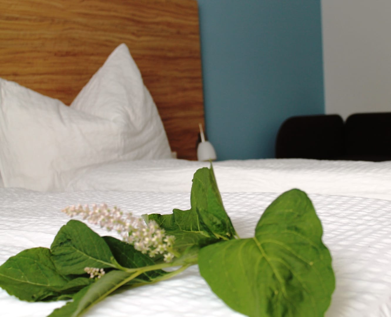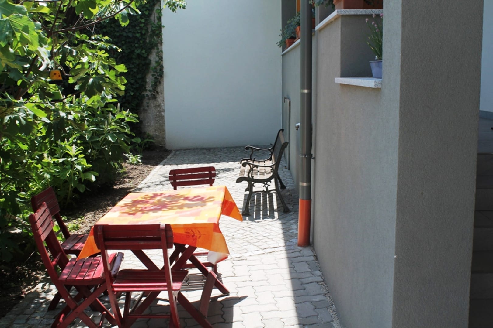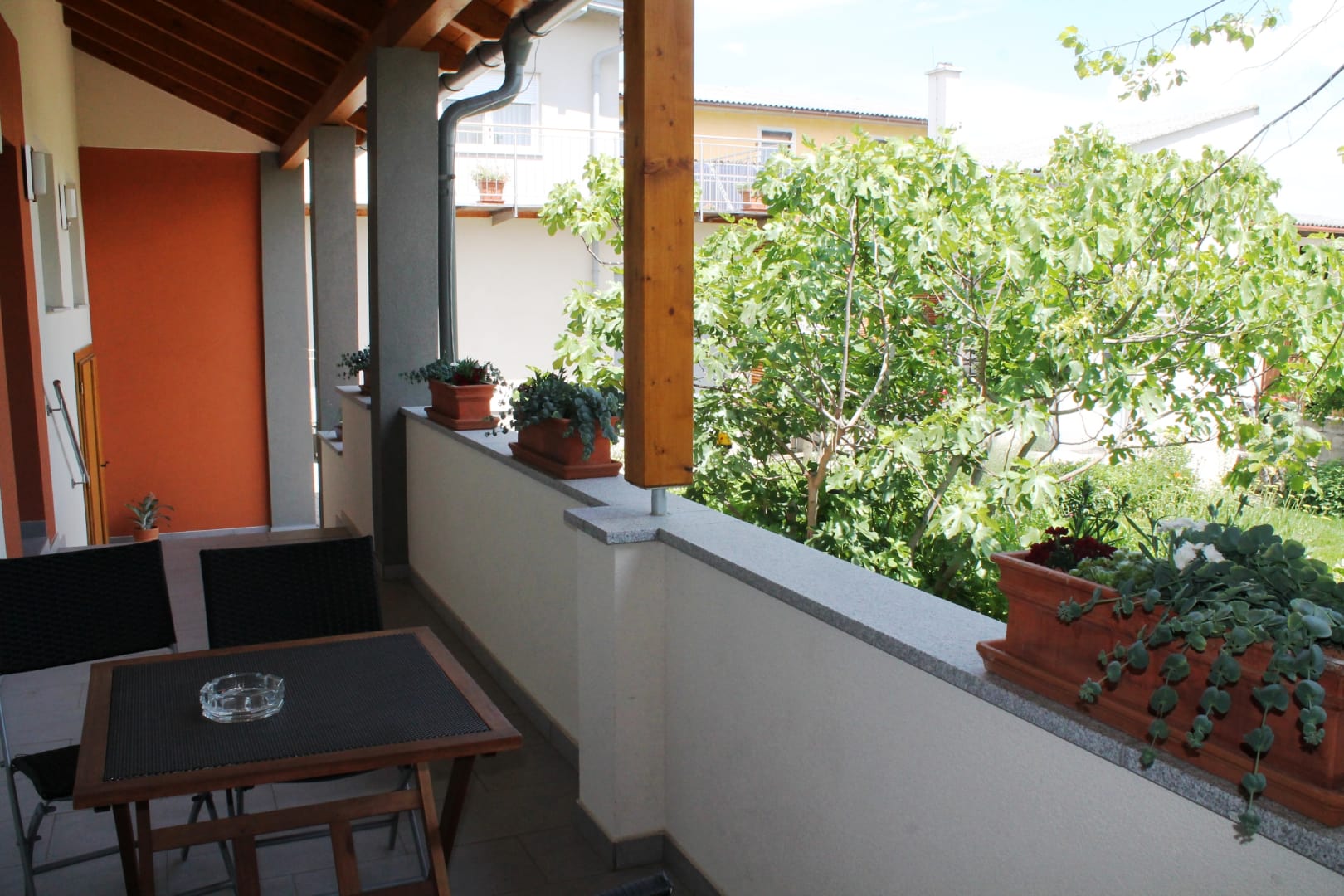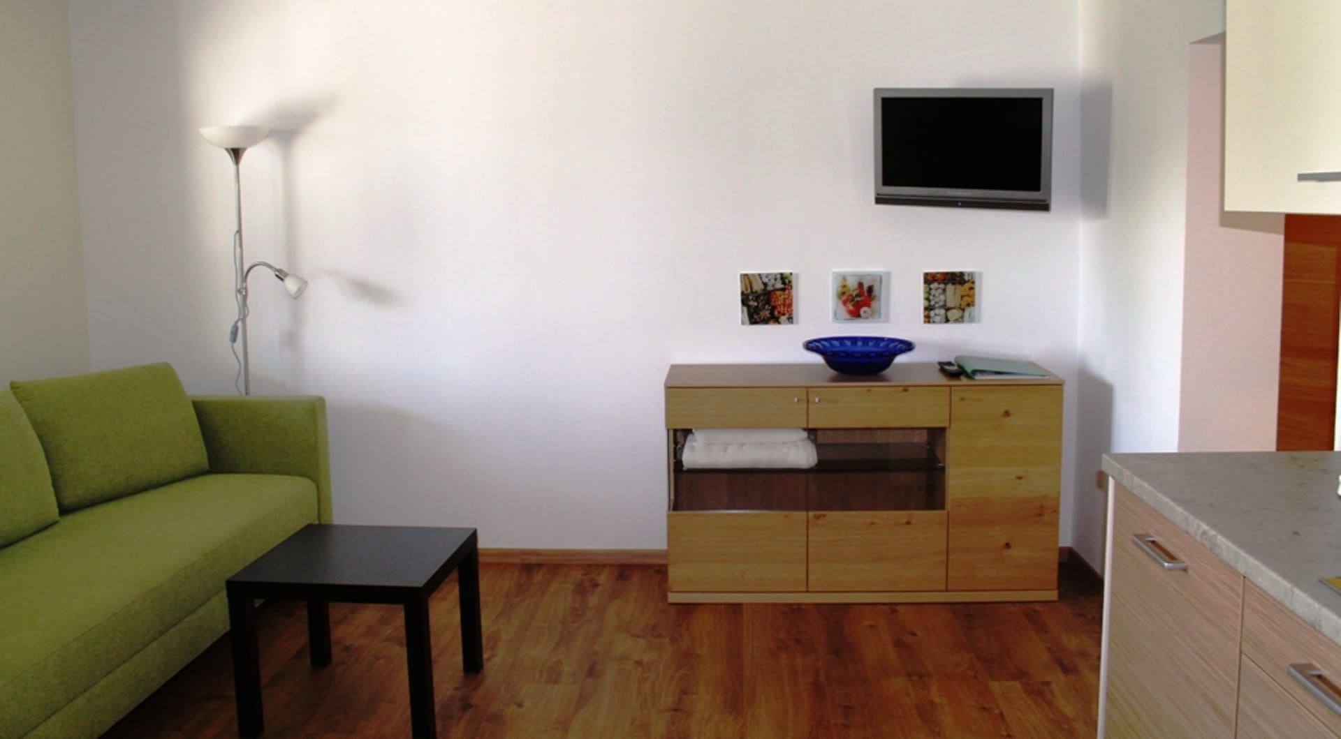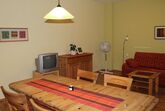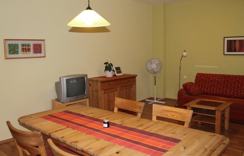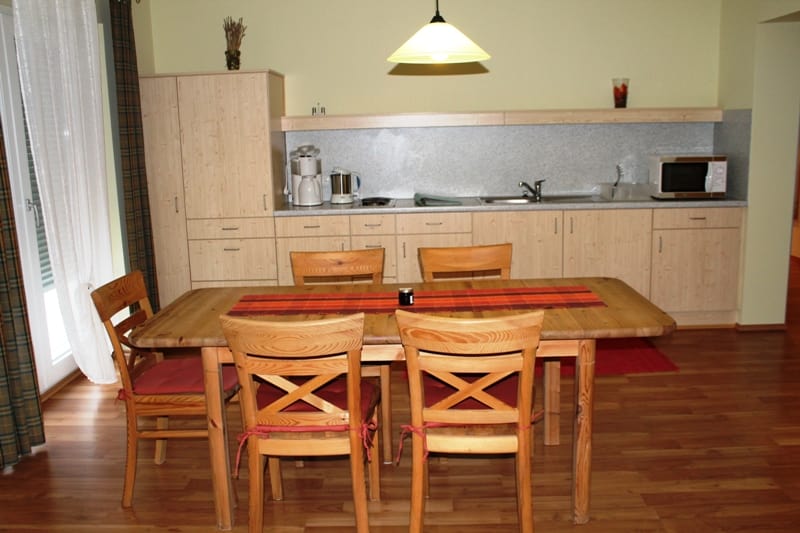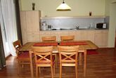 Die Ferienwohnung ist mit 70m² für bis zu 5 Personen geeignet. Sie verfügt über ein Doppelzimmer mit Zusatzbett und einem Doppelschlafsofa im Wohnbereich. Das Badezimmer ist mit Dusche und Badewanne ausgestattet, Wc extra. Die Küche ist komplett eingerichtet und mit Sitzgelegenheit für 5 Personen ausgestattet. Über einen Balkon kommt man zu einer großen Dachterasse mit Sitzgelegenheit, Sonnenschirm und Sonnenliegen.