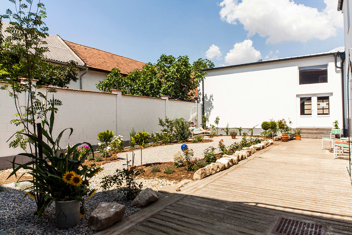 Da die ganze Familie sehr naturverbunden ist, haben wir nur ökologische Baustoffe verwendet und mit viel Liebe zum Detail das Haus gestaltet. Dazu gehört ein auch ruhiger Innenhof mit einem schönen Blumengarten.