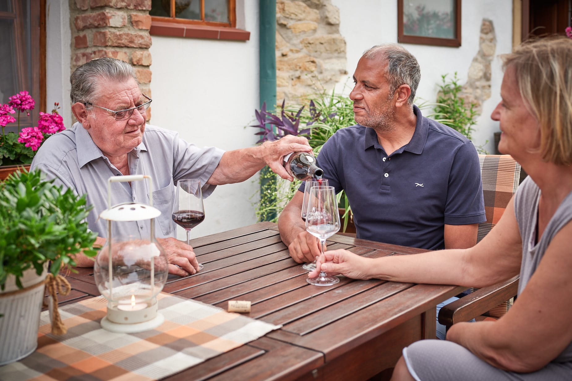 Nach einer erfolgreichen Fahrradtour, einem Badetag am Neusiedlersee oder einfach einem ruhigen Urlaubstag in unserer Umgebung lädt unsere überdachte Laube, die Sonnenterrasse oder ein lauer Sommerabend unter freiem Himmel zu einem genussvollen Glas Wein ein. Dabei trifft man meistens auf die Jungwinzerin Hannah, Anita und Rudi oder die Großeltern im Haus Martha und Leopold, der gerne Geschichten von früher erzählt.