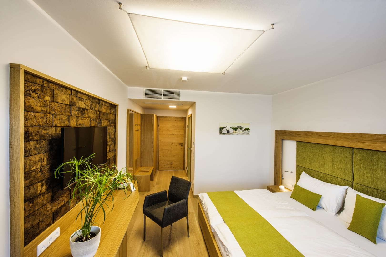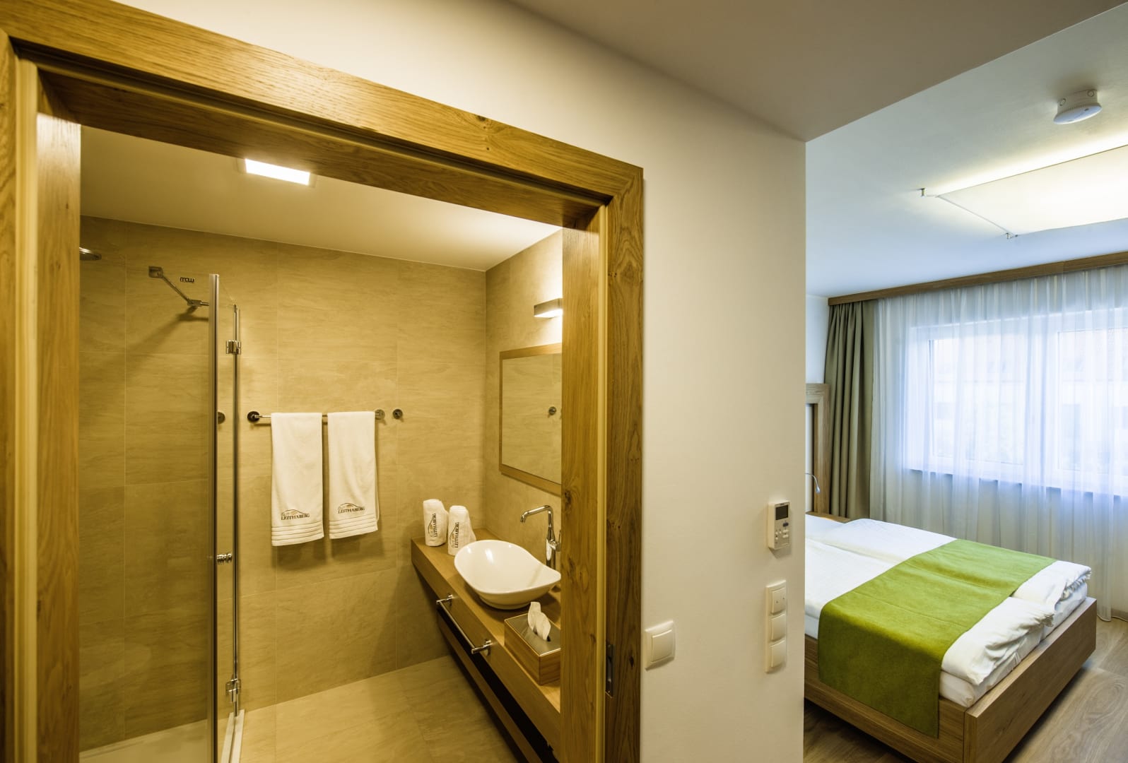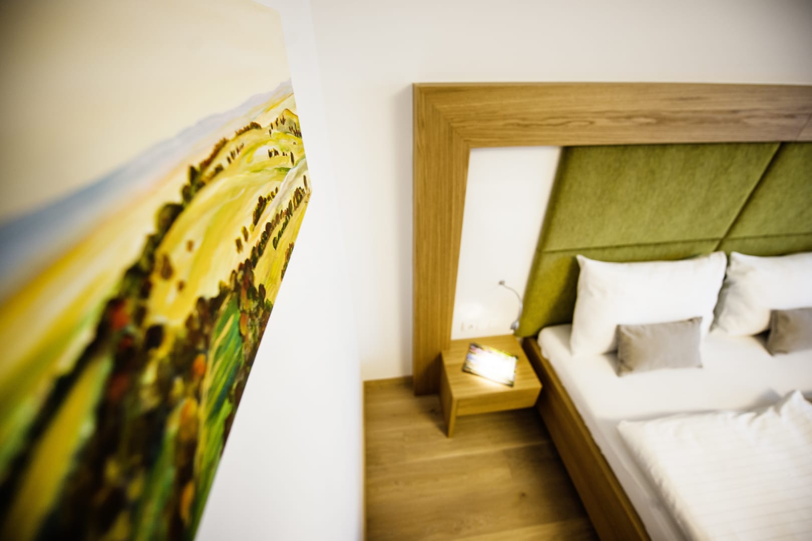 Edle heimische Eichenholzmöbel und Wandverkleidungen aus Naturkork, naturgeölte Eichenböden sowie dekorative Stoffe und stimmungsvolle Bilder sind für alle Sinne wahrnehmbar.