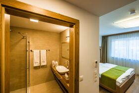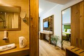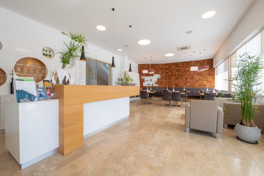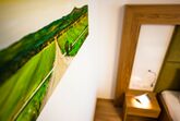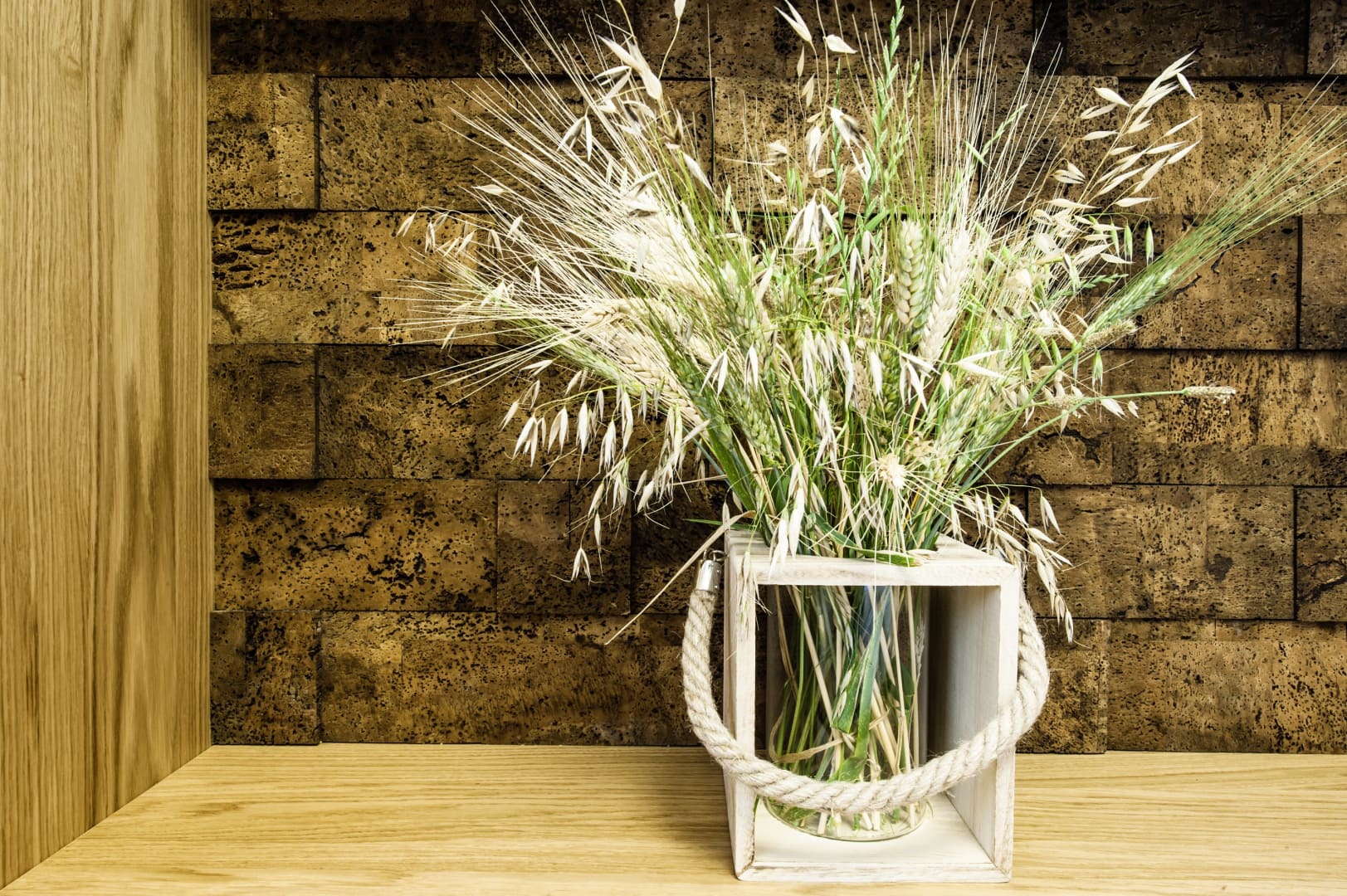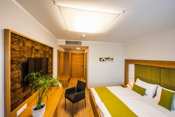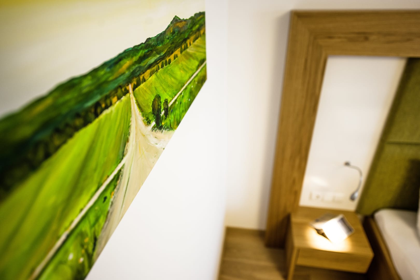 Edle heimische Eichenholzmöbel und Wandverkleidungen aus Naturkork, naturgeölte Eichenböden sowie dekorative Stoffe und stimmungsvolle Bilder sind für alle Sinne wahrnehmbar.