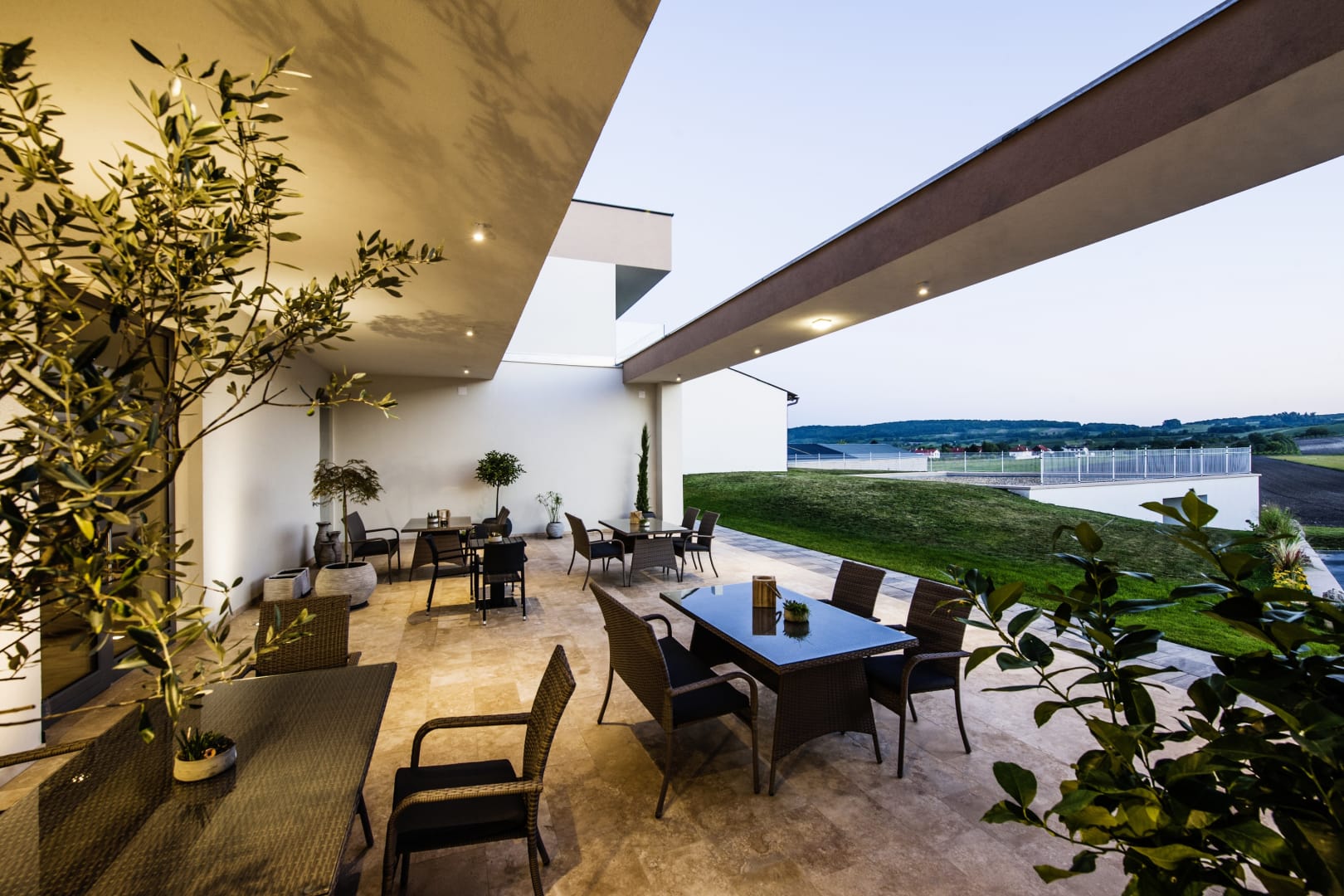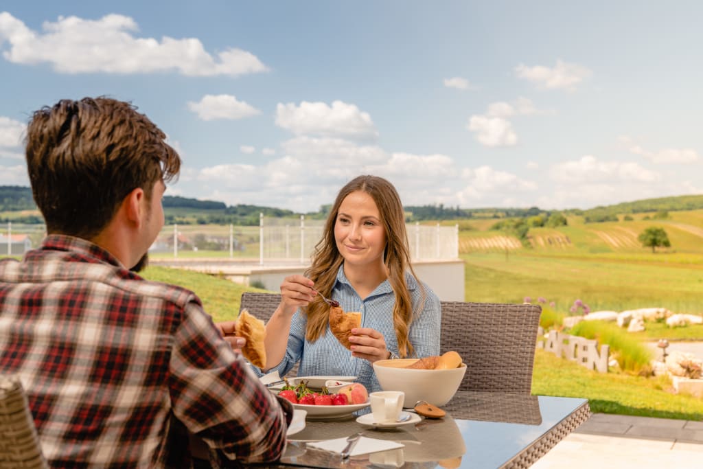 Genießen Sie ein reichhaltiges, regionales Frühstücksbuffet mit selbstgemachten Produkten auf unserer überdachten Wohlfühlterrasse mit einzigartigem Panoramablick über die Weingärten und das Leithagebirge.