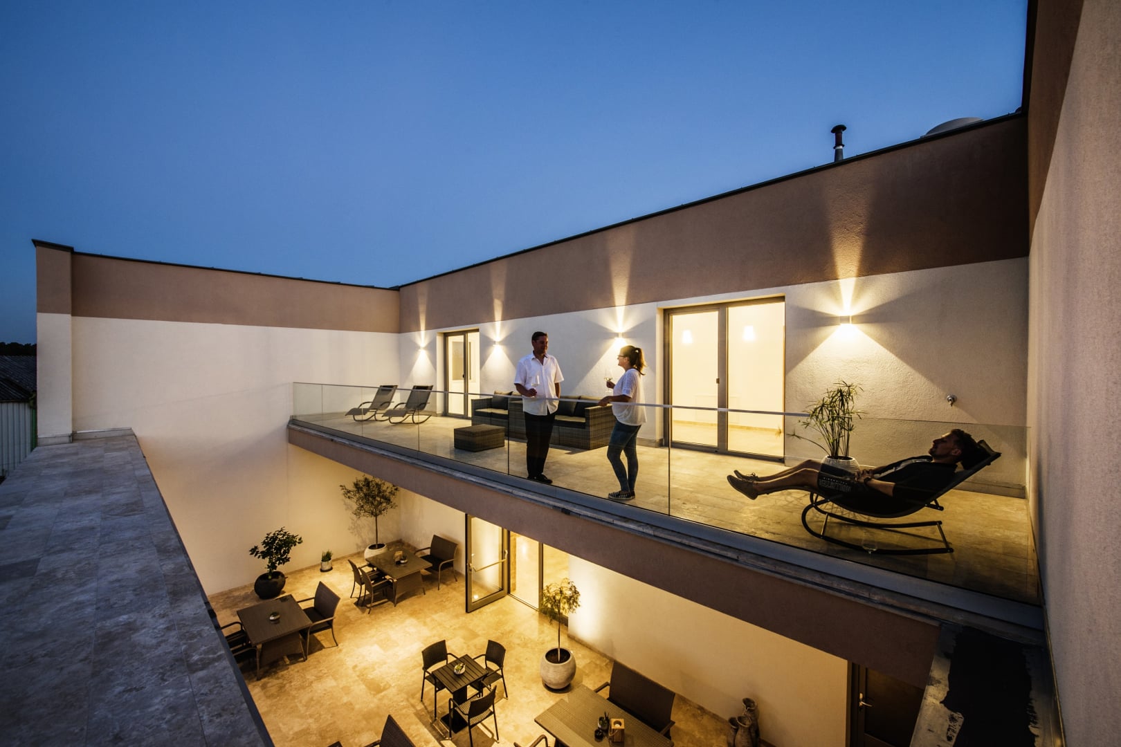 Die edle sehr exklusive Ausstattung aus heimischen Eichenholz, Muschelkalkböden, Wandverkleidungen aus Naturkork und ein romantischer Kamin laden zum Wohlfühlen ein.