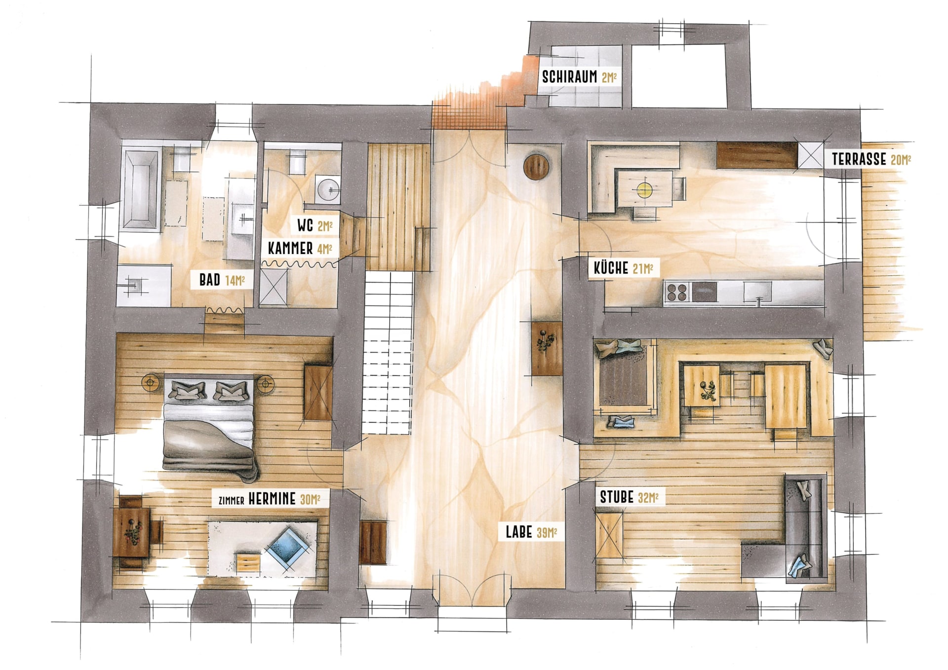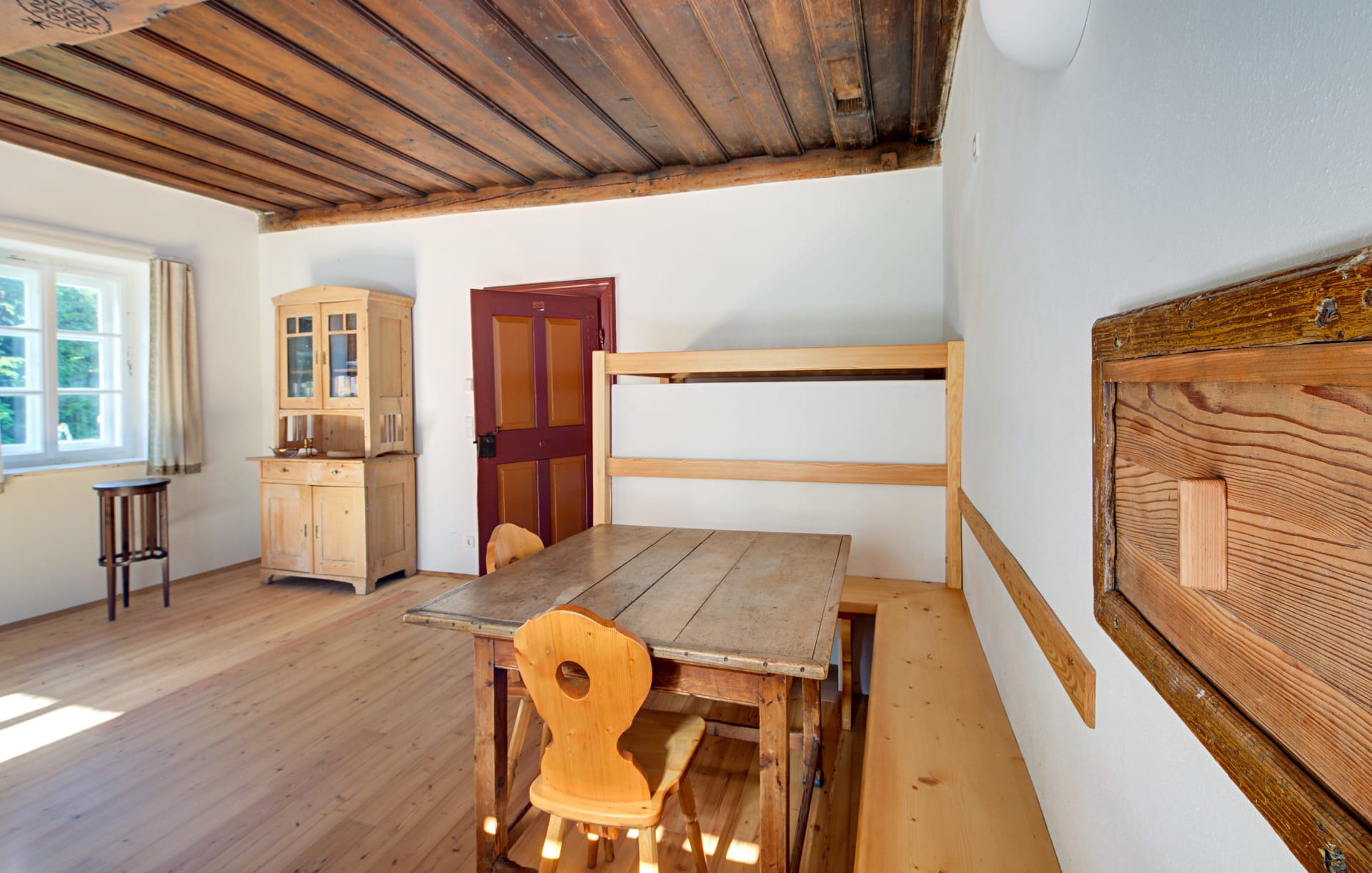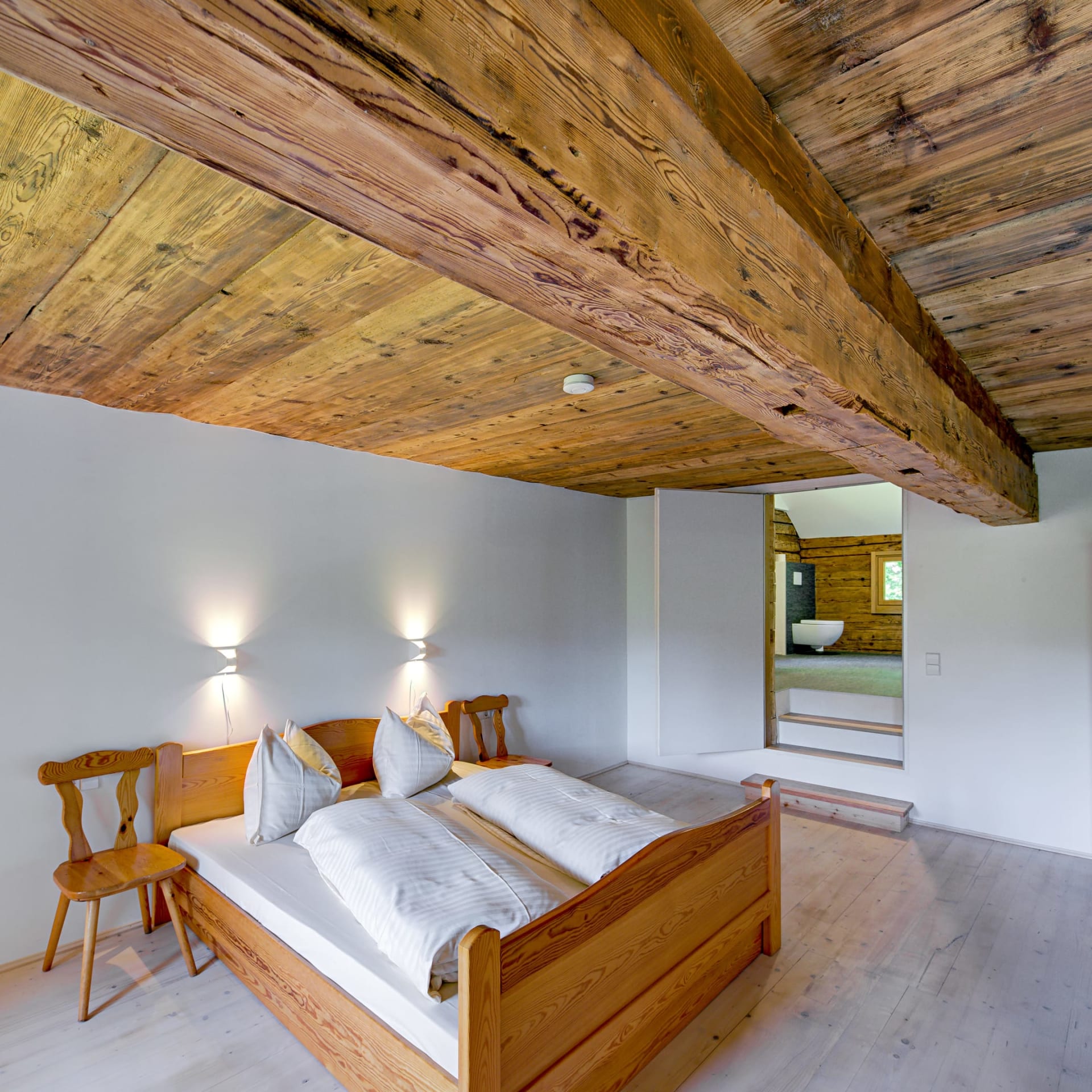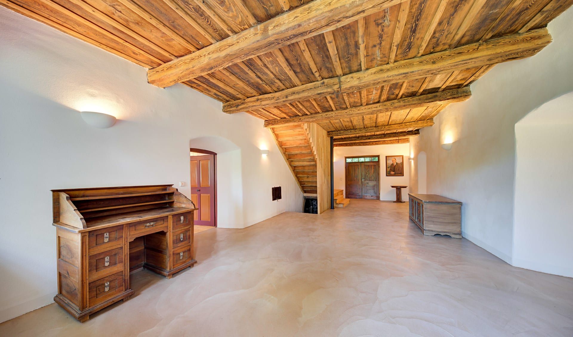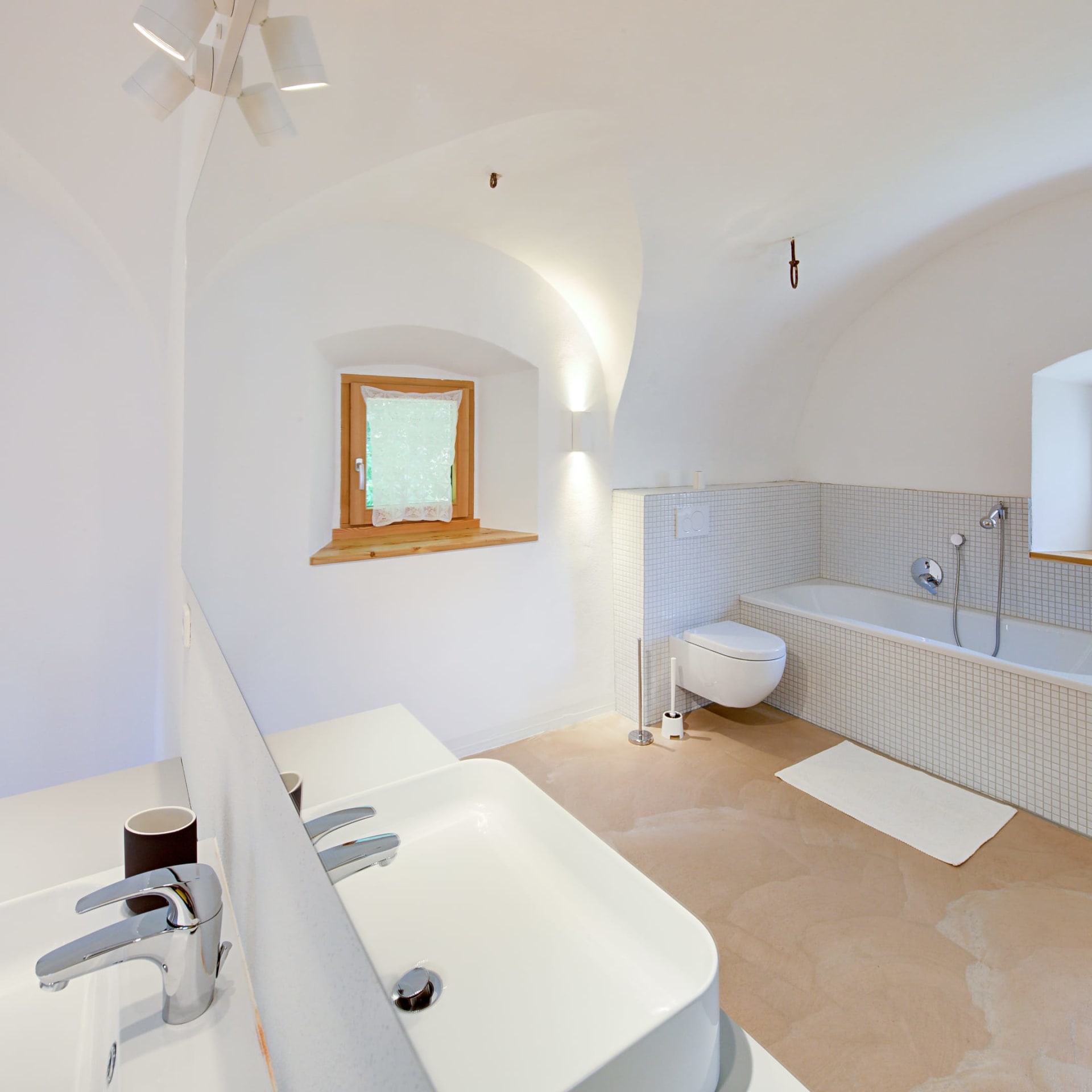 Vier großzügige Schlafzimmer, drei große Badezimmer, Tages-WC, voll ausgestattete Küche mit Terrasse, Stube mit Bauernofen und traditioneller Ofenbank.