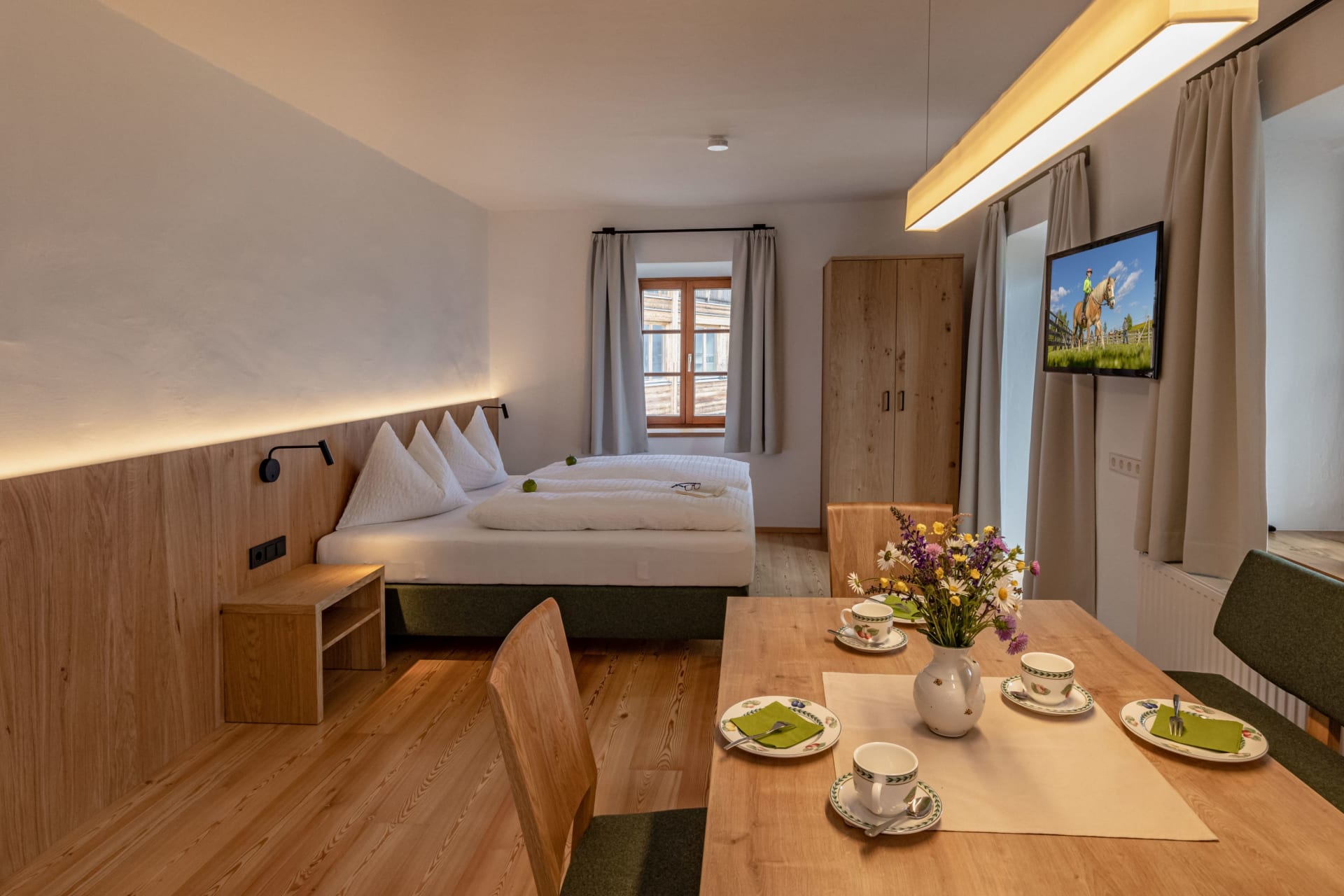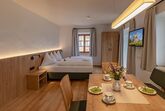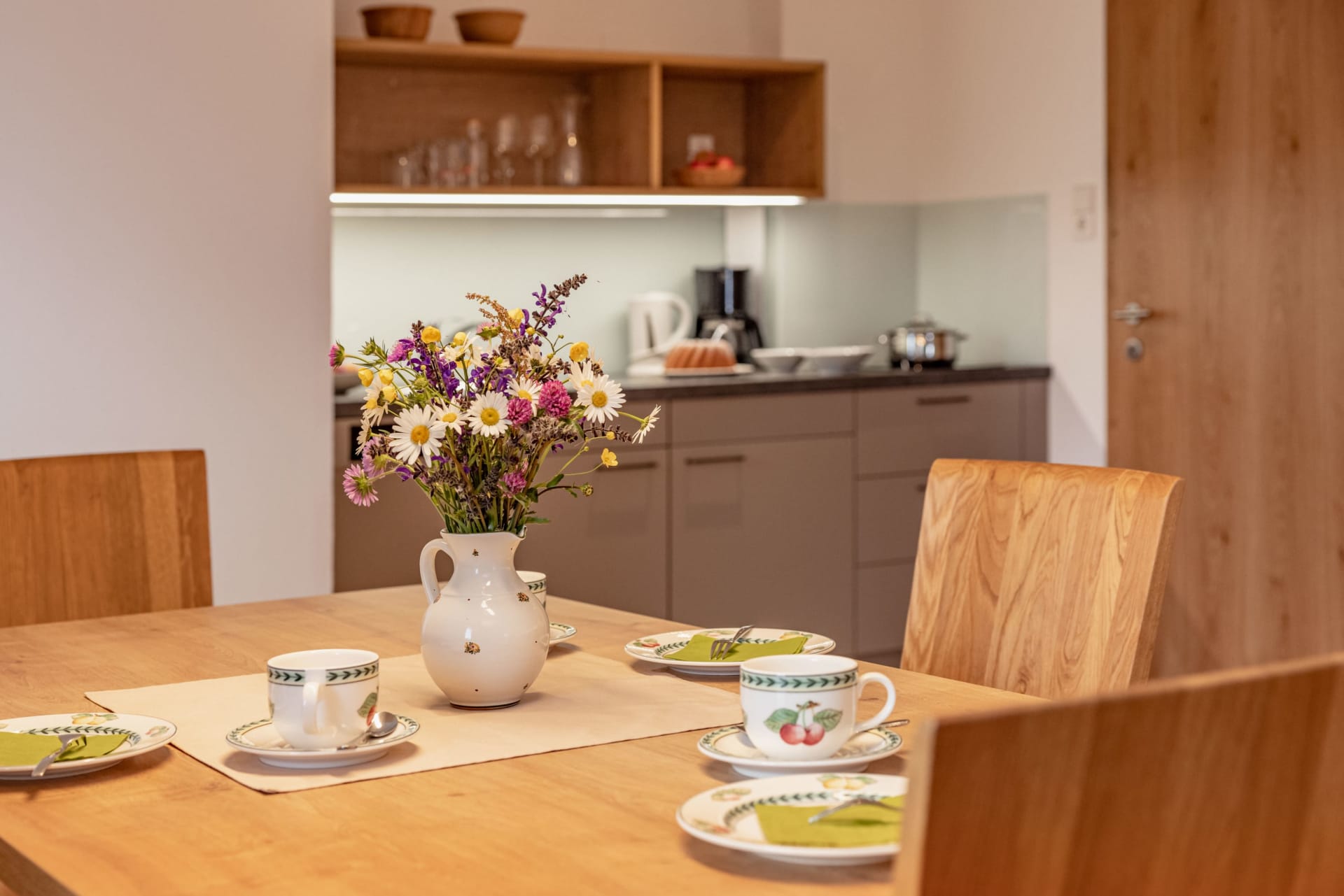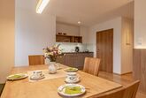 Der helle Wohn-Essbereich mit edlen Naturholzböden bietet reichlich Platz für gemeinsame Momente und lädt zum Verweilen ein. Die komplett ausgestattete Küche lässt keine Wünsche offen: Freuen Sie sich auf ein Cerankochfeld, Kühlschrank, Geschirrspüler, Wasserkocher, Filter-Kaffeemaschine, Toaster sowie umfangreiches Koch- und Essgeschirr, Geschirrtücher und Schneidbretter.