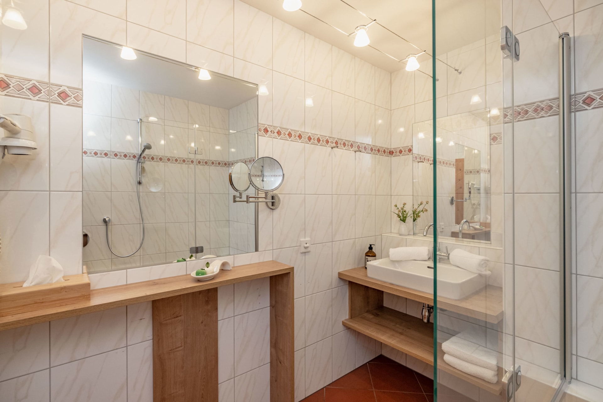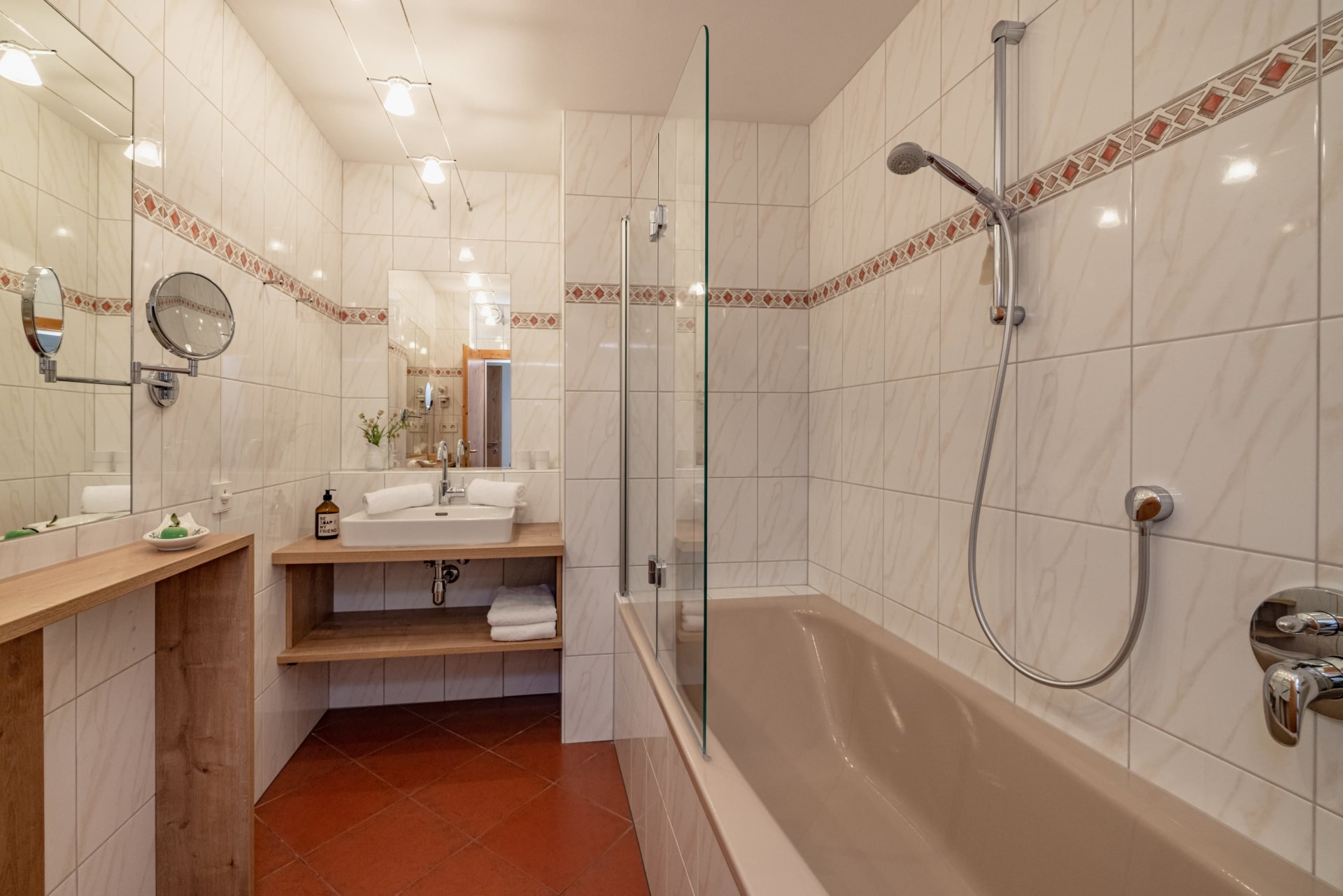 Zwei moderne Badezimmer sorgen für zusätzlichen Komfort: Eines mit Dusche und WC, das andere mit Badewanne, Dusche und elegantem Waschtisch. Ein Föhn und Kosmetikspiegel sind ebenfalls vorhanden. Auf Wunsch stellen wir Ihnen gerne eine Kleinkindausstattung zur Verfügung.