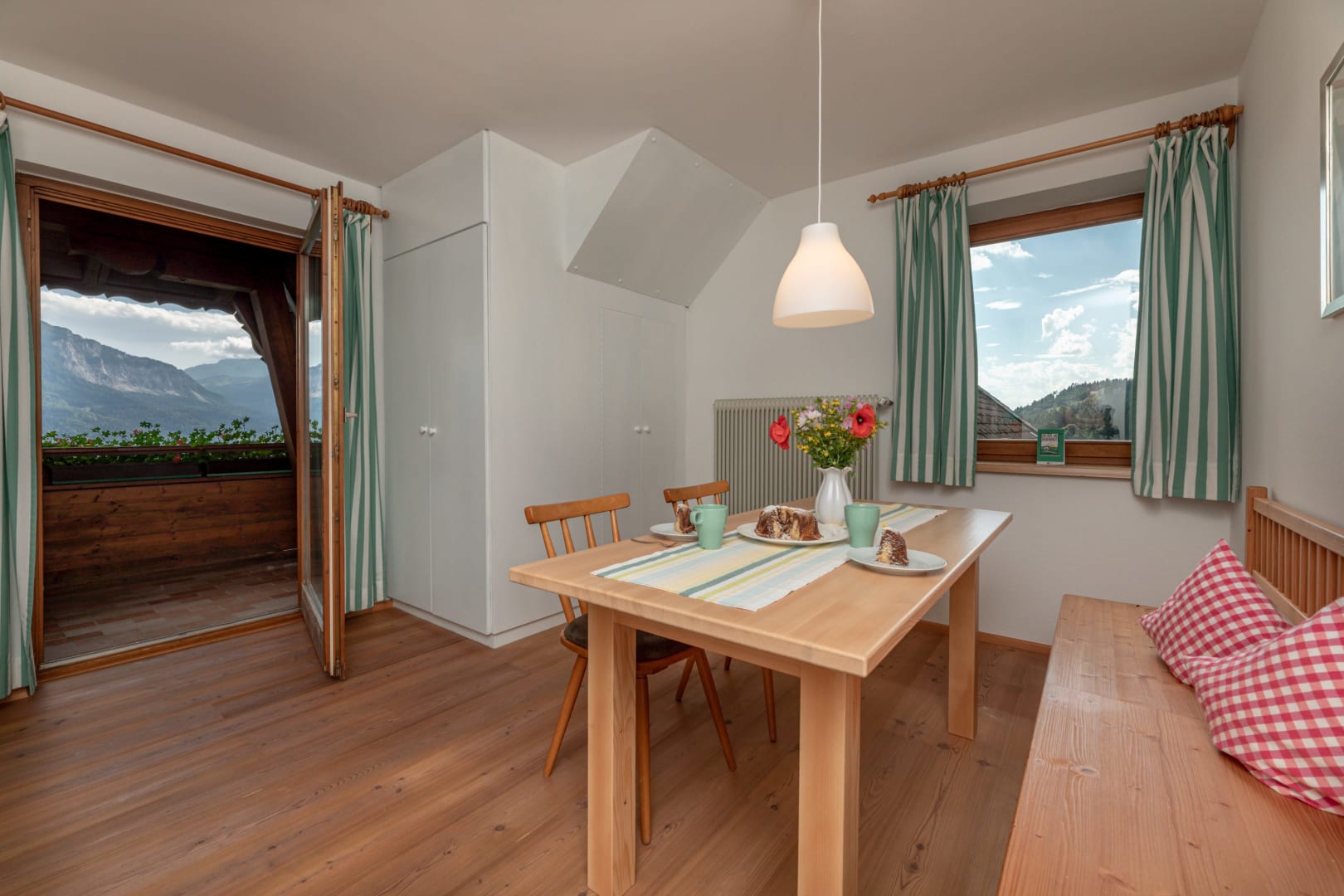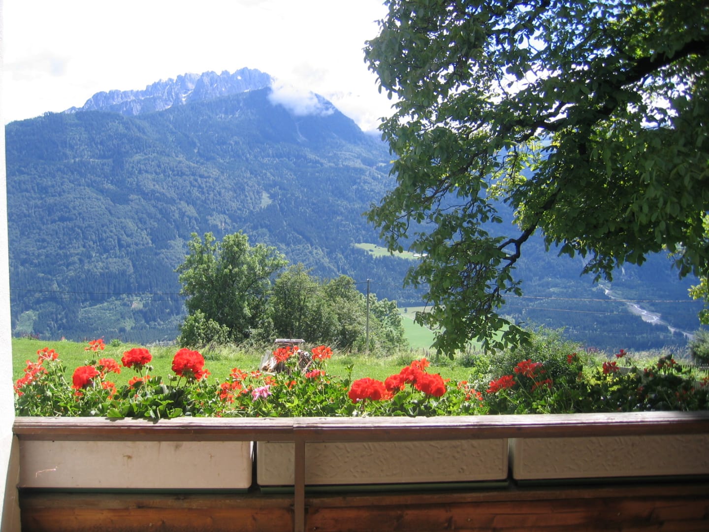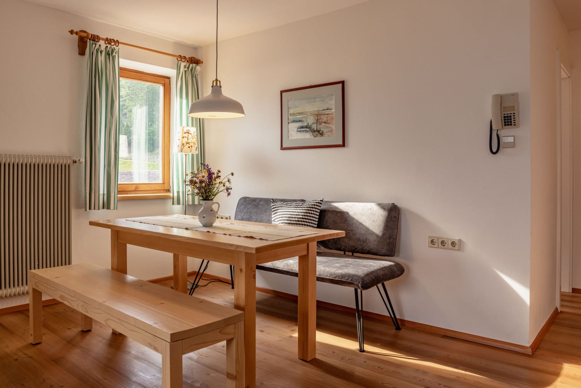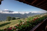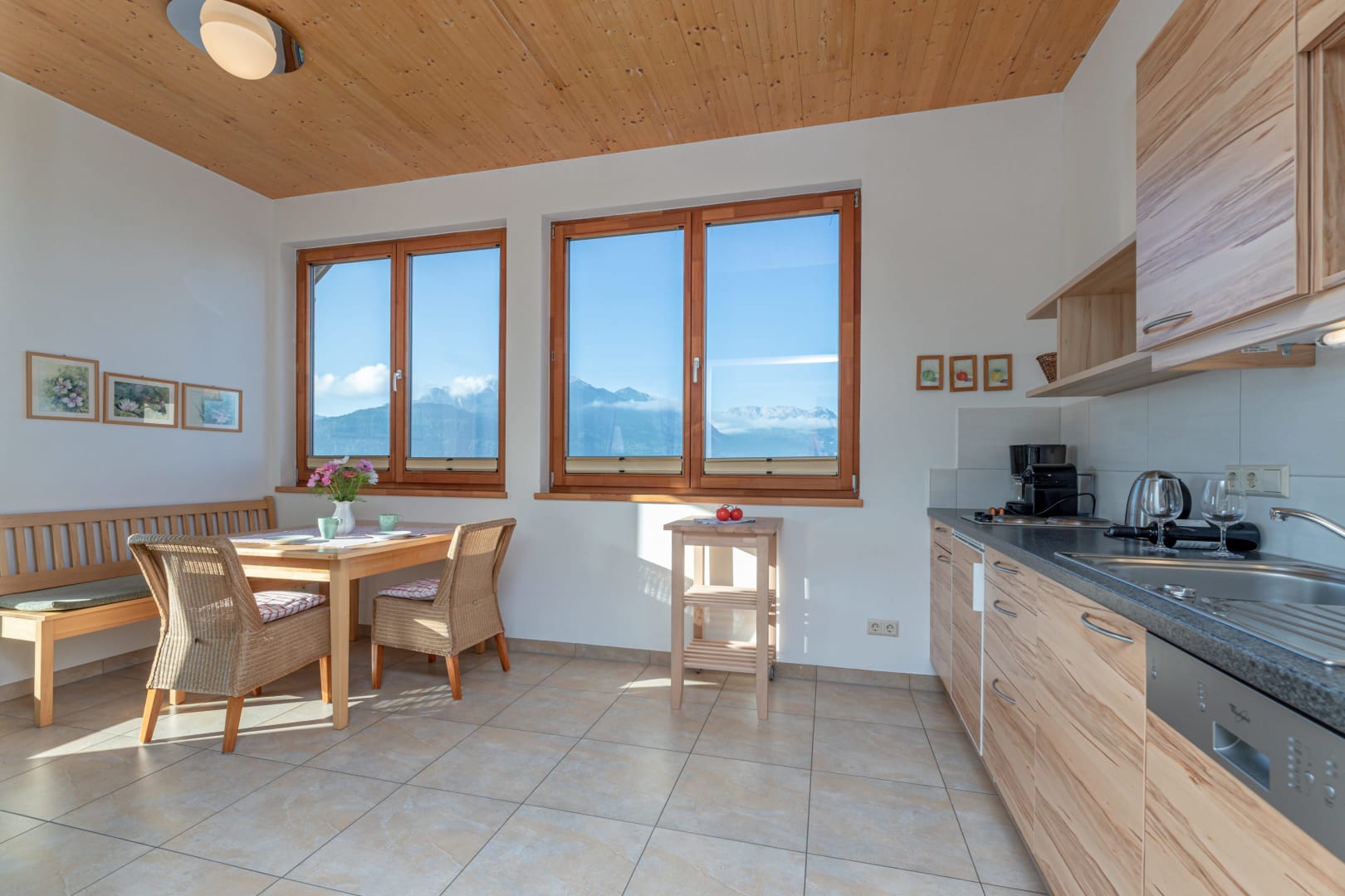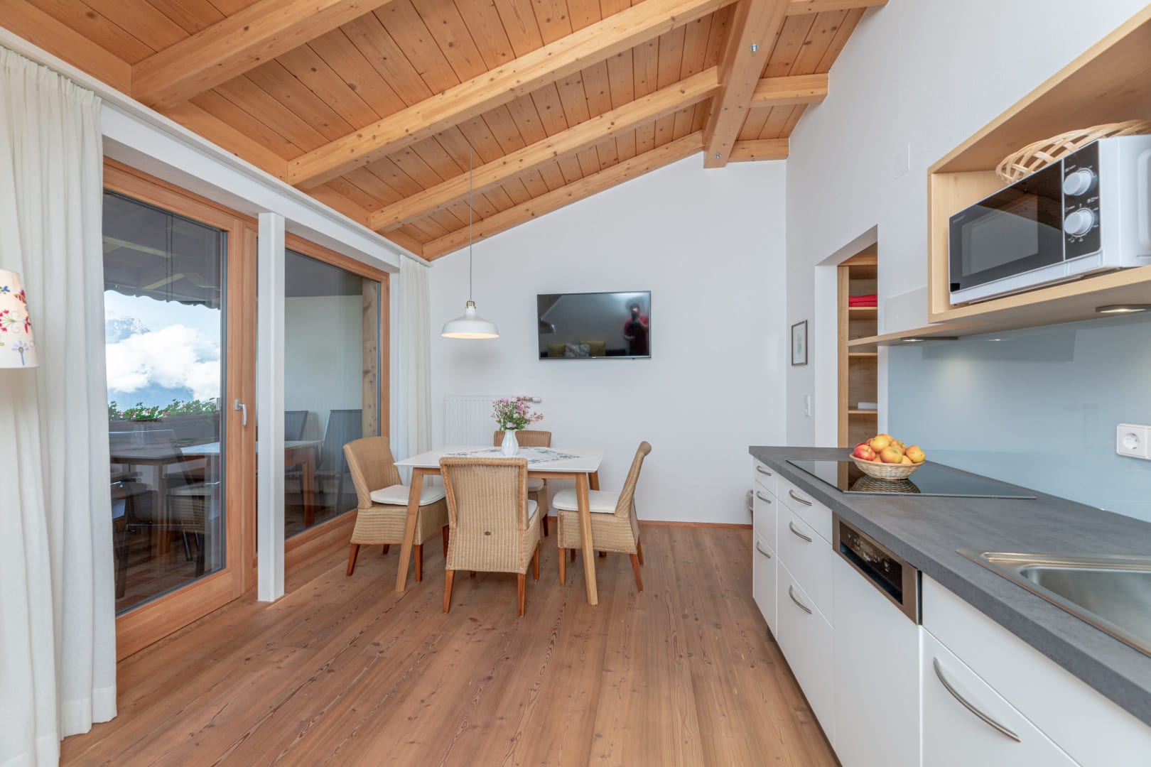 Ihre Oase mit Bergblick: Geräumige Ferienwohnung (59 m²) Willkommen in Ihrer großzügigen und hellen Ferienwohnung im 2. Stock unseres Haupthauses, eine perfekte Wahl für Familien und Freunde. Hier erwartet Sie ein Zuhause auf Zeit, das keine Wünsche offenlässt. Treten Sie hinaus auf Ihren weitläufigen Süd- und Westbalkon und lassen Sie sich von der atemberaubenden Aussicht auf die majestätische Berglandschaft verzaubern. Ein Wäscheständer ist für Ihre Bequemlichkeit am Balkon vorhanden, damit Sie die frische Bergluft nutzen können. Der einladende Wohn- und Essbereich, ausgestattet mit stilvollen Naturholzböden, bildet den gemütlichen Mittelpunkt der Wohnung. Die separate, komplett ausgestattete Küche lässt keine kulinarischen Wünsche offen. Sie verfügt über ein modernes 4-Platten-Cerankochfeld, Kühlschrank, Geschirrspüler, Mikrowellenherd, Wasserkocher, Filter-Kaffeemaschine, Toaster sowie eine umfassende Auswahl an Koch- und Essgeschirr, Geschirrtüchern und Schneidbrettern. Perfekt, um gemeinsame Mahlzeiten zuzubereiten und diese dann auf dem Balkon mit Panoramablick zu genießen. Zwei separate Schlafzimmer garantieren erholsamen Schlaf für alle Gäste. Das Hauptschlafzimmer lockt mit einem luxuriösen Boxspringbett (Kingsize-Format), während das Kinderzimmer mit zwei komfortablen Einzelbetten ausgestattet ist. Hochwertige Bettwäsche und flauschige Handtücher liegen selbstverständlich für Sie bereit. Das moderne Badezimmer überzeugt mit einer begehbaren Dusche, einem Föhn und einem praktischen Kosmetikspiegel. Das WC ist separat angelegt. Auf Wunsch stellen wir Ihnen gerne eine passende Kleinkindausstattung (inklusive Kinderbett) zur Verfügung. Für Ihre Unterhaltung und Kommunikation sorgen ein Sat-TV, kostenloses WLAN . Ihre Wertsachen können Sie sicher im vorhandenen Safe verwahren. Ein kostenloser Parkplatz direkt am Haus rundet das Angebot ab. Beginnen Sie Ihren Tag entspannt mit unserem praktischen Brötchenservice.