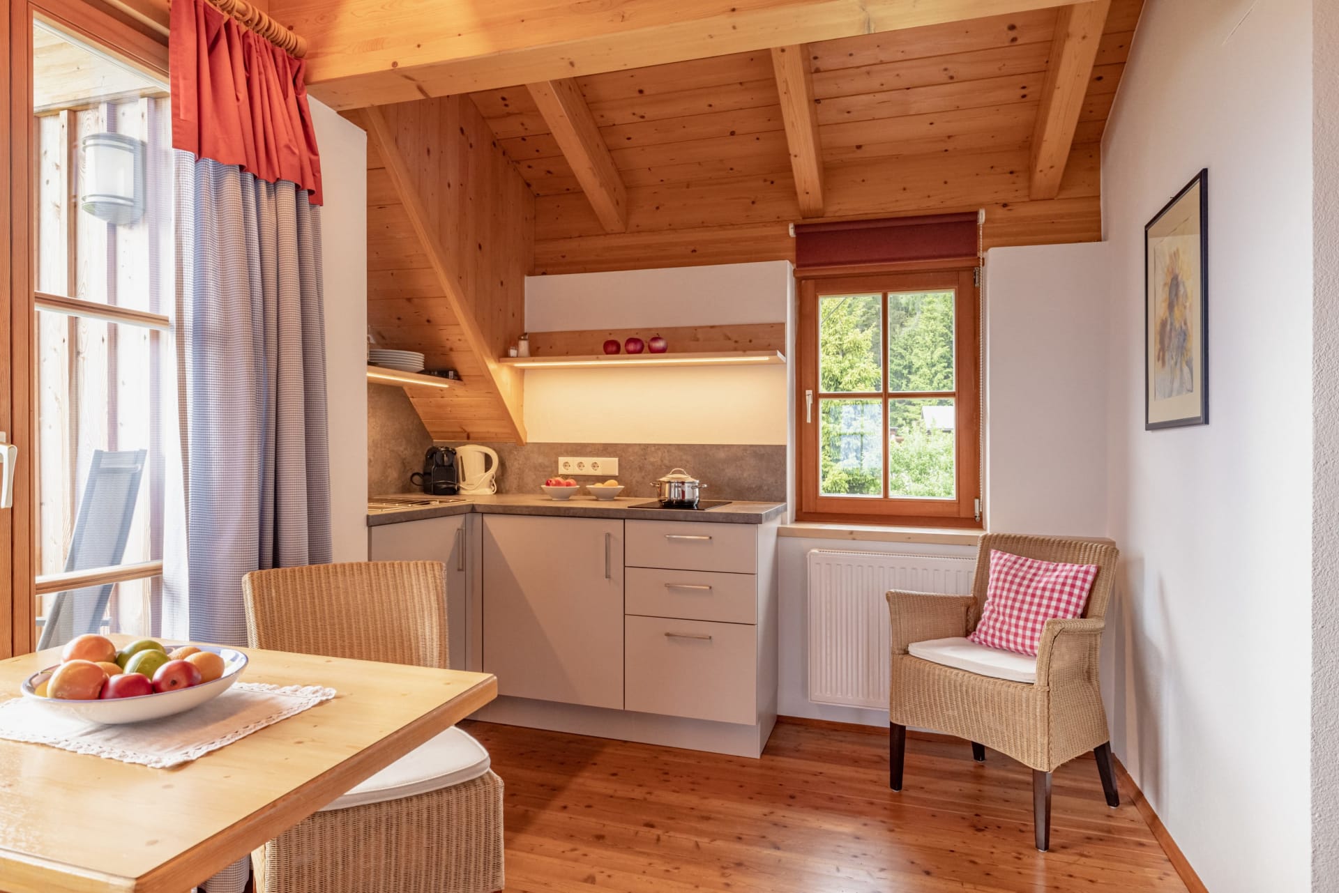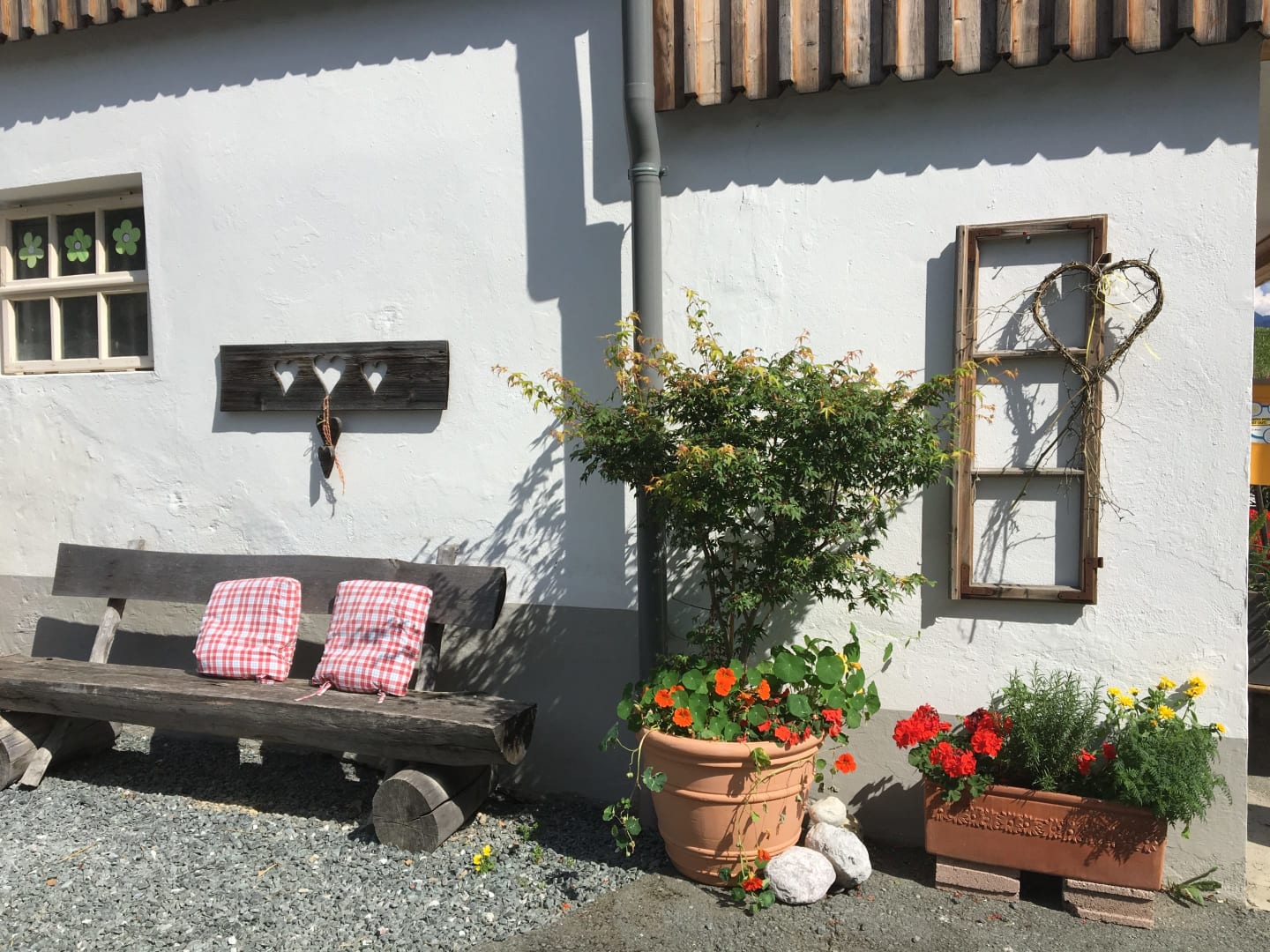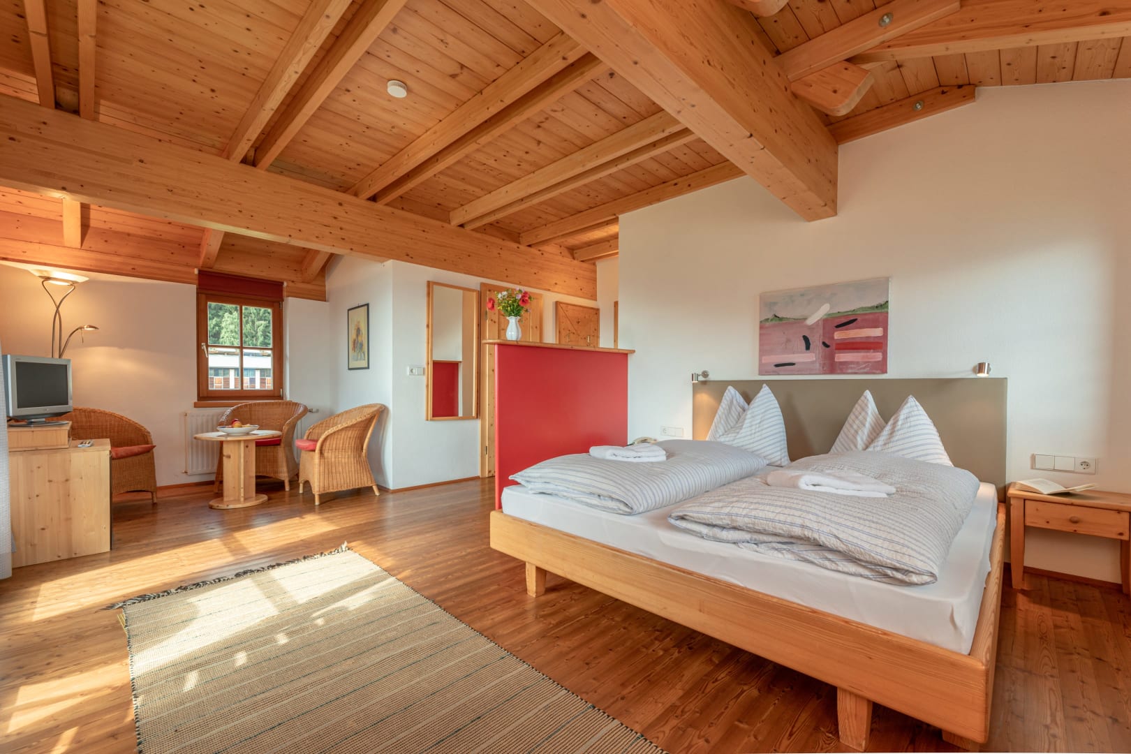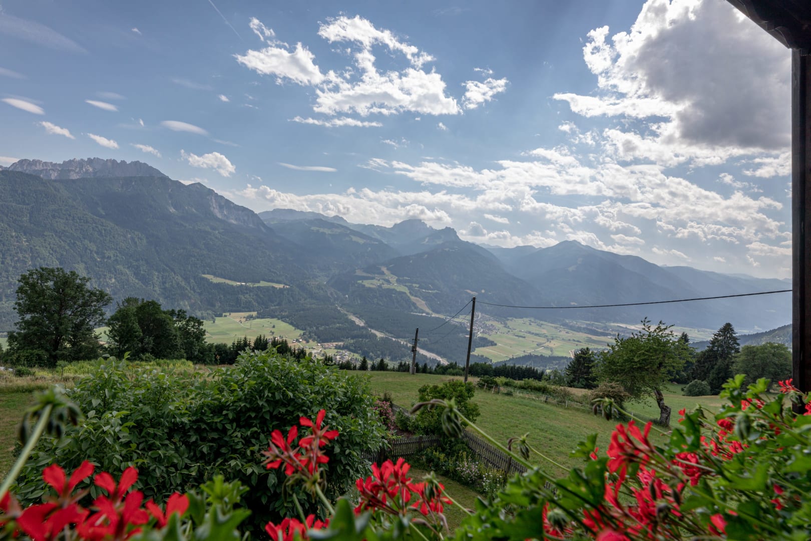 Ihre Oase mit Bergblick: Geräumige Ferienwohnung (59 m²) Willkommen in Ihrer großzügigen und hellen Ferienwohnung im 2. Stock unseres Haupthauses, eine perfekte Wahl für Familien und Freunde. Hier erwartet Sie ein Zuhause auf Zeit, das keine Wünsche offenlässt. Treten Sie hinaus auf Ihren weitläufigen Süd- und Westbalkon und lassen Sie sich von der atemberaubenden Aussicht auf die majestätische Berglandschaft verzaubern. Ein Wäscheständer ist für Ihre Bequemlichkeit am Balkon vorhanden, damit Sie die frische Bergluft nutzen können. Der einladende Wohn- und Essbereich, ausgestattet mit stilvollen Naturholzböden, bildet den gemütlichen Mittelpunkt der Wohnung. Die separate, komplett ausgestattete Küche lässt keine kulinarischen Wünsche offen. Sie verfügt über ein modernes 4-Platten-Cerankochfeld, Kühlschrank, Geschirrspüler, Mikrowellenherd, Wasserkocher, Filter-Kaffeemaschine, Toaster sowie eine umfassende Auswahl an Koch- und Essgeschirr, Geschirrtüchern und Schneidbrettern. Perfekt, um gemeinsame Mahlzeiten zuzubereiten und diese dann auf dem Balkon mit Panoramablick zu genießen. Zwei separate Schlafzimmer garantieren erholsamen Schlaf für alle Gäste. Das Hauptschlafzimmer lockt mit einem luxuriösen Boxspringbett (Kingsize-Format), während das Kinderzimmer mit zwei komfortablen Einzelbetten ausgestattet ist. Hochwertige Bettwäsche und flauschige Handtücher liegen selbstverständlich für Sie bereit. Das moderne Badezimmer überzeugt mit einer begehbaren Dusche, einem Föhn und einem praktischen Kosmetikspiegel. Das WC ist separat angelegt. Auf Wunsch stellen wir Ihnen gerne eine passende Kleinkindausstattung (inklusive Kinderbett) zur Verfügung. Für Ihre Unterhaltung und Kommunikation sorgen ein Sat-TV, kostenloses WLAN . Ihre Wertsachen können Sie sicher im vorhandenen Safe verwahren. Ein kostenloser Parkplatz direkt am Haus rundet das Angebot ab. Beginnen Sie Ihren Tag entspannt mit unserem praktischen Brötchenservice.