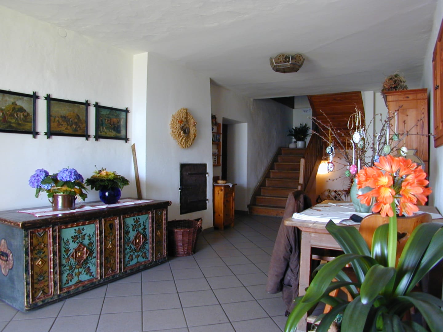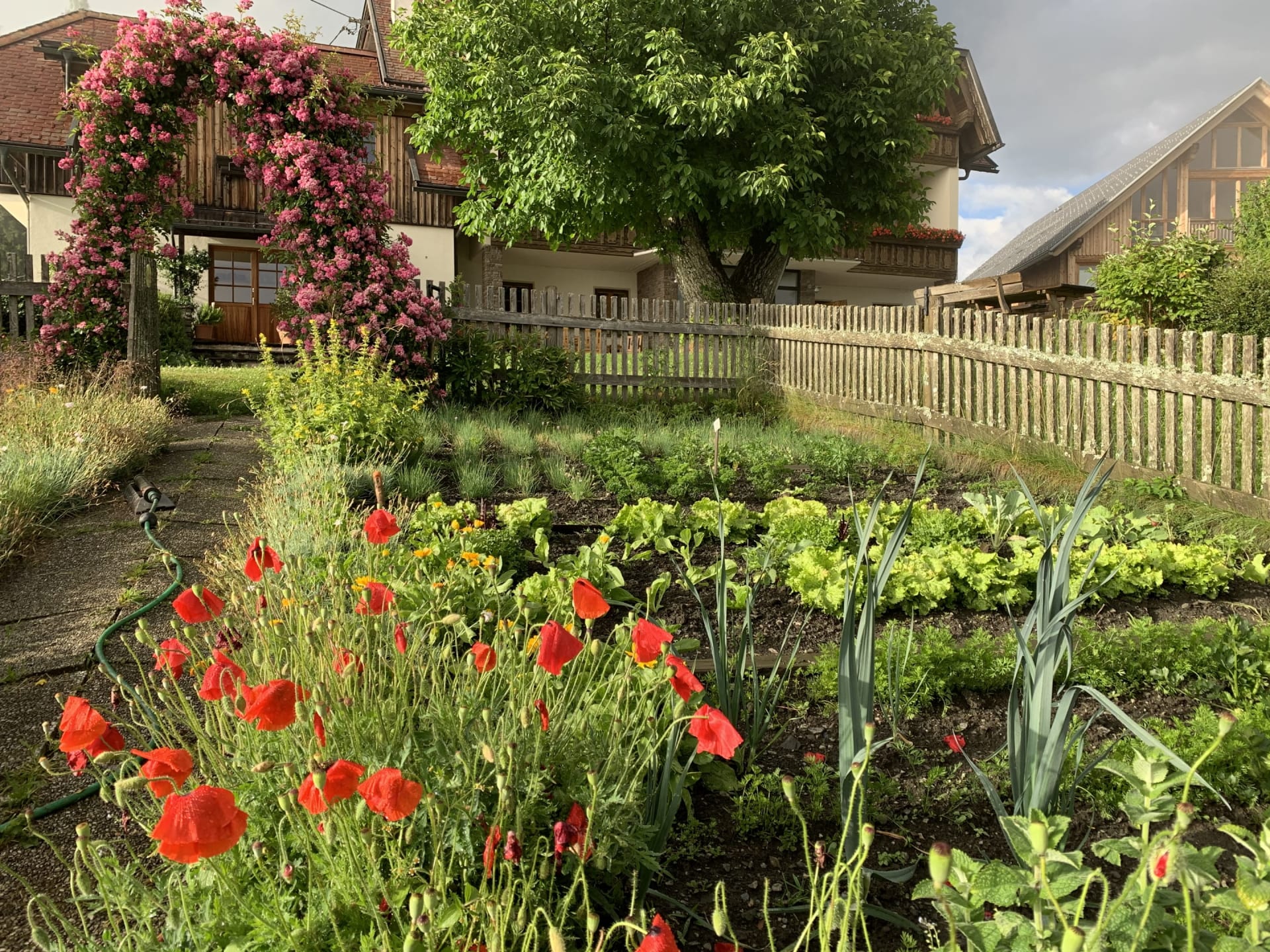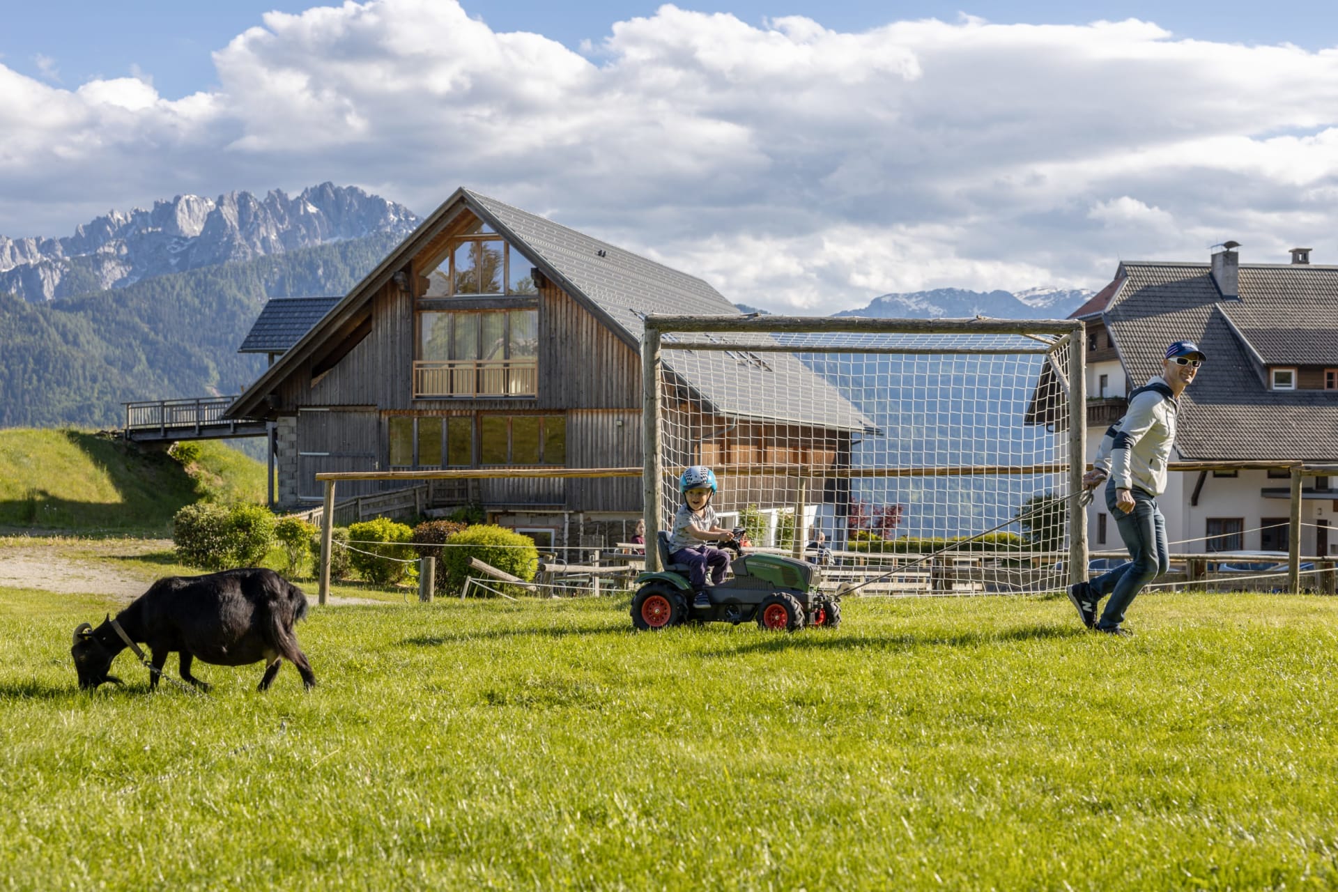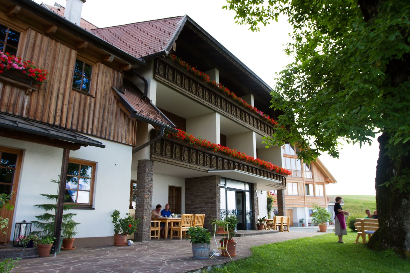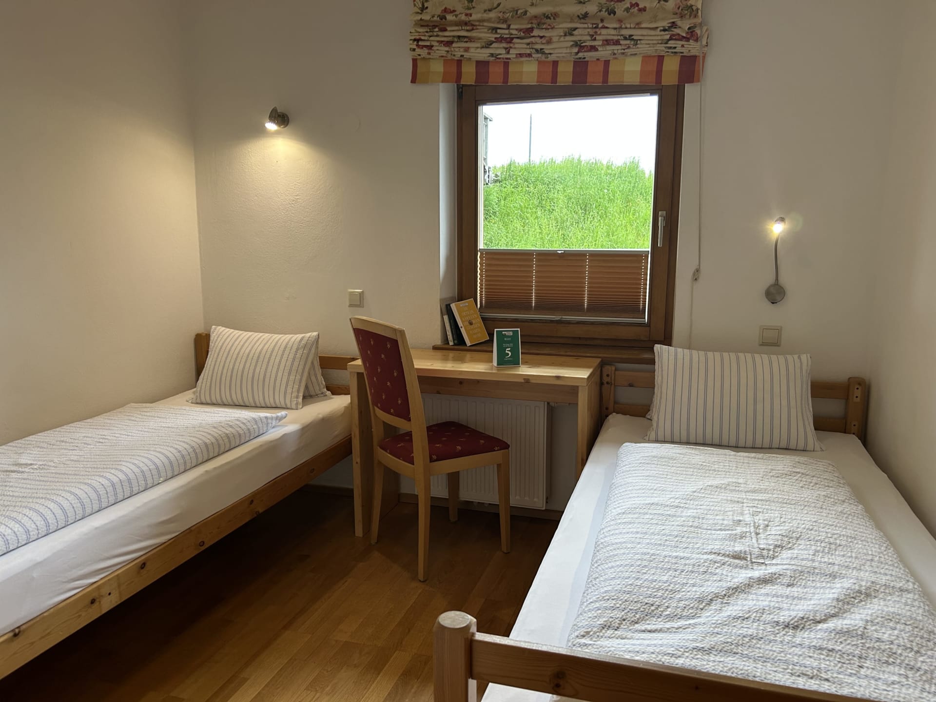 Ihre Oase mit Bergblick: Geräumige Ferienwohnung (59 m²) Willkommen in Ihrer großzügigen und hellen Ferienwohnung im 2. Stock unseres Haupthauses, eine perfekte Wahl für Familien und Freunde. Hier erwartet Sie ein Zuhause auf Zeit, das keine Wünsche offenlässt. Treten Sie hinaus auf Ihren weitläufigen Süd- und Westbalkon und lassen Sie sich von der atemberaubenden Aussicht auf die majestätische Berglandschaft verzaubern. Ein Wäscheständer ist für Ihre Bequemlichkeit am Balkon vorhanden, damit Sie die frische Bergluft nutzen können. Der einladende Wohn- und Essbereich, ausgestattet mit stilvollen Naturholzböden, bildet den gemütlichen Mittelpunkt der Wohnung. Die separate, komplett ausgestattete Küche lässt keine kulinarischen Wünsche offen. Sie verfügt über ein modernes 4-Platten-Cerankochfeld, Kühlschrank, Geschirrspüler, Mikrowellenherd, Wasserkocher, Filter-Kaffeemaschine, Toaster sowie eine umfassende Auswahl an Koch- und Essgeschirr, Geschirrtüchern und Schneidbrettern. Perfekt, um gemeinsame Mahlzeiten zuzubereiten und diese dann auf dem Balkon mit Panoramablick zu genießen. Zwei separate Schlafzimmer garantieren erholsamen Schlaf für alle Gäste. Das Hauptschlafzimmer lockt mit einem luxuriösen Boxspringbett (Kingsize-Format), während das Kinderzimmer mit zwei komfortablen Einzelbetten ausgestattet ist. Hochwertige Bettwäsche und flauschige Handtücher liegen selbstverständlich für Sie bereit. Das moderne Badezimmer überzeugt mit einer begehbaren Dusche, einem Föhn und einem praktischen Kosmetikspiegel. Das WC ist separat angelegt. Auf Wunsch stellen wir Ihnen gerne eine passende Kleinkindausstattung (inklusive Kinderbett) zur Verfügung. Für Ihre Unterhaltung und Kommunikation sorgen ein Sat-TV, kostenloses WLAN . Ihre Wertsachen können Sie sicher im vorhandenen Safe verwahren. Ein kostenloser Parkplatz direkt am Haus rundet das Angebot ab. Beginnen Sie Ihren Tag entspannt mit unserem praktischen Brötchenservice.