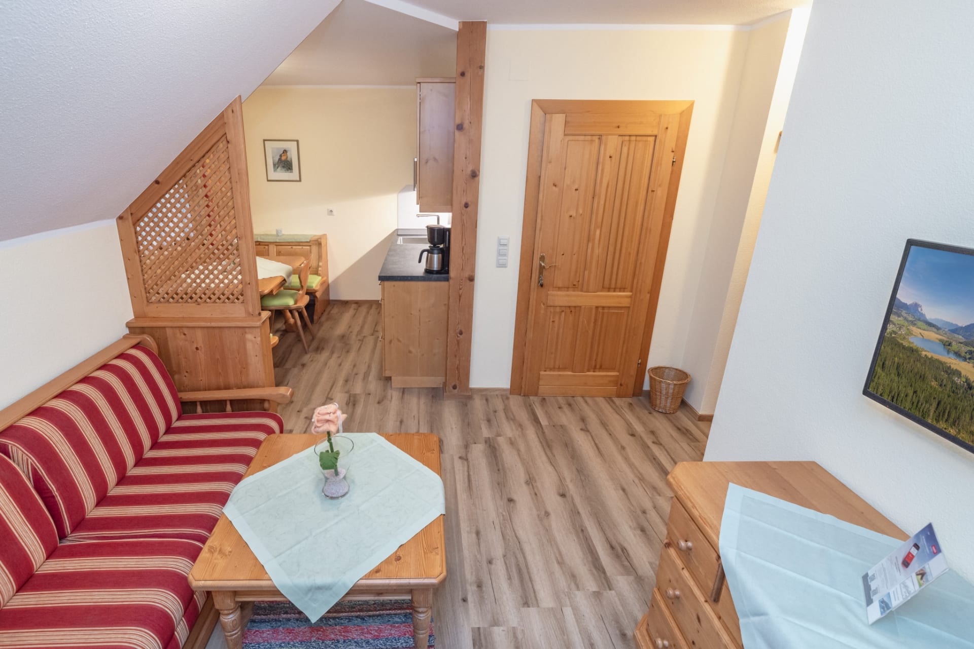 Die Fewo IV ist für max. 5 Personen, auch mit Vollholzmöbel liebevoll eingerichtet 2 getrennte Schlafzimmer, voll ausgestattete Wohnküche, Flachbildfernseher im Schlafzimmer und in der Wohnküche, Du- WC getrennt und ein Vorraum. Am Balkon der nach Westen zeigt können Sie die Abendsonne genießen