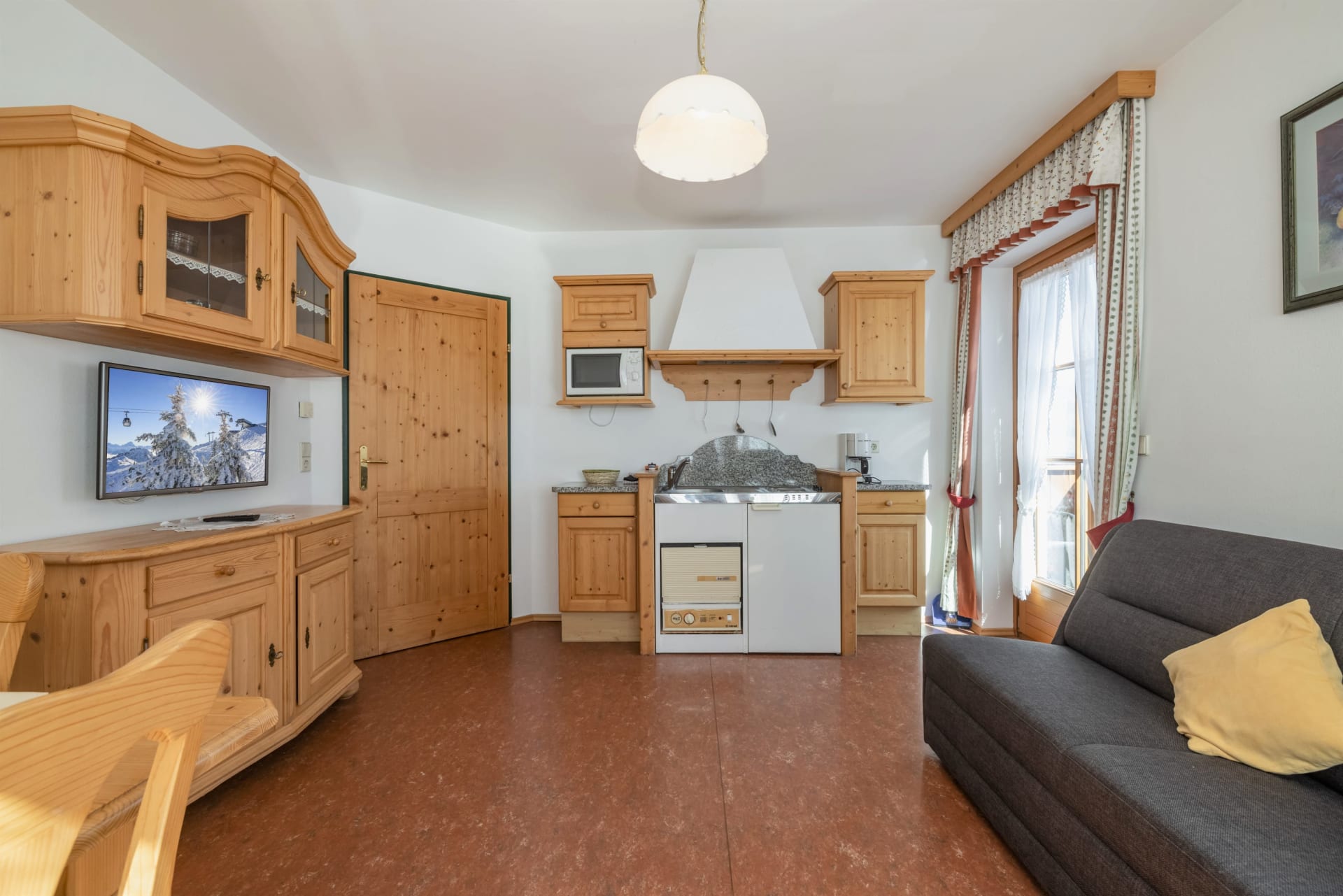 für 2-4 Personen, ca. 40-45 m², Vorraum, Schlafzimmer, Küche mit ausziehbarer Couch (150x200, auf dem bis zu 2 Kinder schlafen können), Ess- und Sitzecke, Dusche, getrenntes WC, Haartrockner, 2x Sat-TV, Safe und Balkon