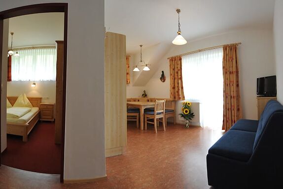 für 2-4 Personen, ca. 35 m², Schlafzimmer, Küche mit ausziehbarer Couch (150x200, auf der 2 Kinder schlafen können), Dusche/WC, Fön, Kosmetikspiegel, 2x Sat-TV, Safe und Balkon