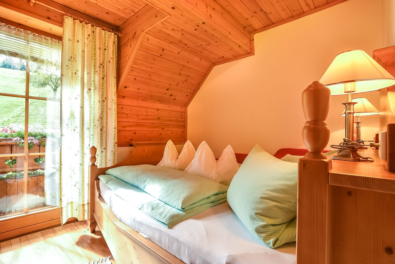 Die Wohnung Sonnenblume 55m² mit Blick zu den Ziegen auf die Bergwiesen und in den Hof.