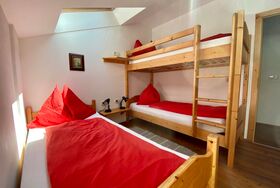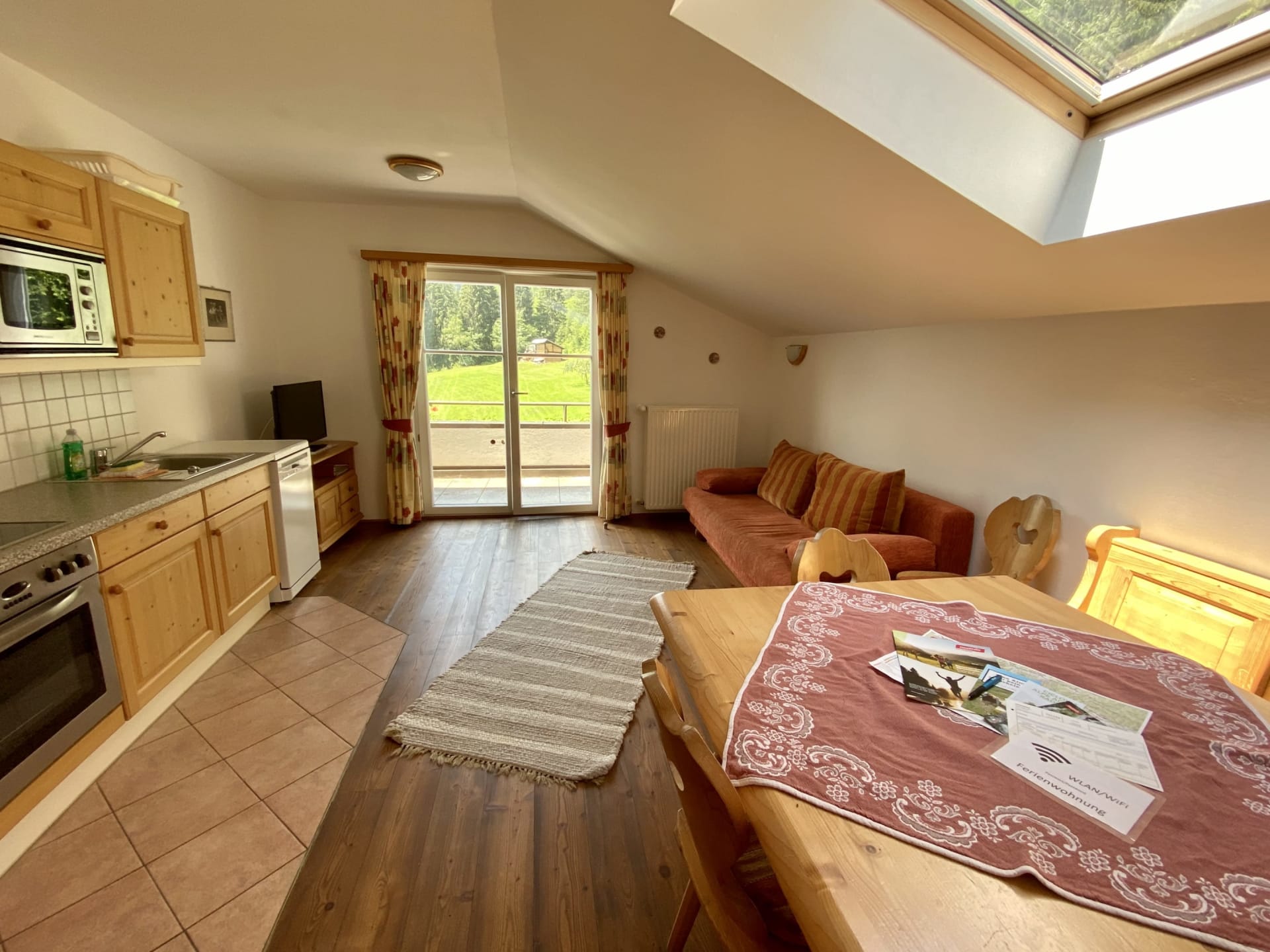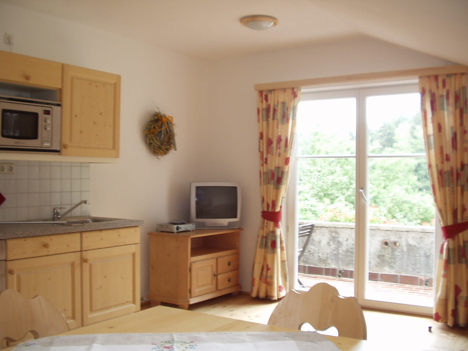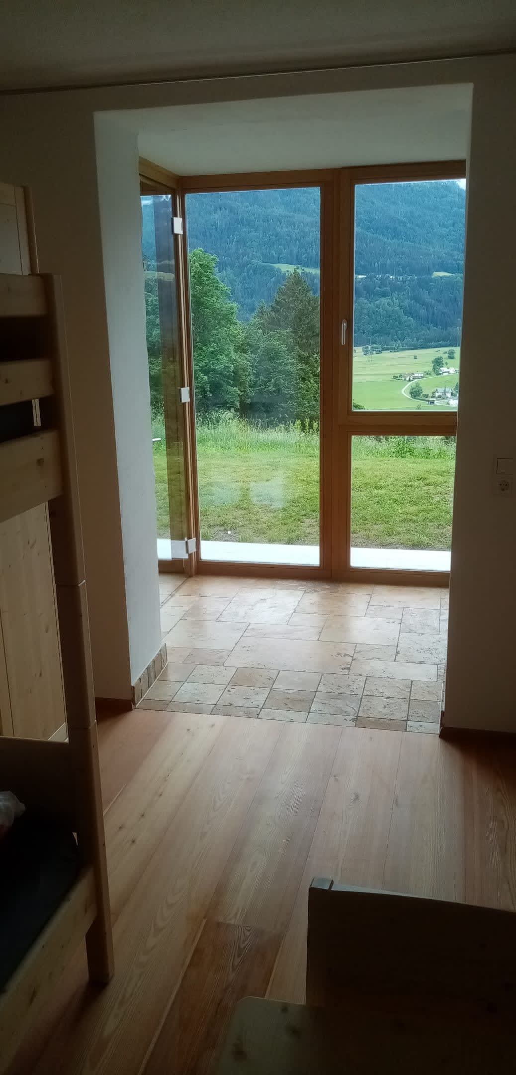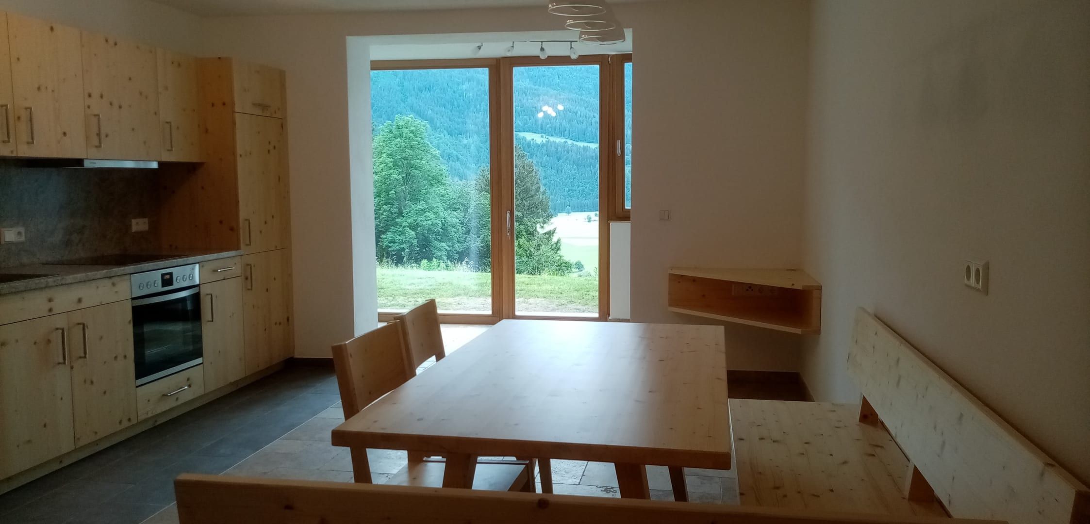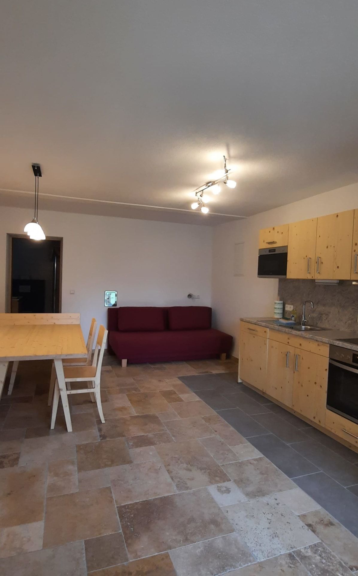 Geräumige, natürlich eingerichtete Ferienwohnung im 1. Stock. Eine große Wohnküche mit Terrasse, zwei Schlafzimmer, WC - Bad separat; großer Vorraum