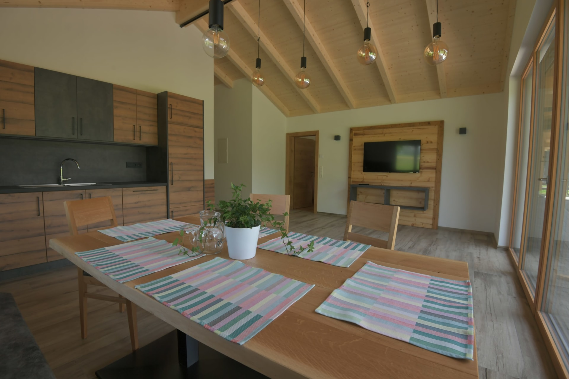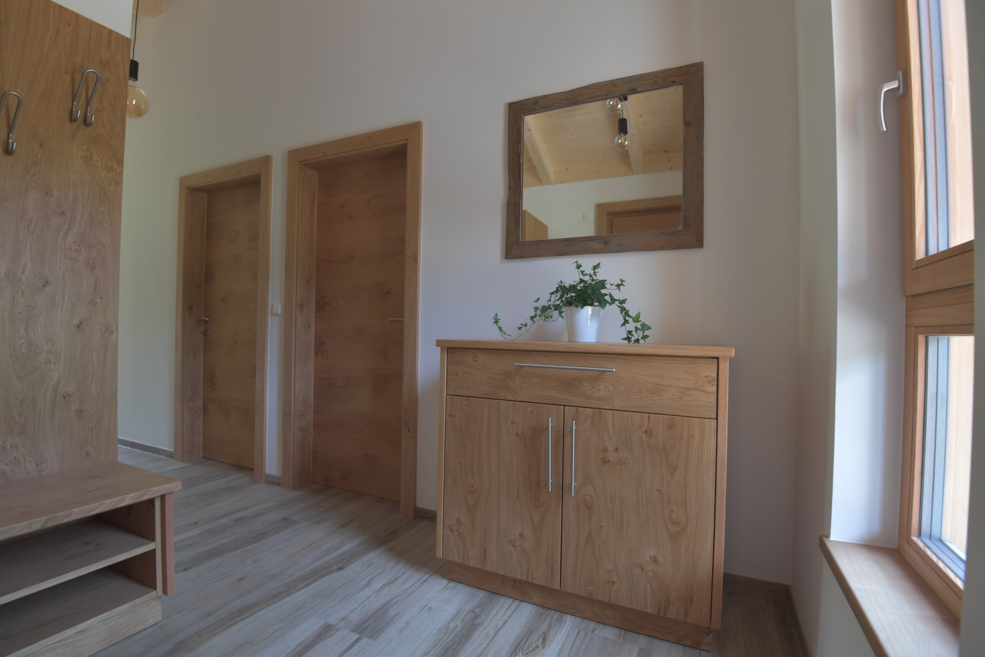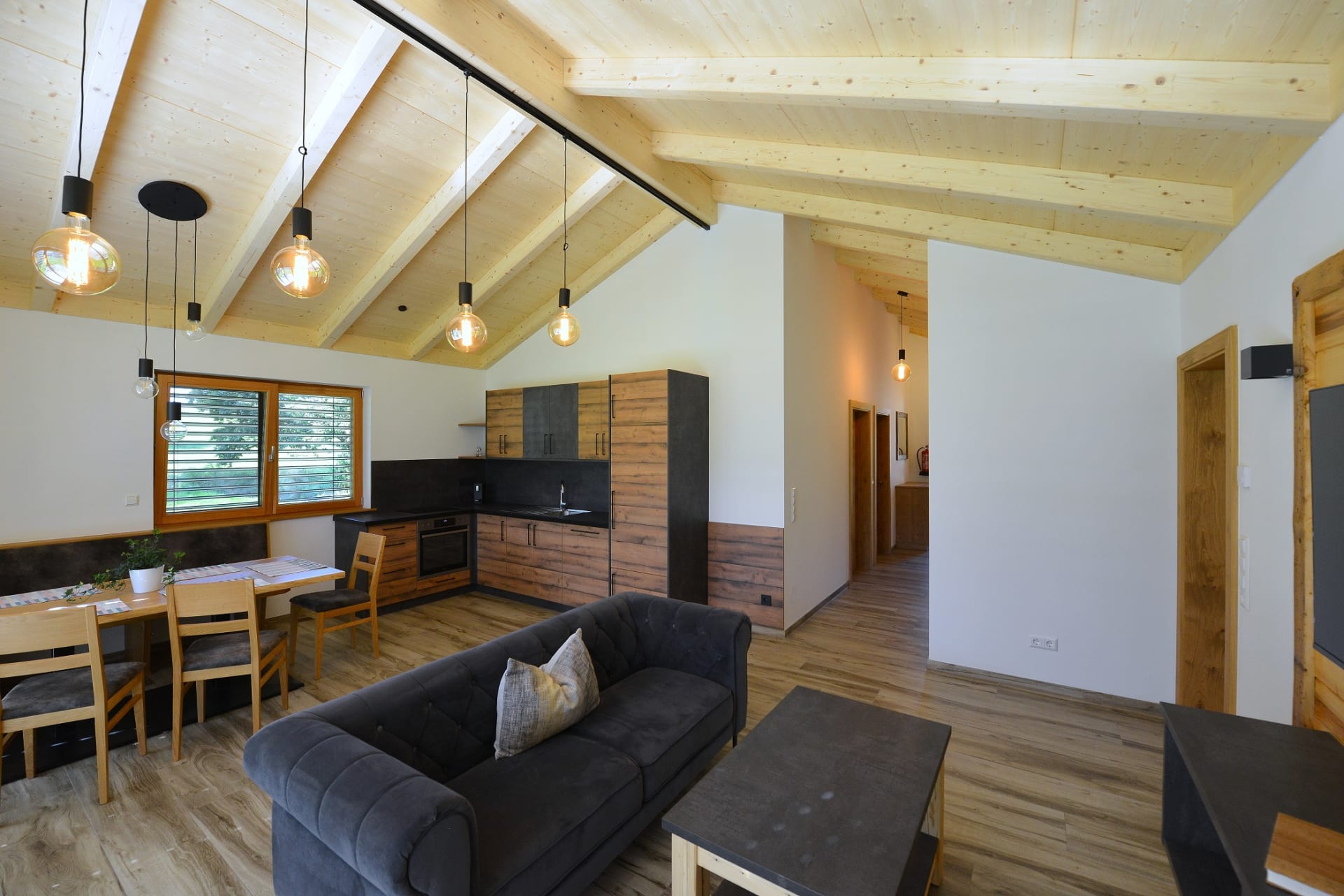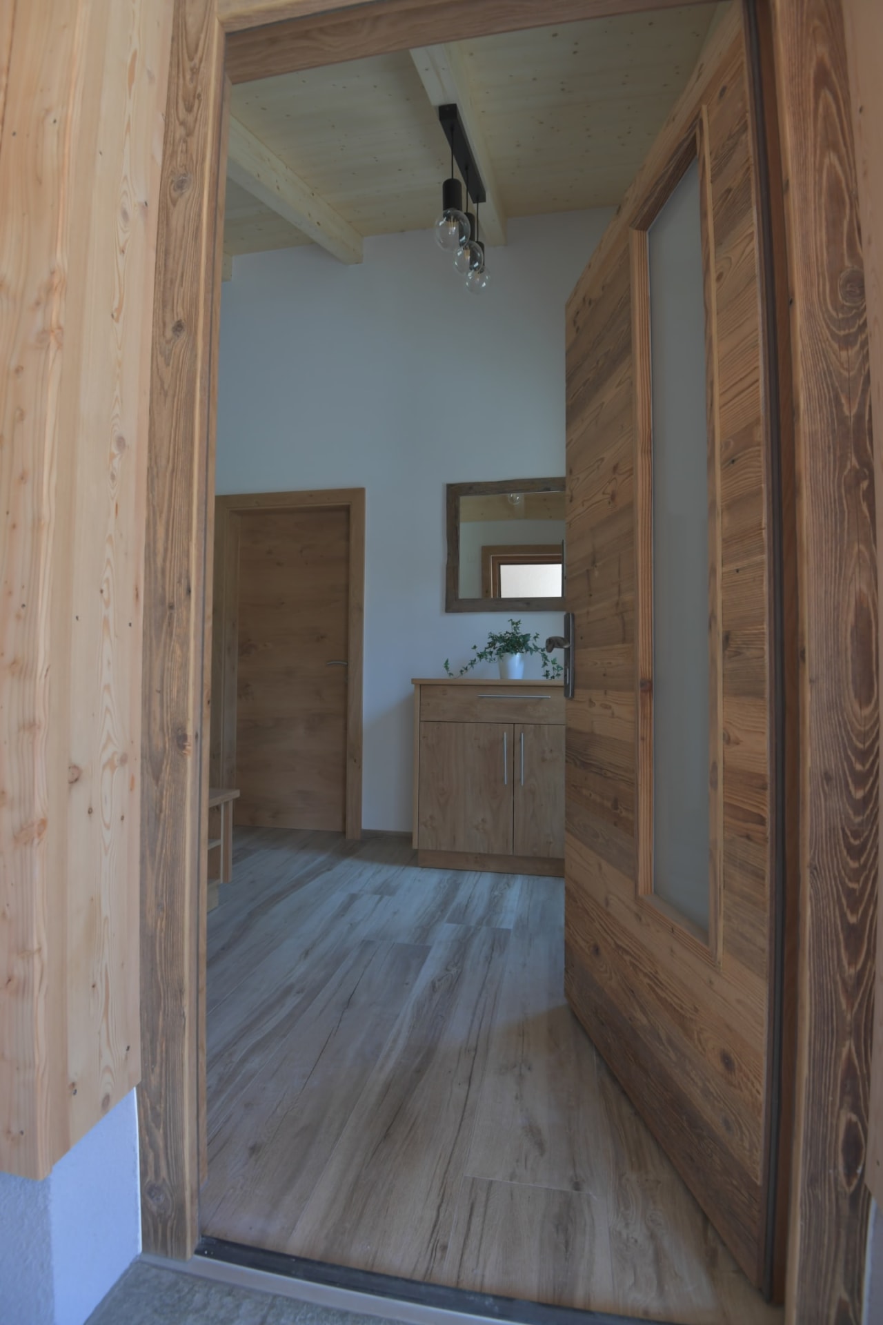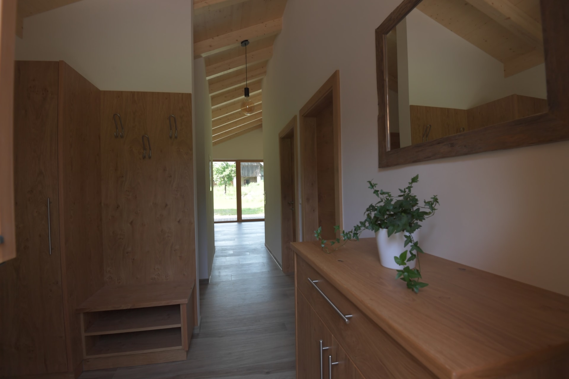 Das sieht man schon, wenn man eintritt in dieses herrliche Anwesen, das eingebettet zwischen Wiesen, Obstbäumen, Wald und Bergen, mitten im wunderschönen, naturbelassenen Gitschtal liegt. Neu und nach höchsten ökologischen Standards errichtet präsentiert sich das Ferienhaus Strohschneider. Buchbar sind zwei idente Wohneinheiten mit jeweils rund 85 Quadratmetern, bei denen wir dank der Holzriegelbauweise die Natur ins Haus geholt haben. Der Baustoff Holz vermittelt einem sofort dieses wohlige Gefühl von Geborgenheit. Man genießt es im Sommer und Winter aufgrund der angenehmen Temperatur und Luftfeuchtigkeit. Und man riecht es, denn der unvergleichliche Geruch von Holz lässt einen automatisch runterkommen und entspannen.
