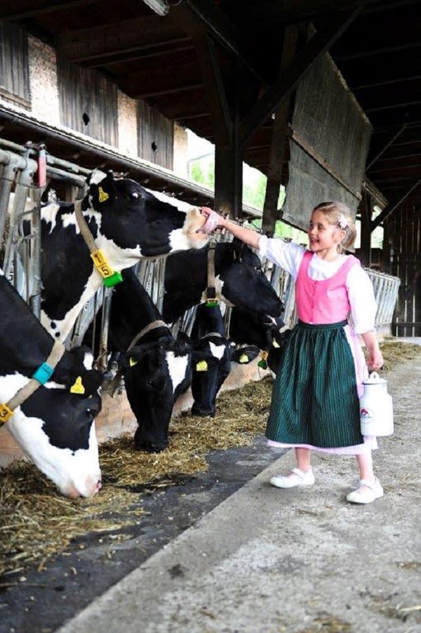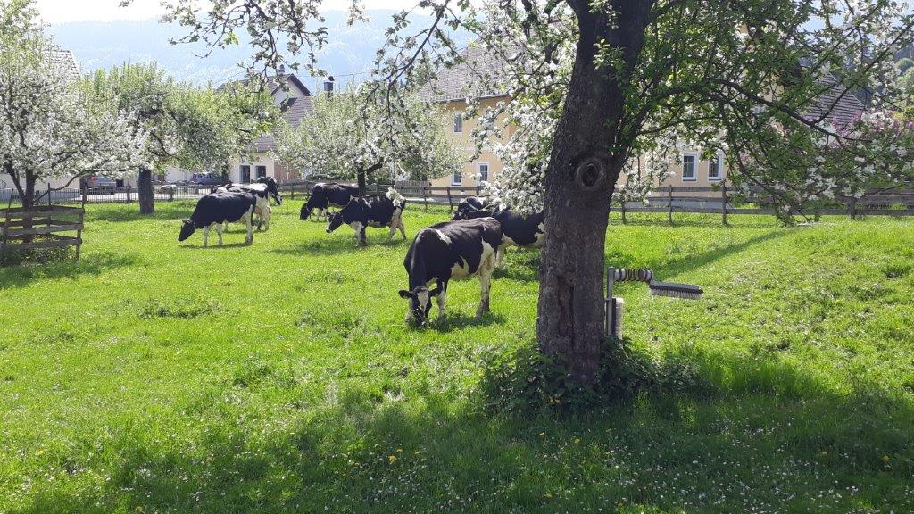 In unmittelbarer Nähe allerdings ist ehrlich gesagt die Zeit zum Entspannen kostbar. Hier in unserem 300 Jahre alten Bauernhaus ist das Leben bunt und abwechslungsreich. Sonja und Christian Steinwender bewirtschaften den Hof gemeinsam und auch die drei Kinder Max, Leo und Ilvy helfen schon fleißig mit. Schließlich gilt es jeden Tag neben den 30 Milchkühen, Kälbern und Jungtieren – die dürfen sich entweder auf der Weide bewegen oder in dem mit viel Stroh eingestreuten Flächen im Stall schlafen legen - auch noch die drei Katzen Mandilo, Tiger und Minzi, unseren Hund Bessy sowie unsere Hühner zu versorgen.