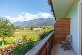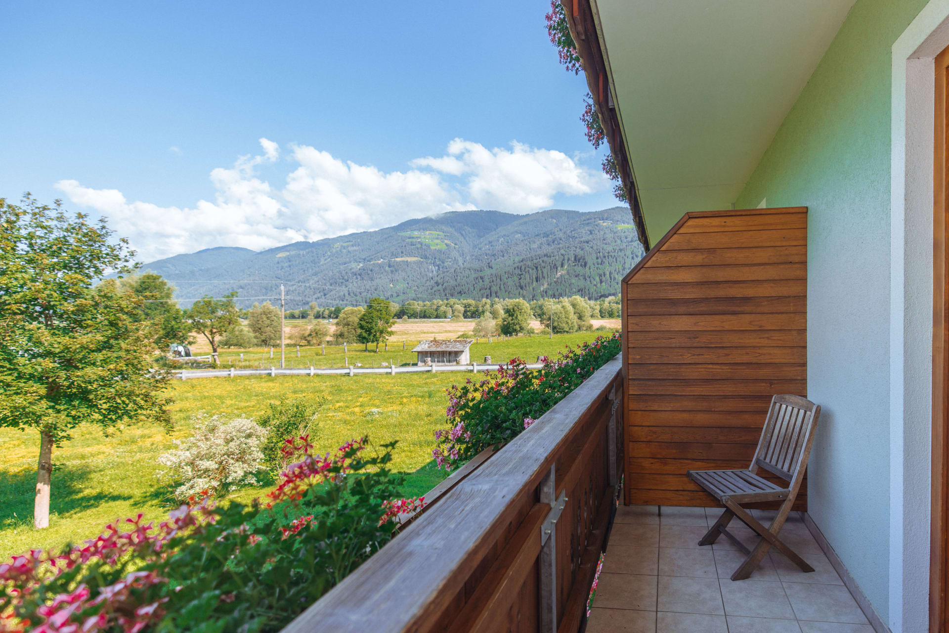 Doppelzimmer + Balkon westseitig mit Blick durch das breite Gailtal bis zu den Lienzer Dolomiten, Bad mit Kosmetikspiegel, Kosmetikartikel und Haarföhn, WC separat, Safe, Minibar, Sat-TV.