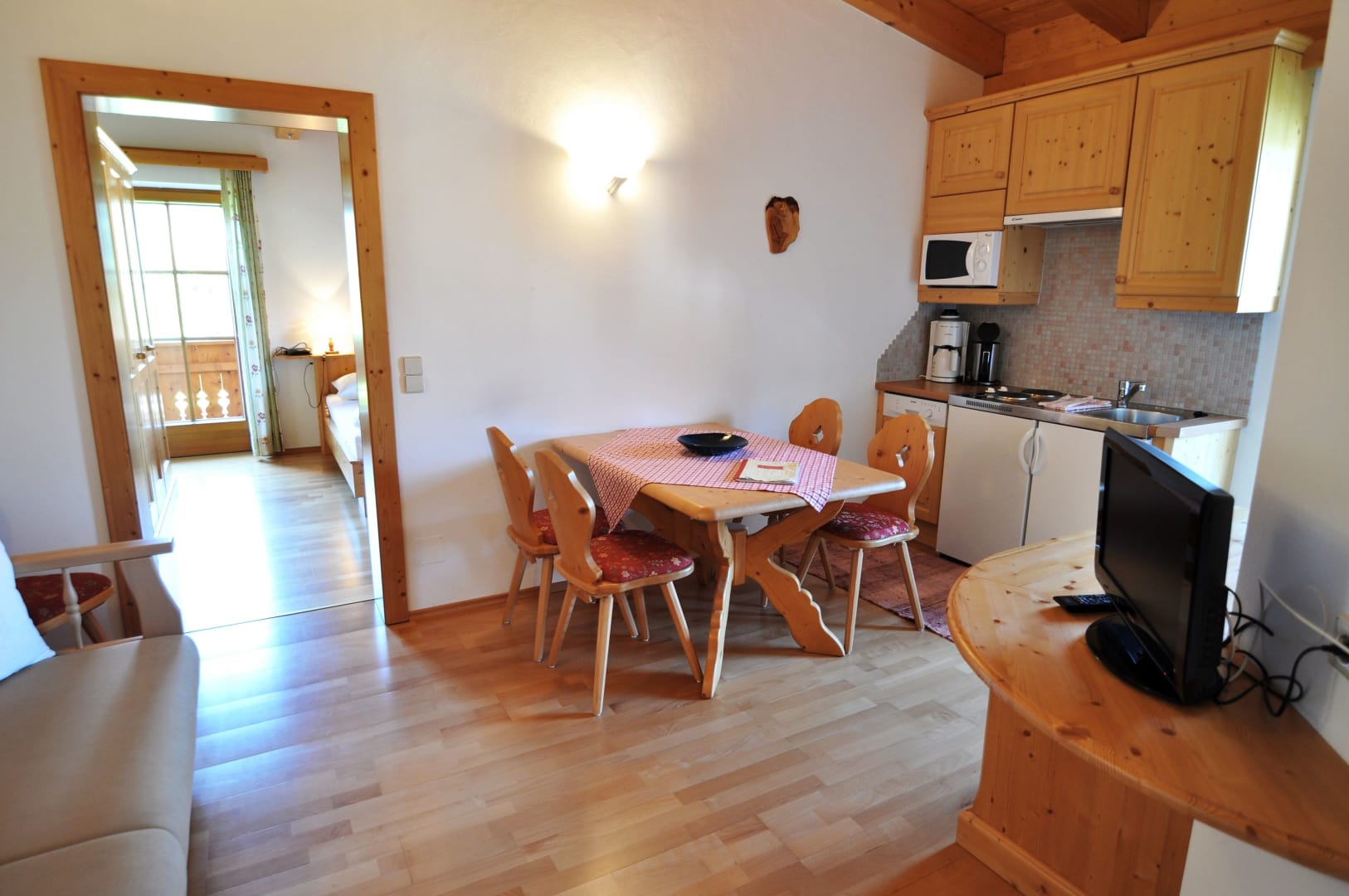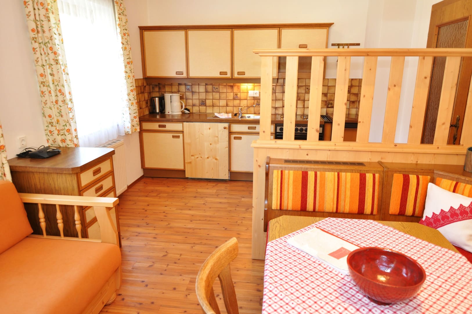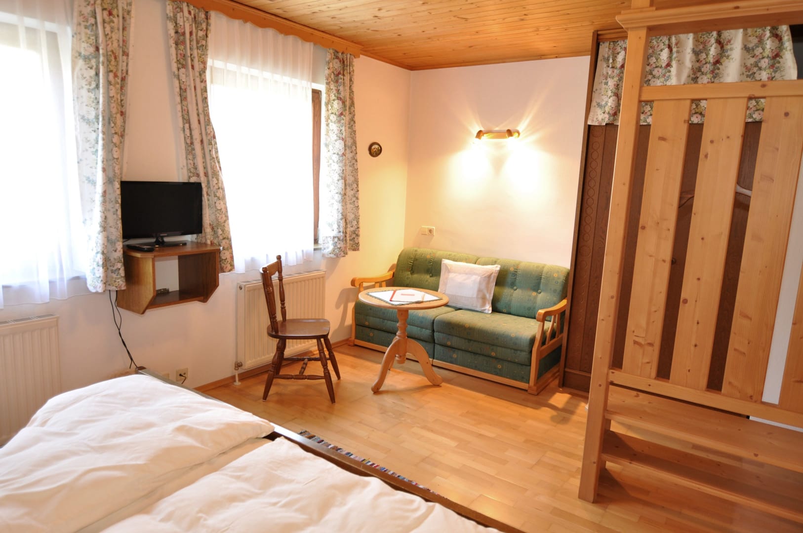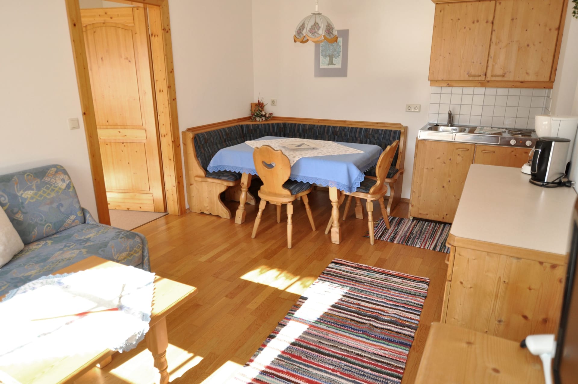 Ferienwohnung mit Balkon westseitig mit Blick durch das breite Gailtal bis zu den Lienzer Dolomiten, 1 Schlafzimmer, separat 1 Wohnzimmer mit Doppel-Liegesofa, kleine Küche, Herd mit Backofen, Geschirrspüler, Kaffeemaschine, Wasserkocher, Bad mit Kosmetikspiegel, Kosmetikartikel und Haarföhn, WC, Vorraum, Safe, Sat-TV.