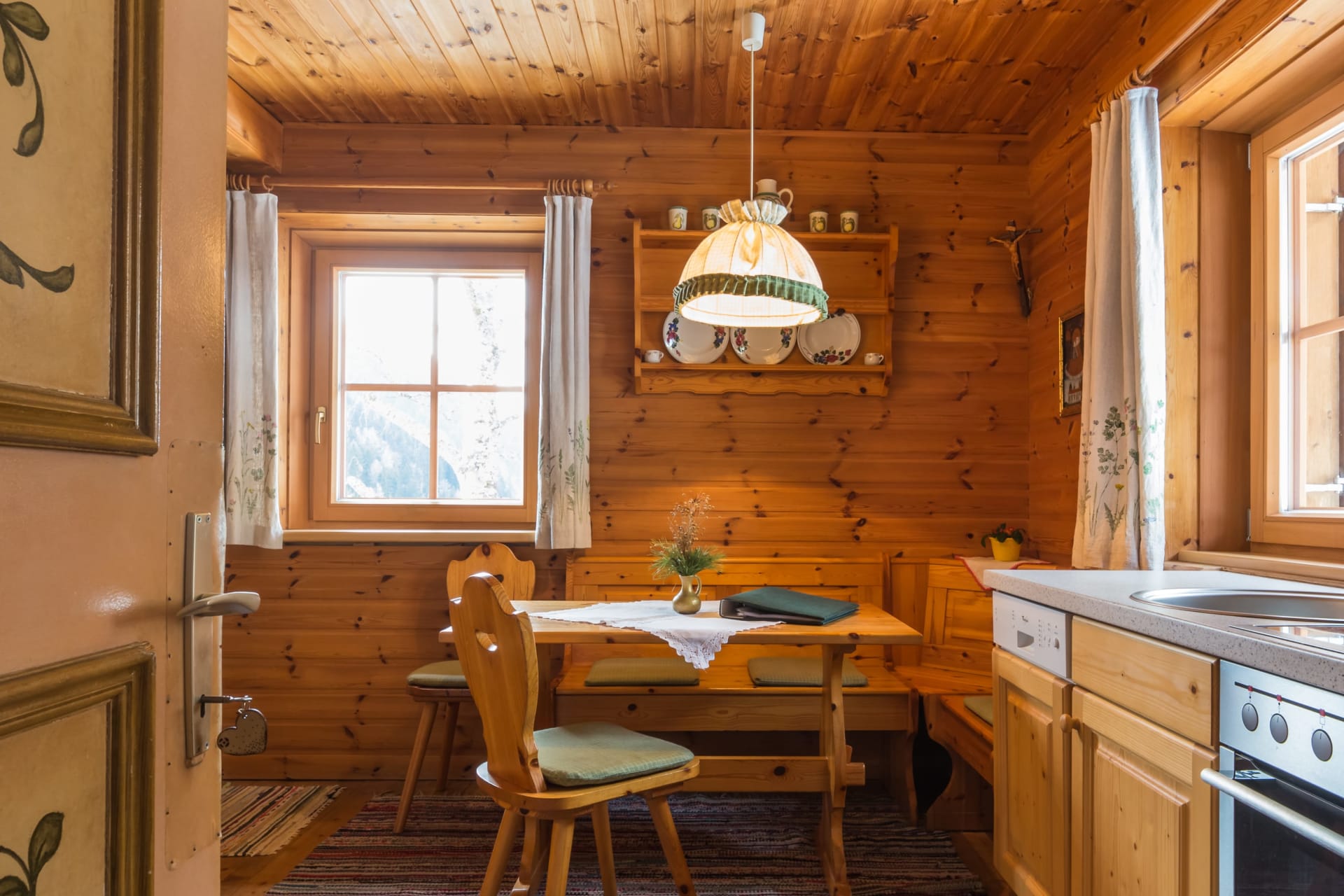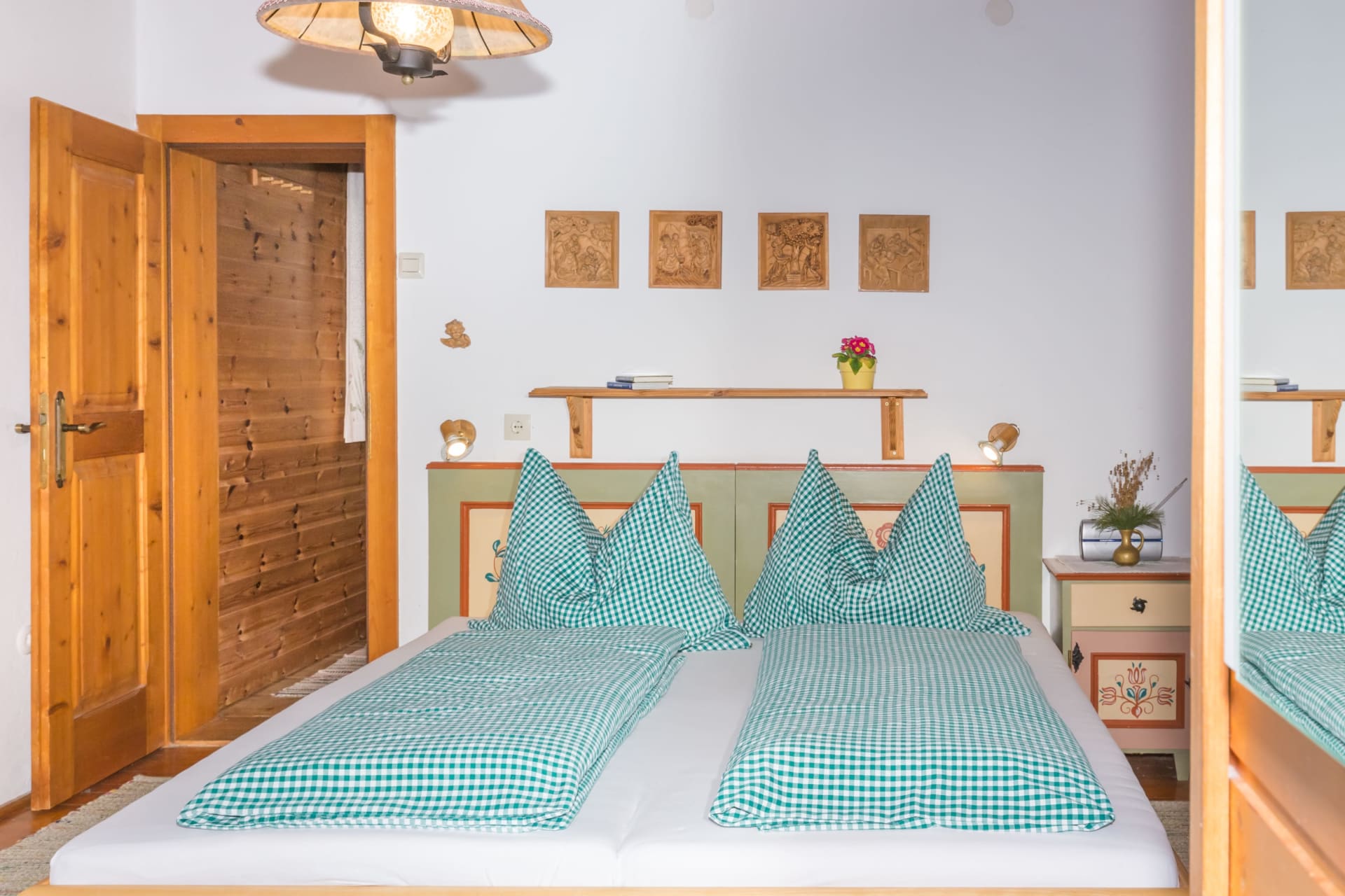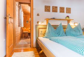 Im ersten Stock des Stammhauses - gemütliche Wohnküche mit Geschirrspüler, durch eine Tür verbundenes Doppelbettschlafzimmer mit Dusche/WC, Südbalkon mit herrlicher Aussicht. In der Wohnküche ausziehbare Einzel- oder Doppelcouch.