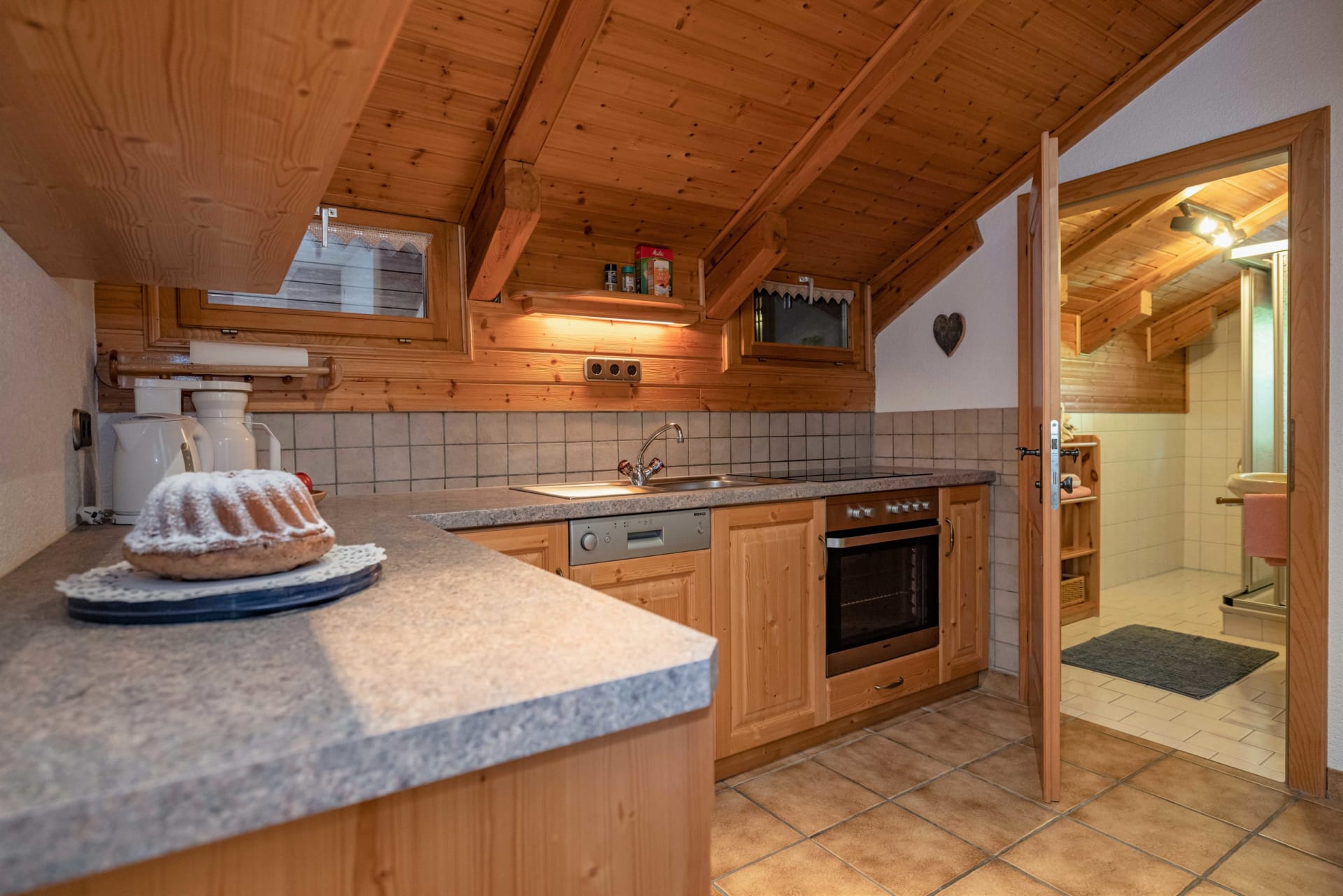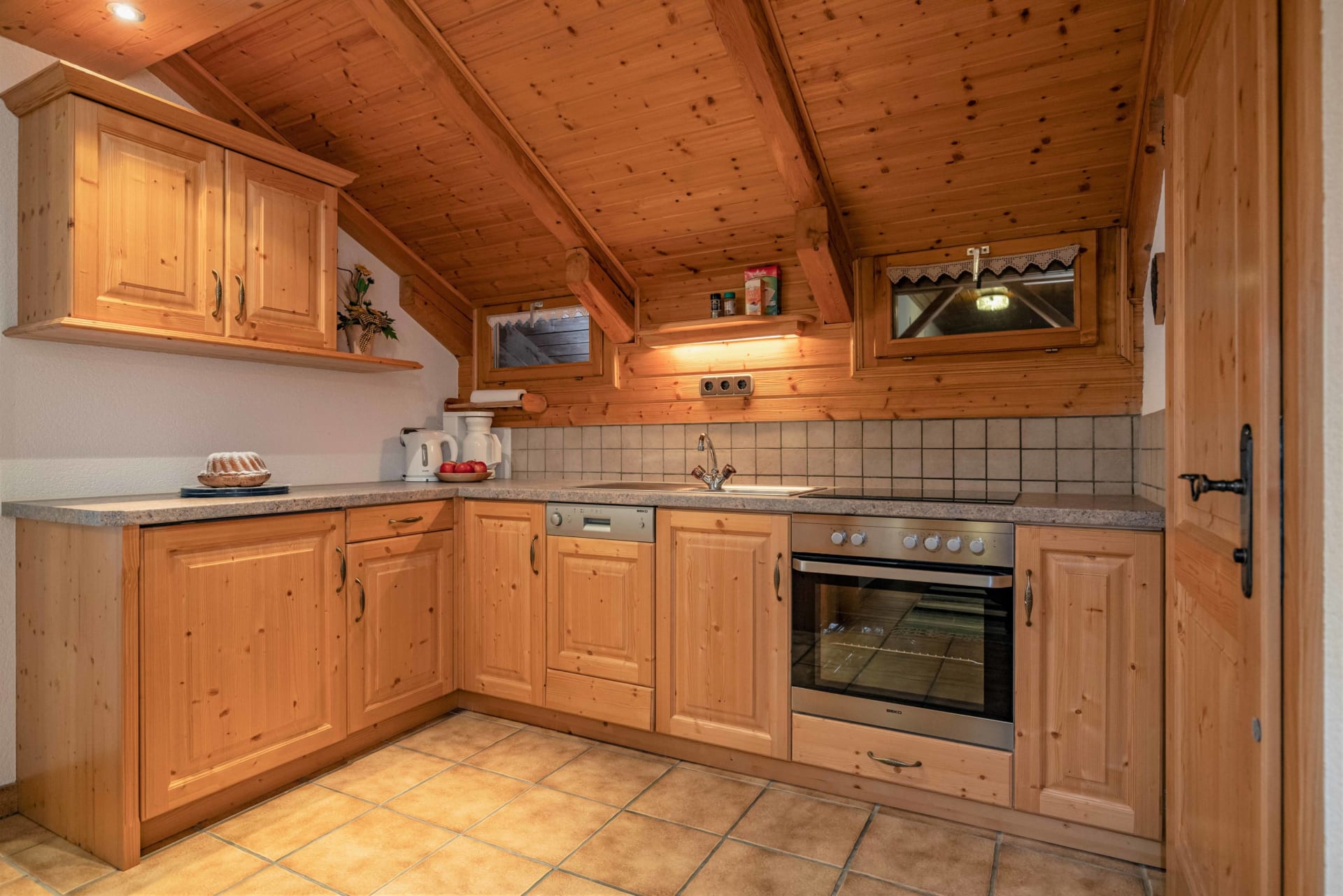 Kochnische komplett eingerichtet mit E-Herd und Backrohr, Kühlschrank, Geschirrspüler, Kaffeemaschine, Toaster, Wasserkocher