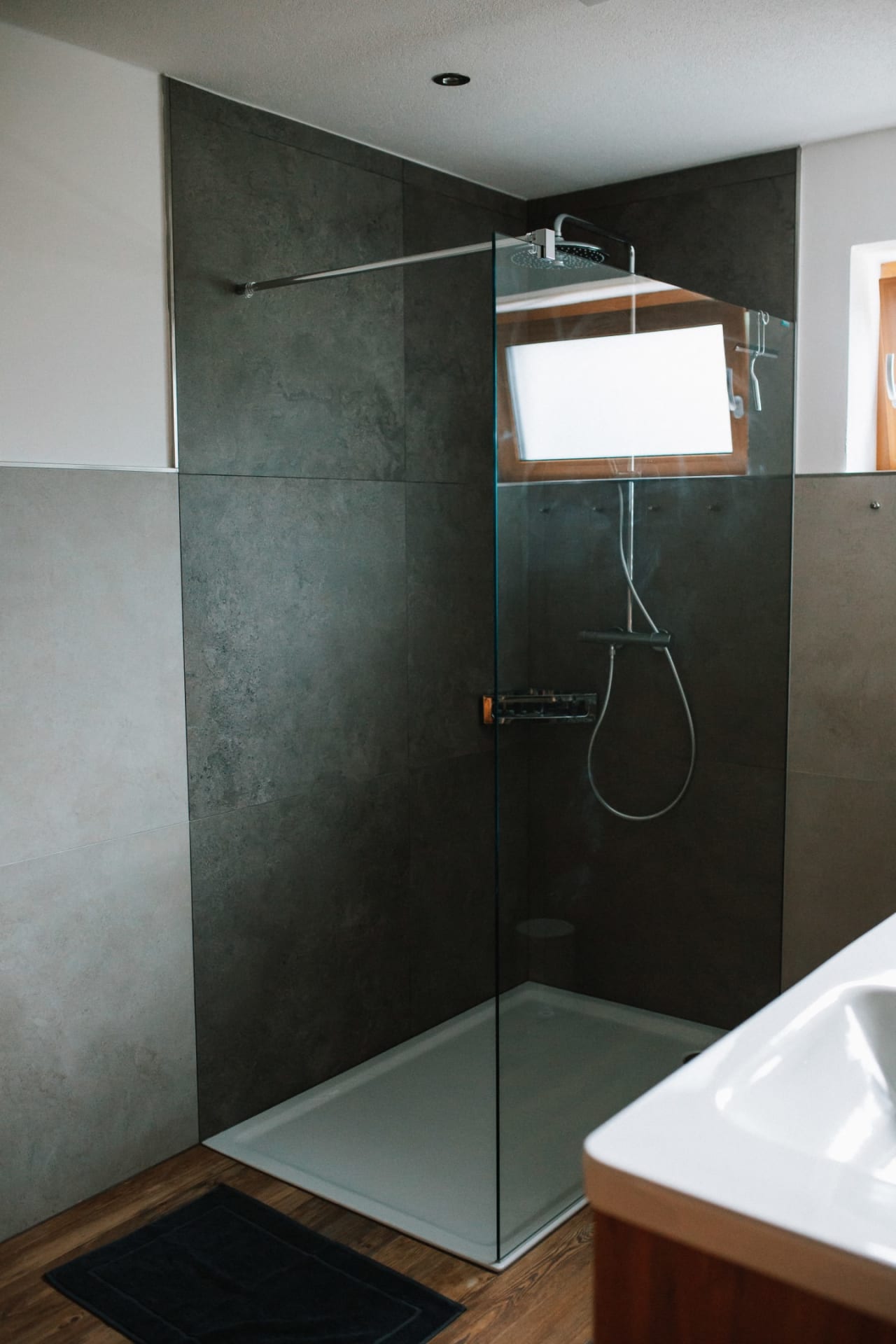 Große Terrasse mit wunderbarem Ausblick auf die umliegenden Wiesen, Wälder und Berge