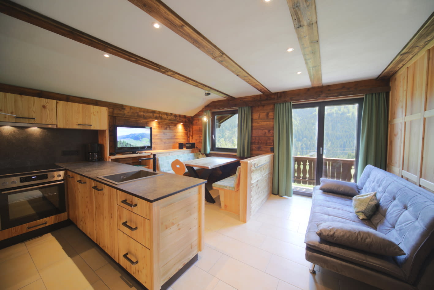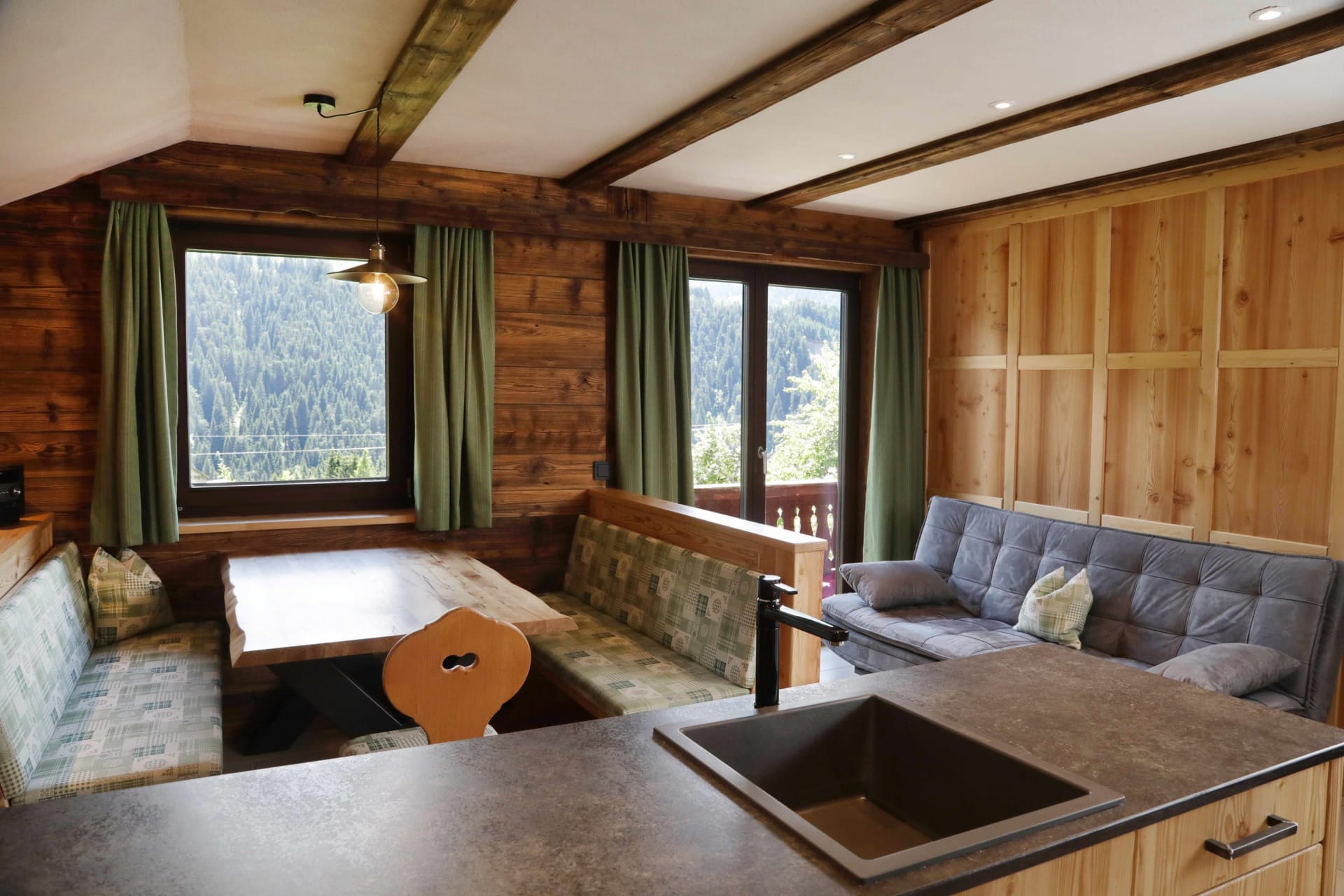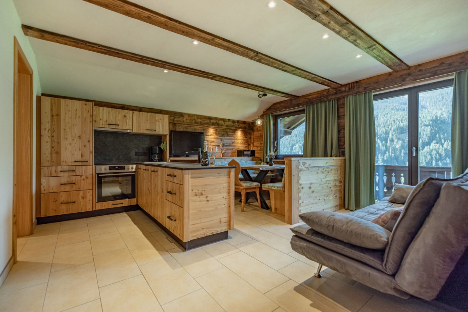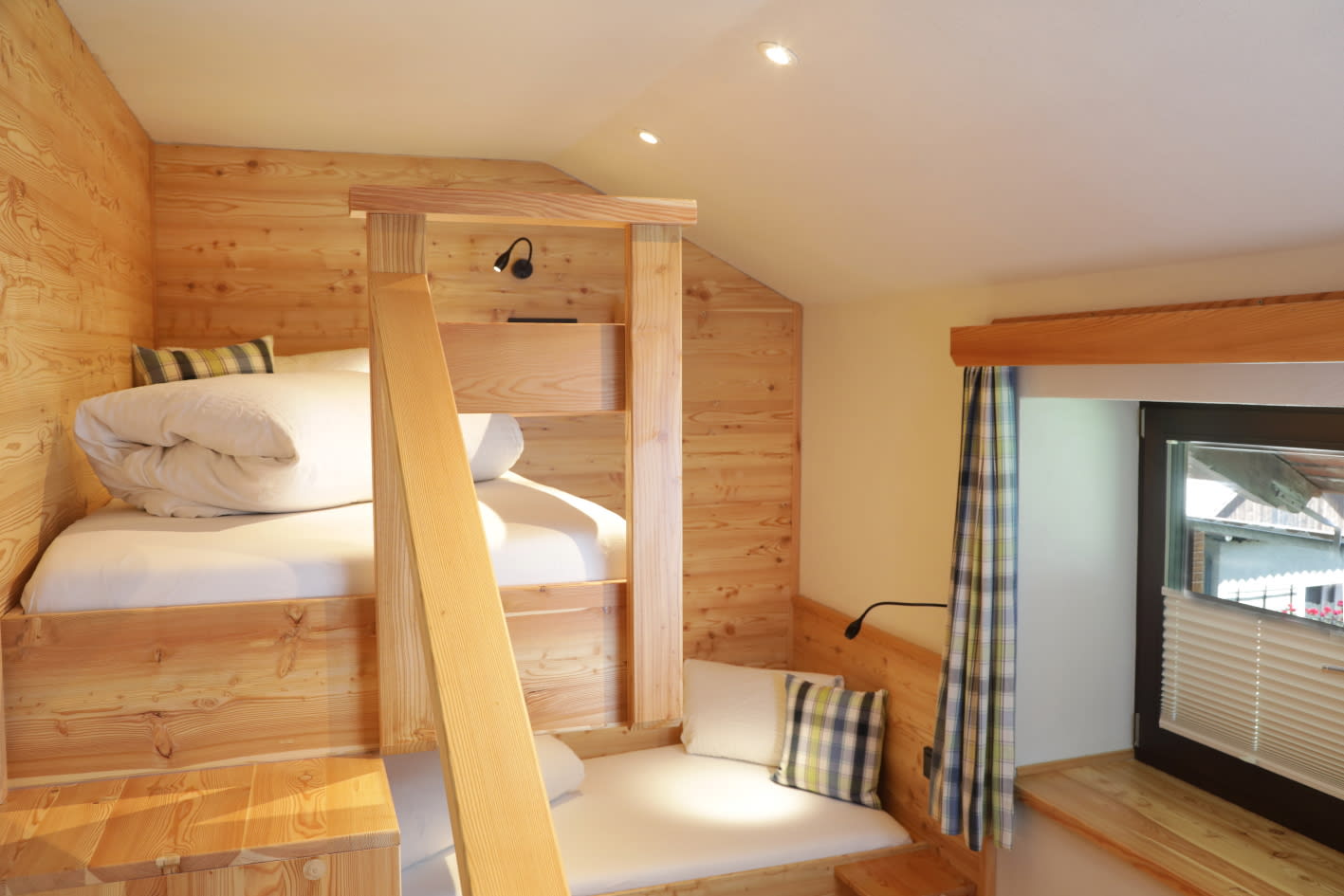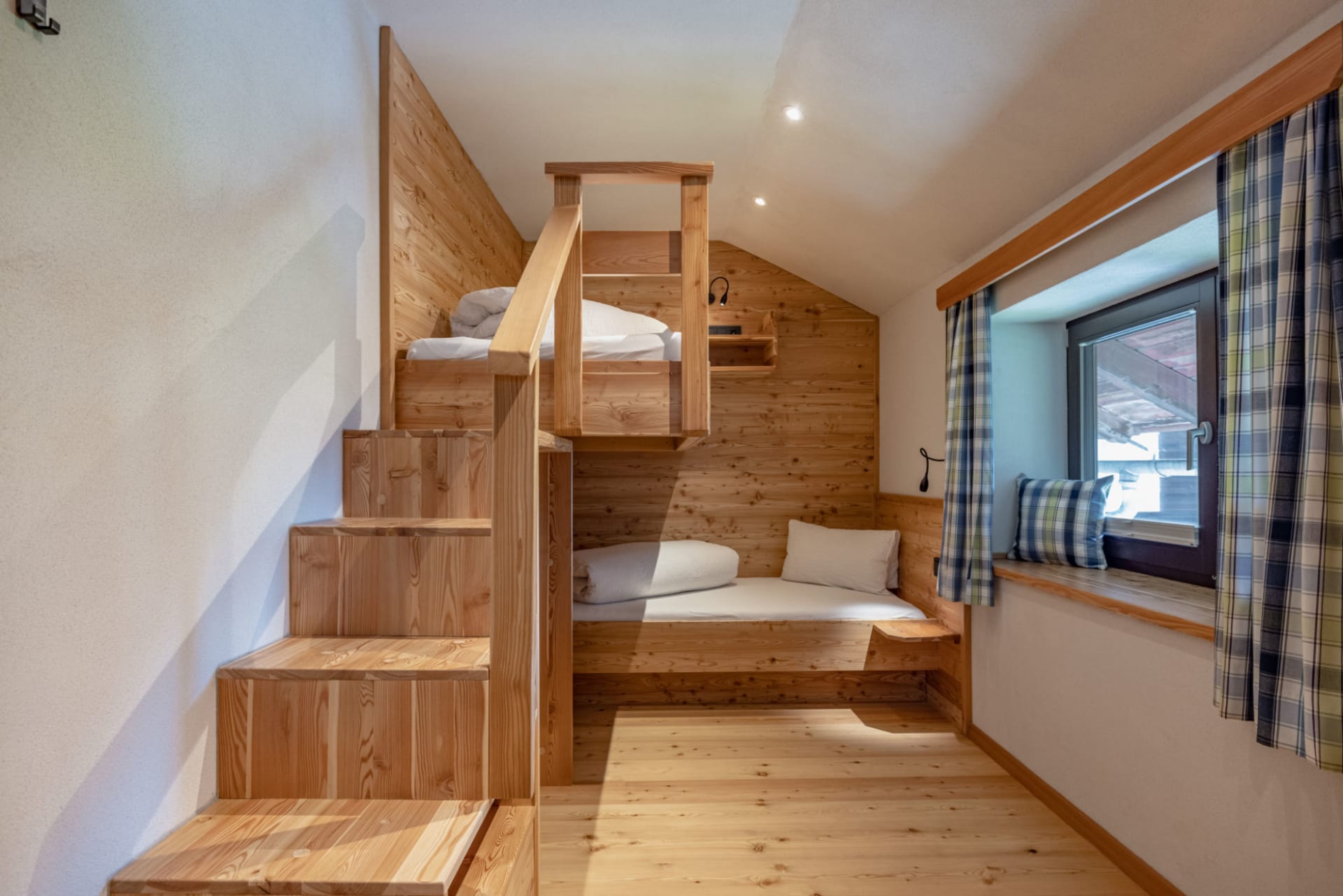 Die 50 m² große Suite „Lärche“ befindet sich im 2. Obergeschoss und bietet einen Balkon mit schönem Ausblick. Sie ist mit viel Liebe zum Detail in Lärchenholz gestaltet und kombiniert authentisches Altholz mit modernen Materialien, was eine besonders warme und stilvolle Atmosphäre schafft. Ideal für 2 bis 5 Personen, verfügt die Suite über zwei Schlafzimmer, darunter ein Kinderzimmer mit Hochbett, ein modernes Badezimmer mit Dusche und WC sowie eine separate Küche mit gemütlichem Wohnbereich.